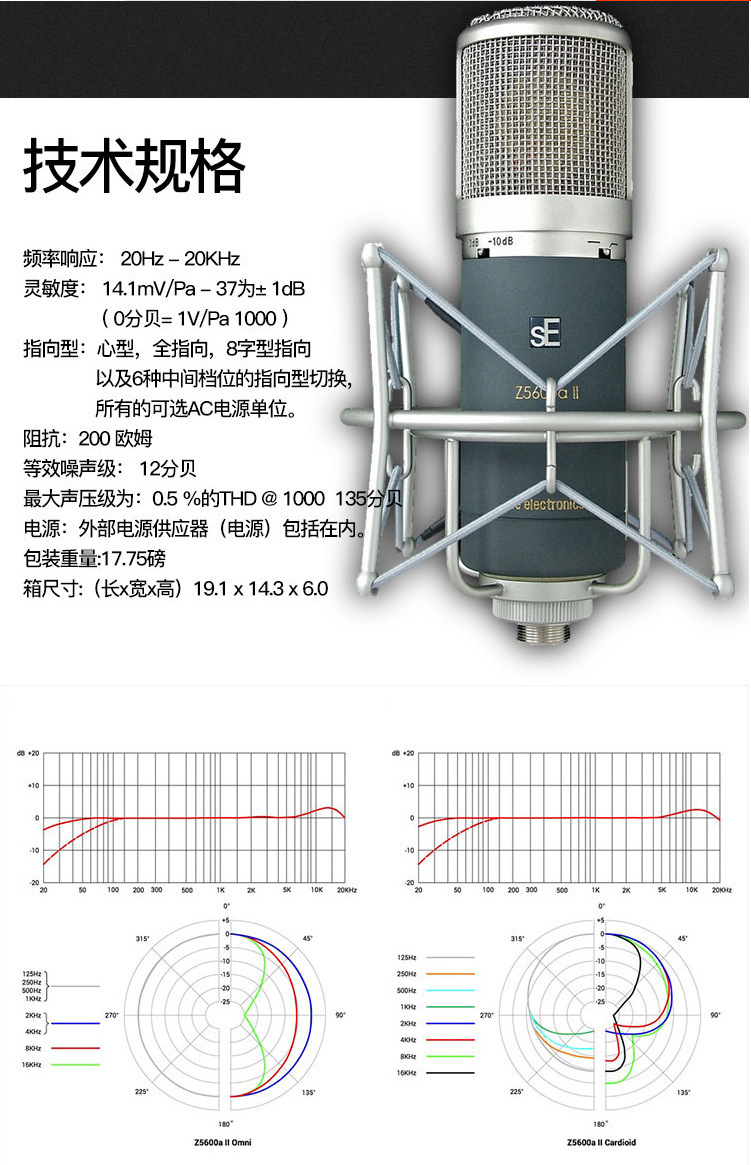 Z5600a II 是现今录音室万元麦克风中比较普及的一支,9段式的指向选择开关从全指向、心型到8字型,10dB的衰减开关与低频滤波器。Z5600a II 可以应用于各种场合如鼓组收音、合唱团收音..等