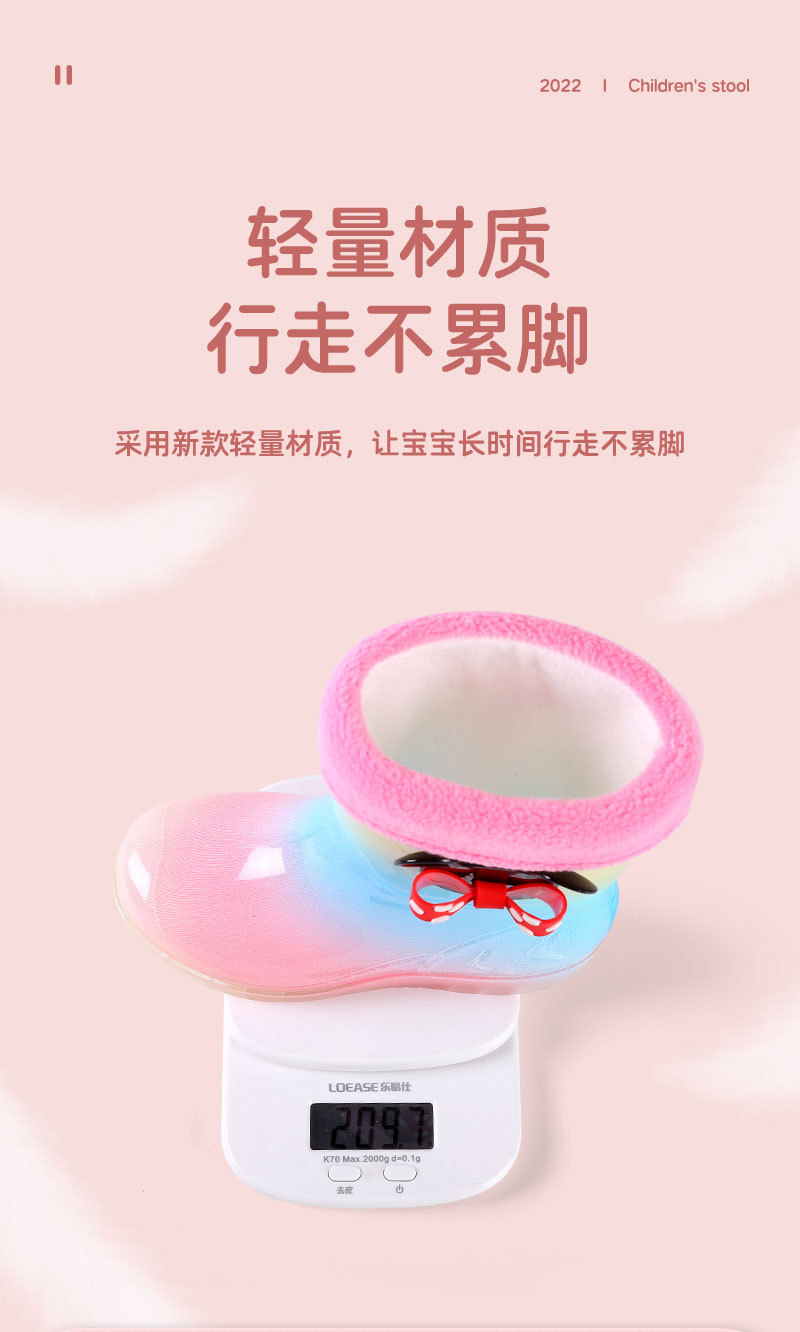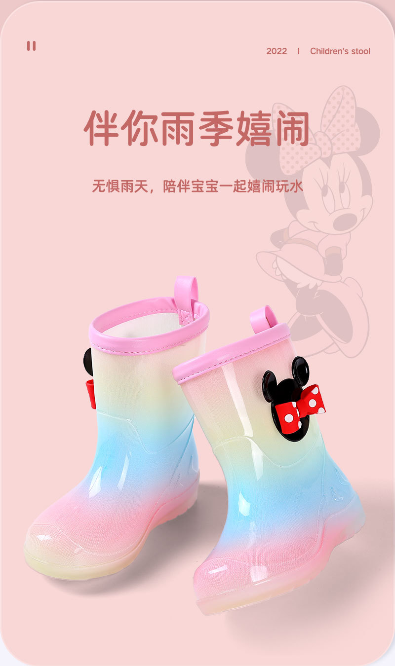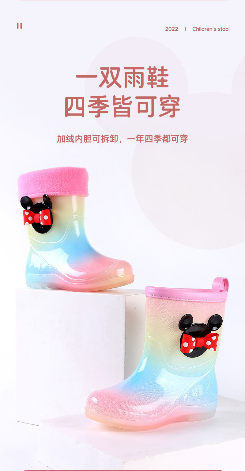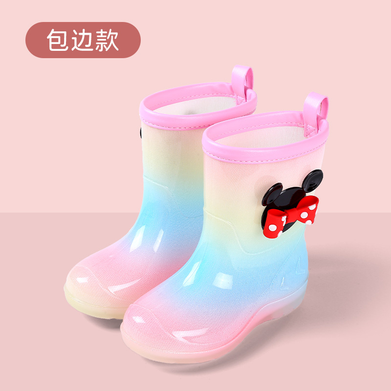 새로운 플라스틱 어린이용 방수 미끄럼 방지 레인보우 미키 마우스 중간 길이 레인부츠 크리스탈 플러스 벨벳 보온 그라데이션 색상 여아용스토어 가기