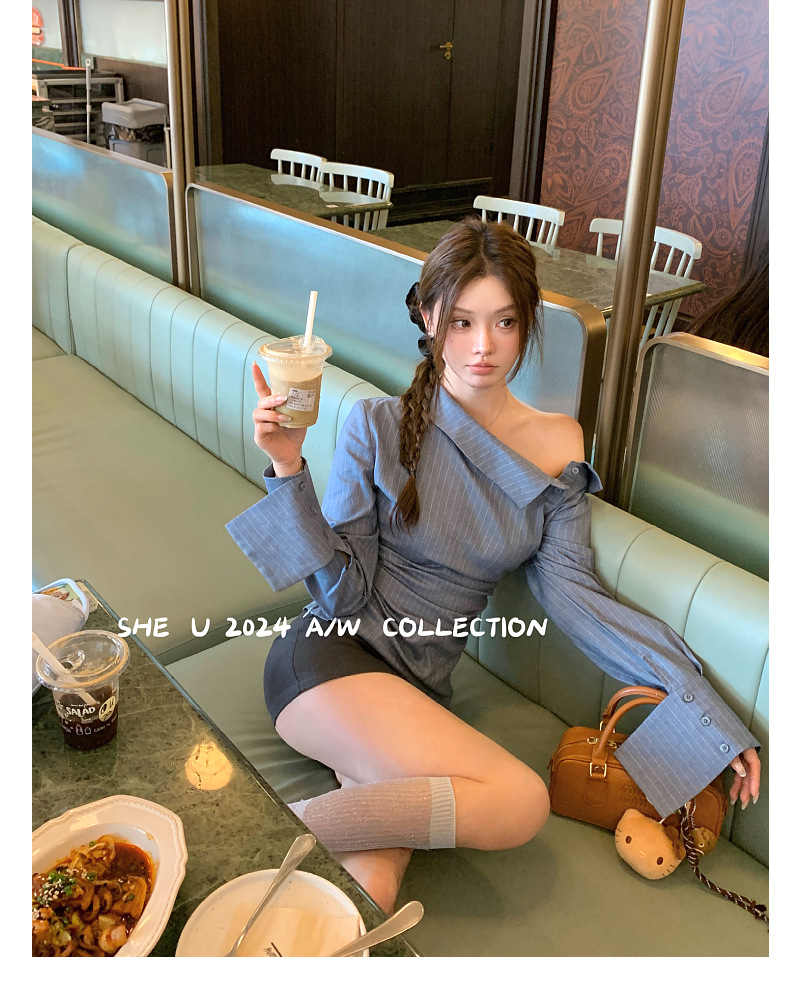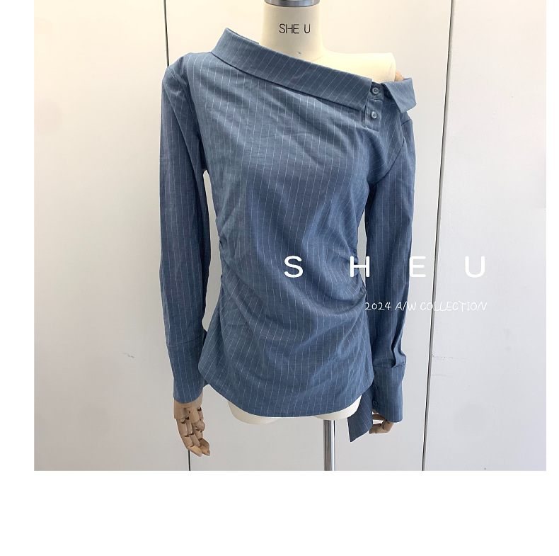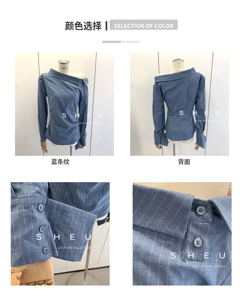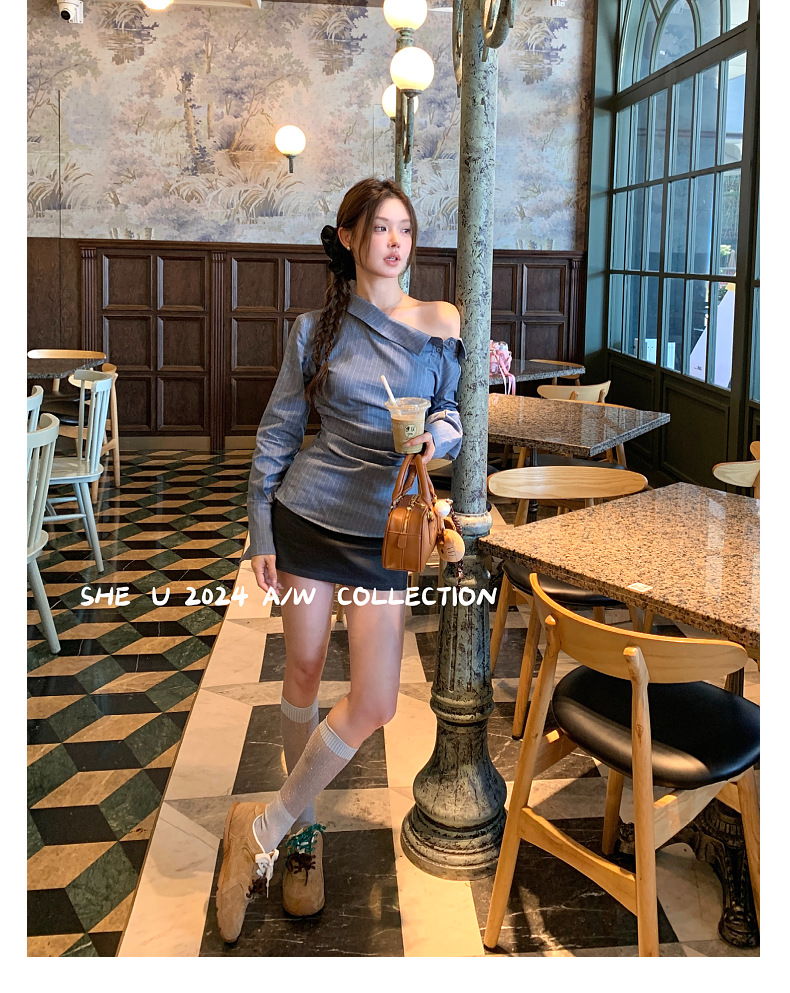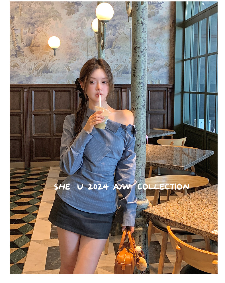 [재고] SHE U 틈새 디자인 비스듬한 어깨 줄무늬 셔츠 여성 2024 가을/겨울 한국 허리 어깨 탑스토어 가기