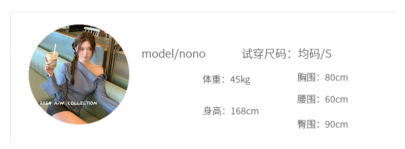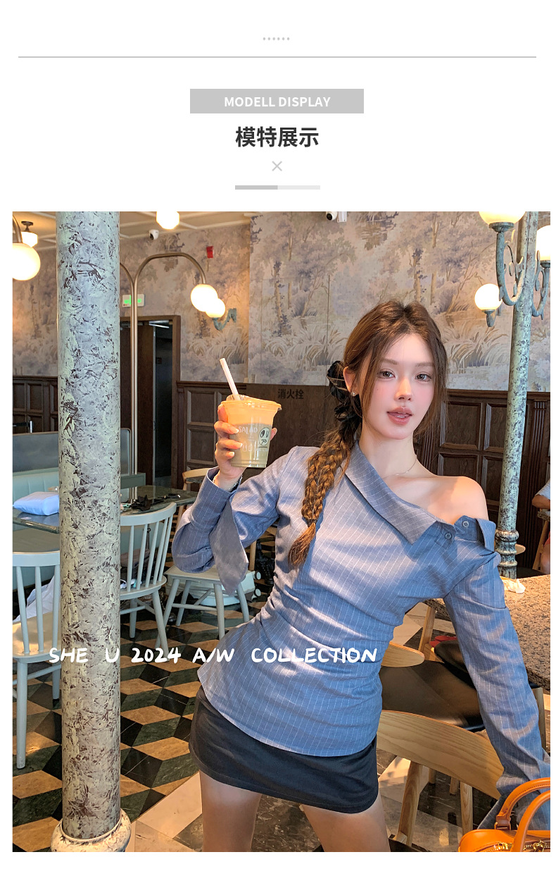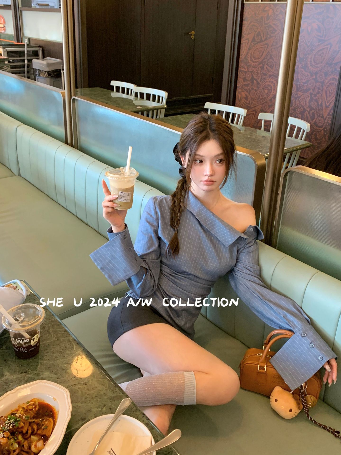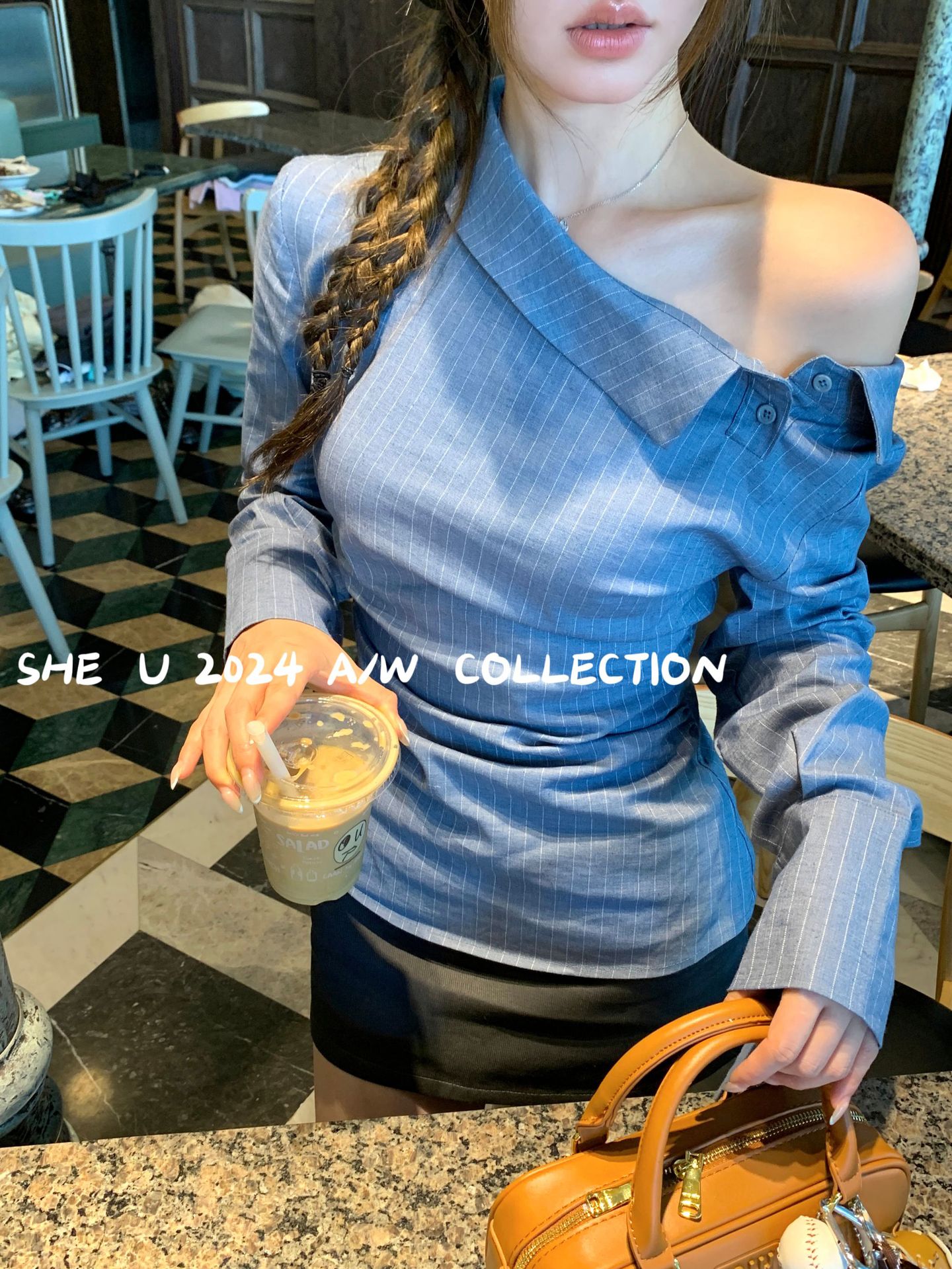 [재고] SHE U 틈새 디자인 비스듬한 어깨 줄무늬 셔츠 여성 2024 가을/겨울 한국 허리 어깨 탑