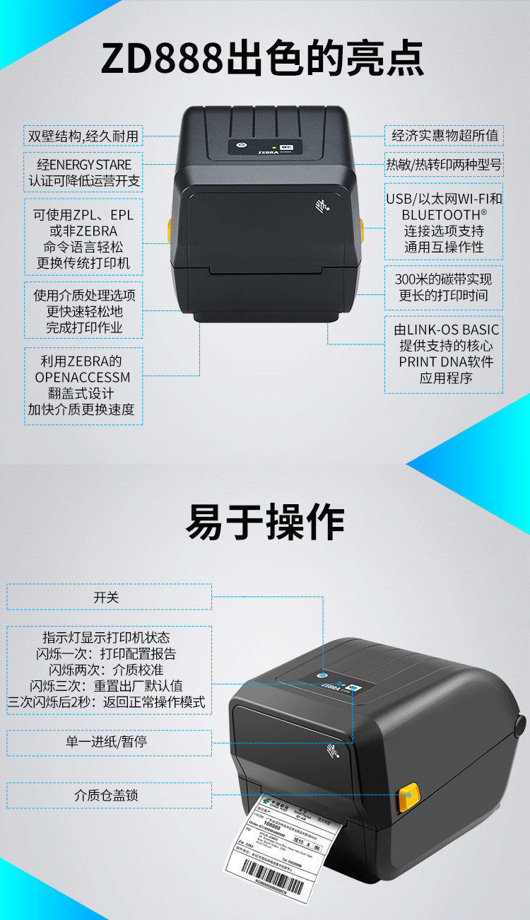 Zebra ZD888 바코드 프린터 GK888T 접착 라벨 종이 특급 전자 단일 열