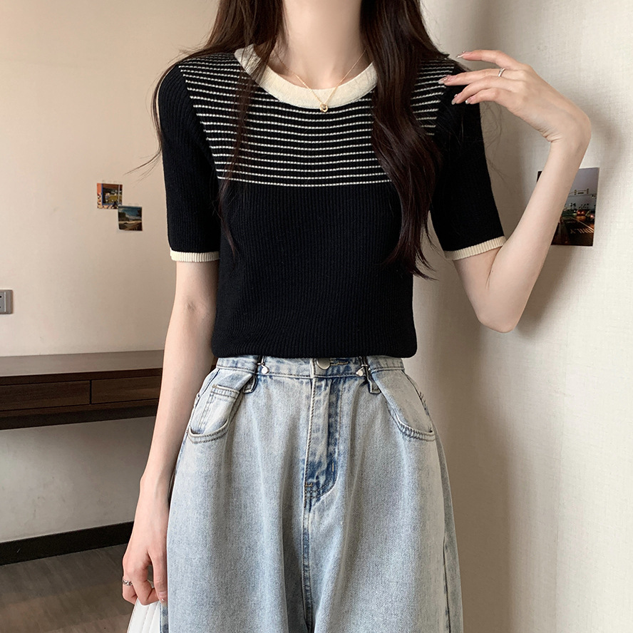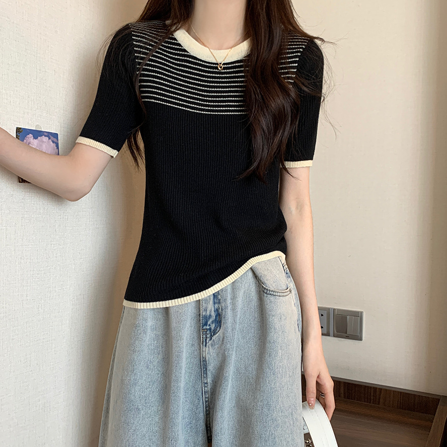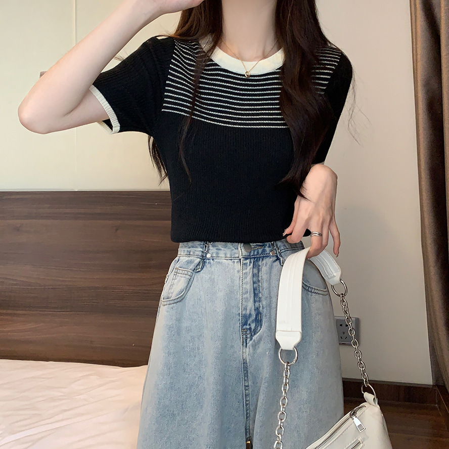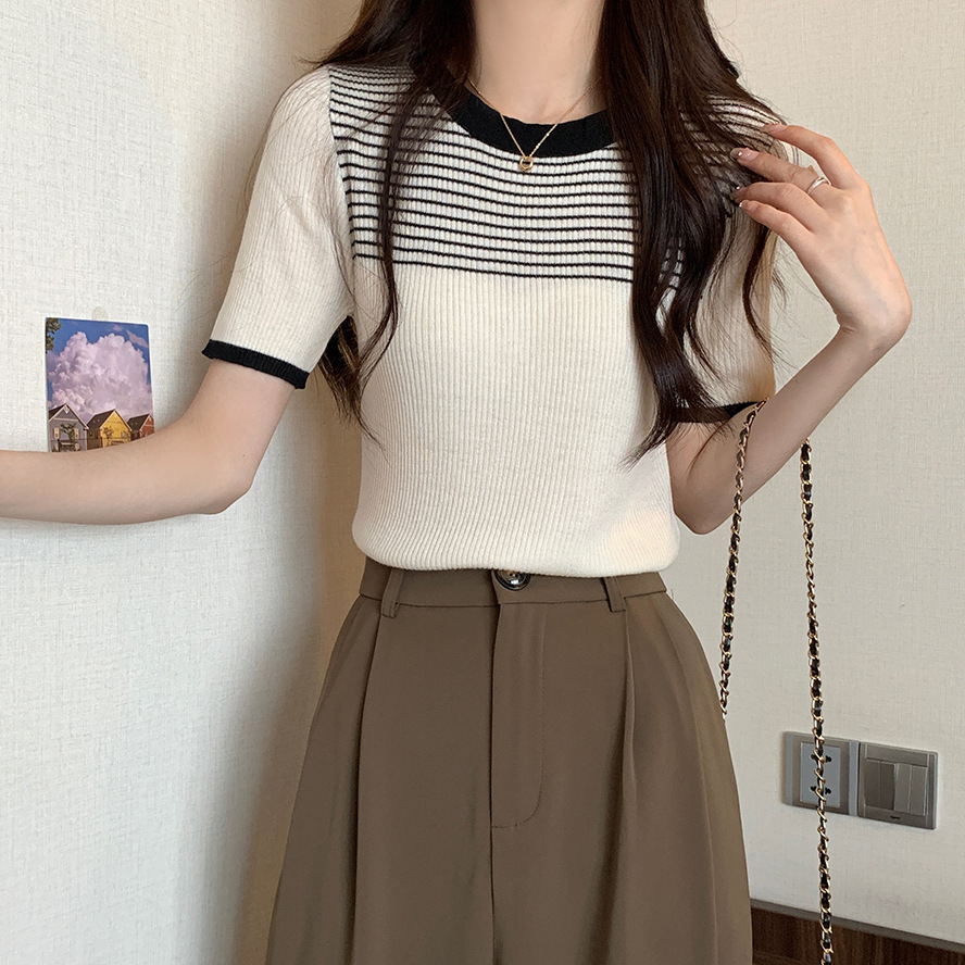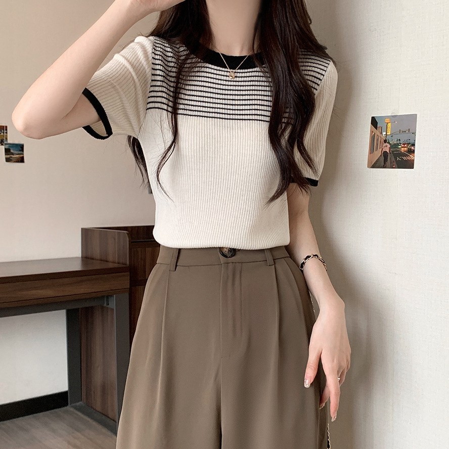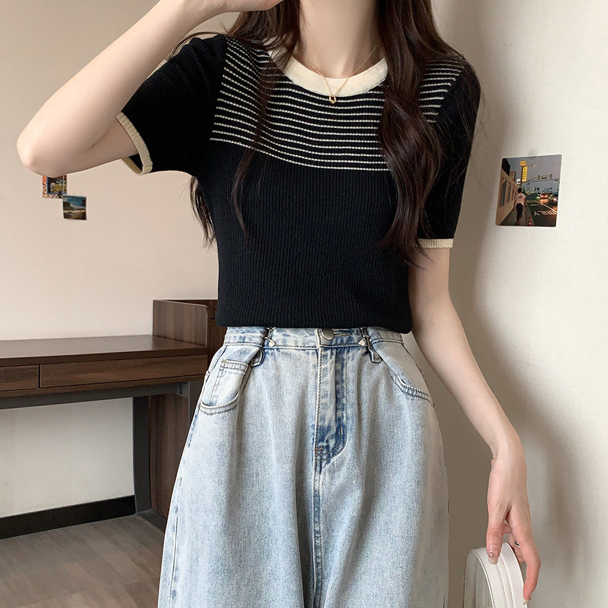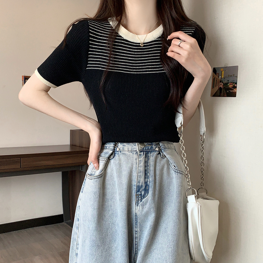 여름 새로운 한국 스타일 세련된 디자인 레트로 콘트라스트 컬러 티셔츠 캐주얼 올매치 반팔 스트레치 허리 탑