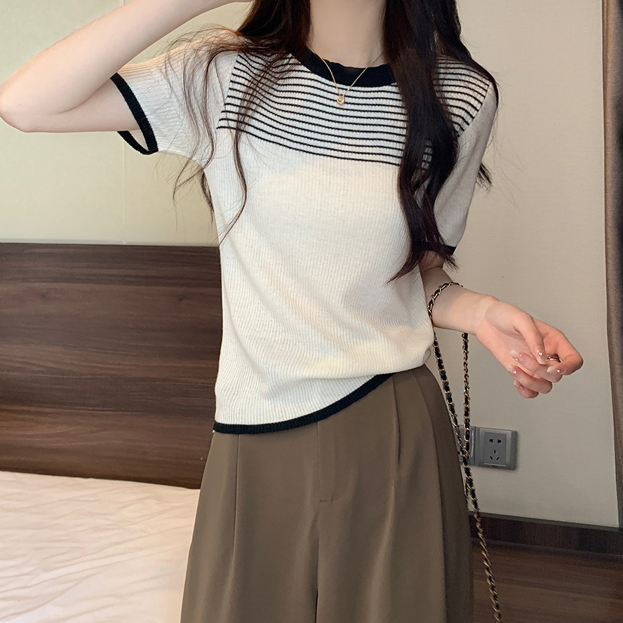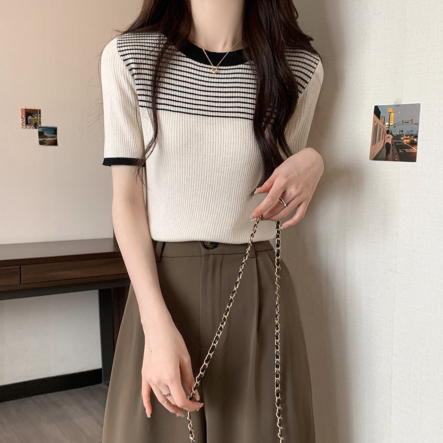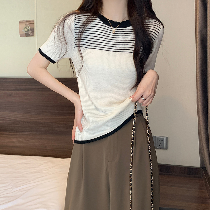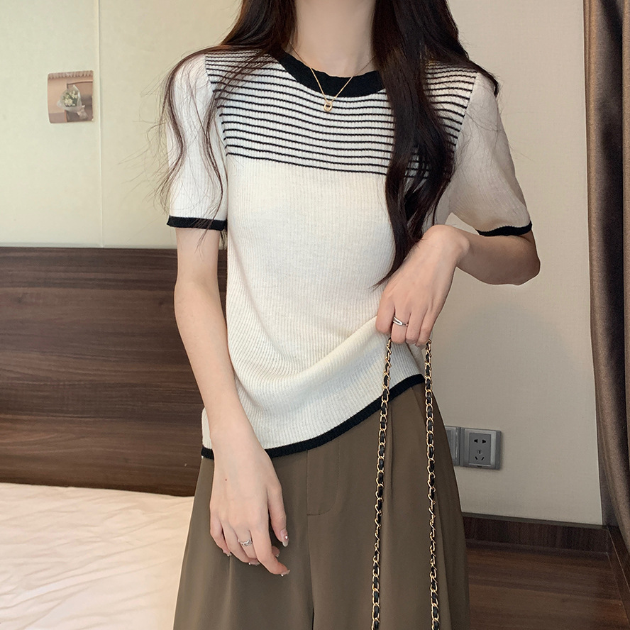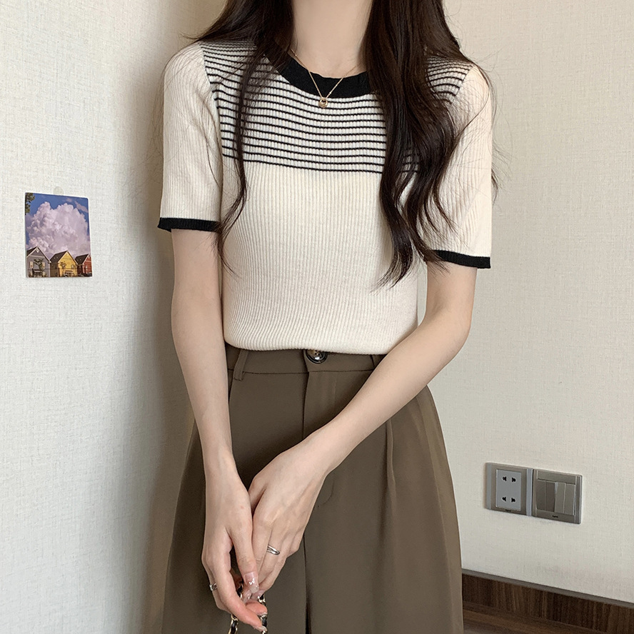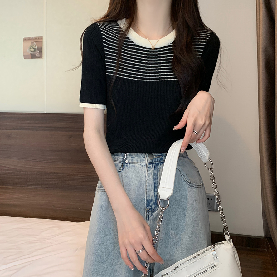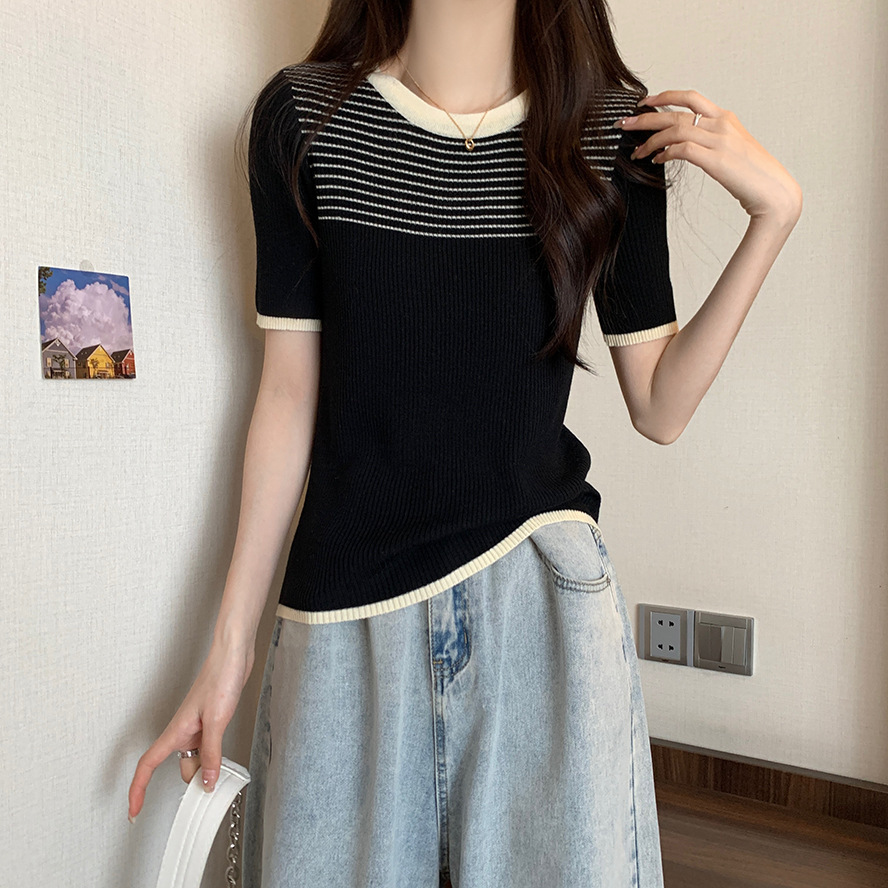 여름 새로운 한국 스타일 세련된 디자인 레트로 콘트라스트 컬러 티셔츠 캐주얼 올매치 반팔 스트레치 허리 탑