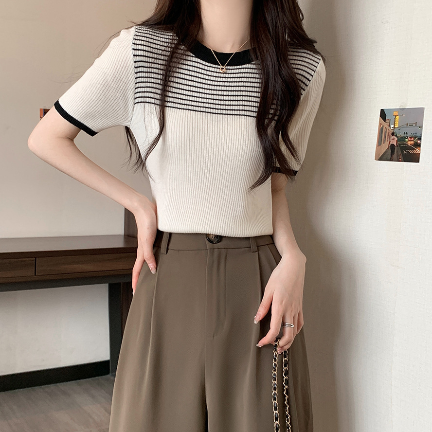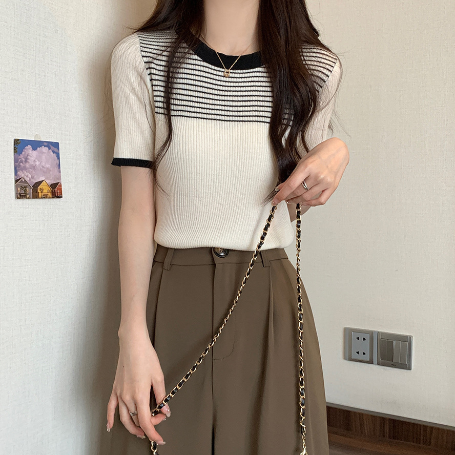 여름 새로운 한국 스타일 세련된 디자인 레트로 콘트라스트 컬러 티셔츠 캐주얼 올매치 반팔 스트레치 허리 탑스토어 가기