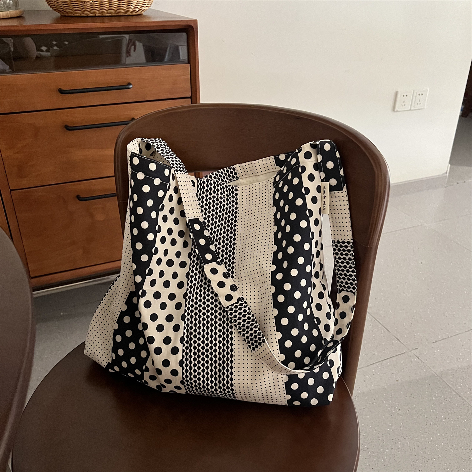 [수시 천 가방] 흑백 웨이브 포인트 패션 간단한 캔버스 가방 어깨 메신저 면직물 가방 여성의 대용량 다용도스토어 가기