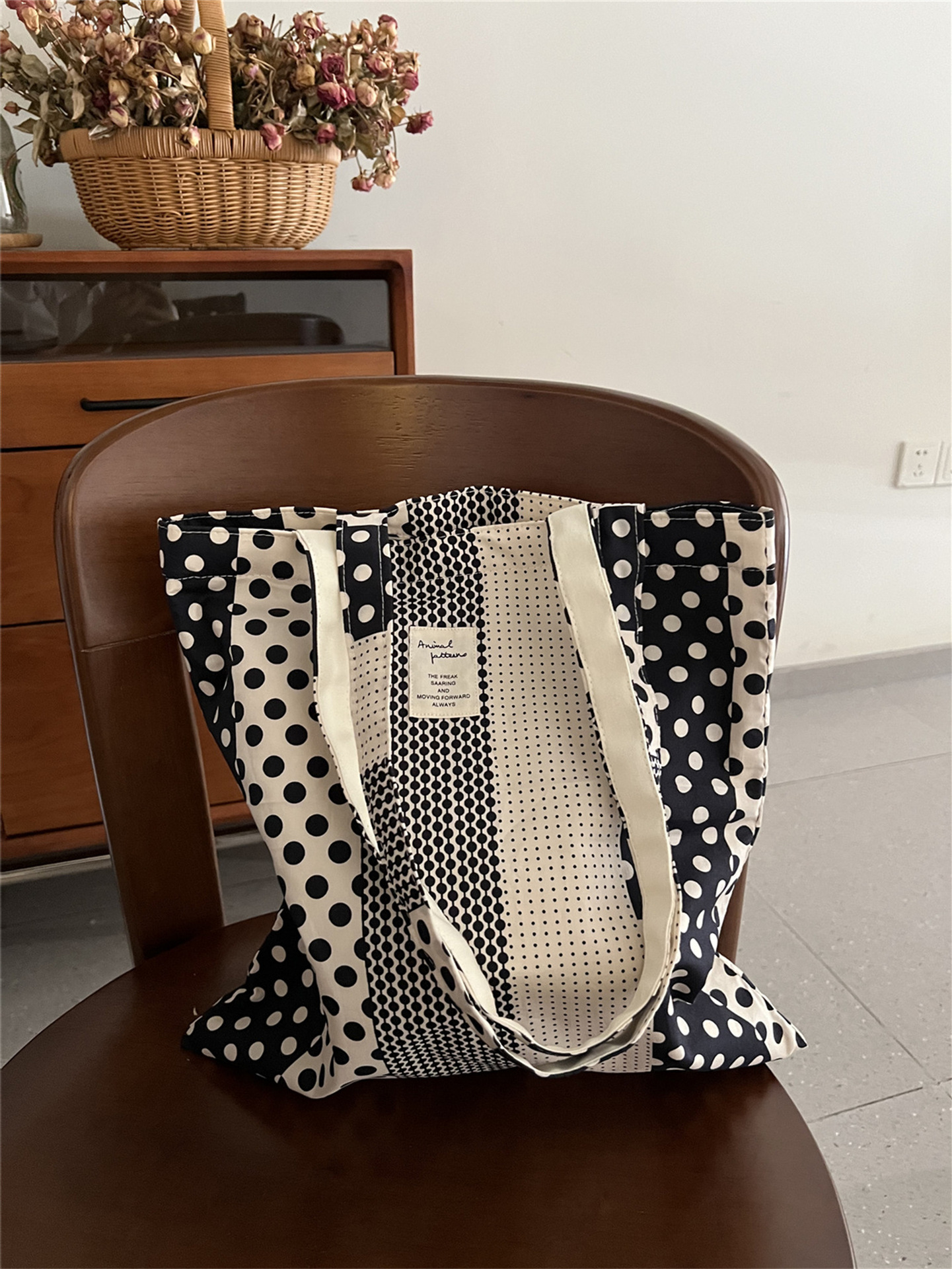 [수시 천 가방] 흑백 웨이브 포인트 패션 간단한 캔버스 가방 어깨 메신저 면직물 가방 여성의 대용량 다용도