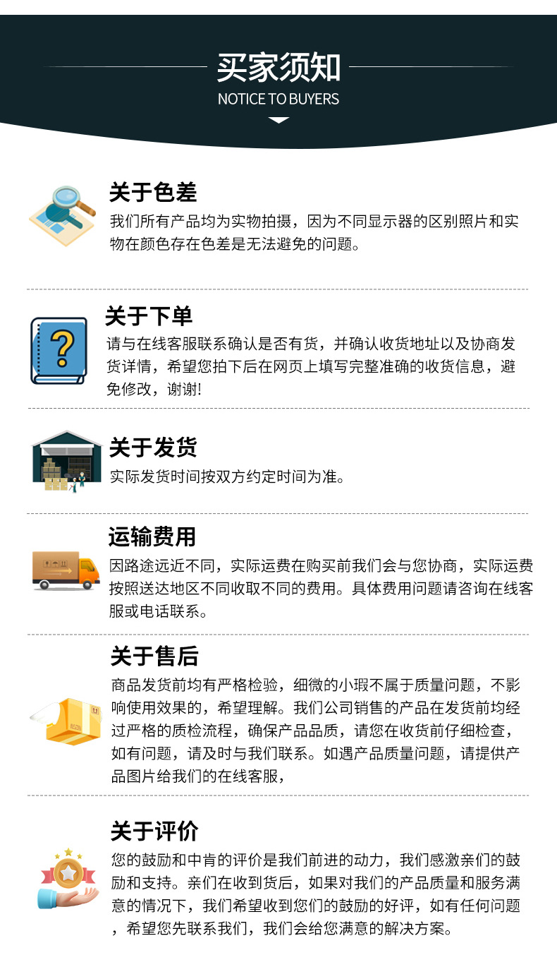 收货请验货后签收,如果包装破损或者压厉害,请给快递说好,回家打开看下,如果有损坏可以拒收。如有少发配件(及配件工人操作失误弄错,比如纽扣给缝错了等)。这个不是质量问题,毕竟工人操作的难免各别存在不仔细,我们也时刻要求严格检查,但是还是有出错的概率。少发配件及配件错的,我们会及时给补发配件,不做质量问题退换货,谢谢理解。