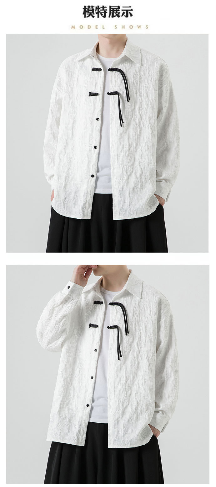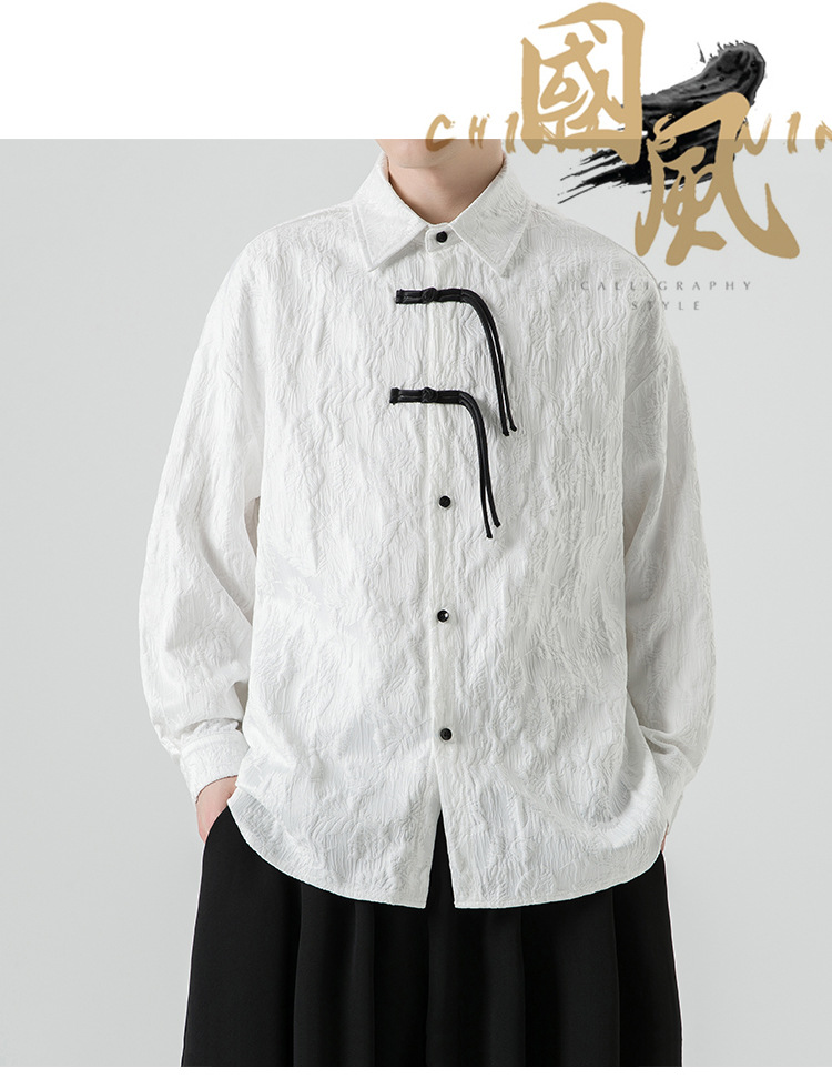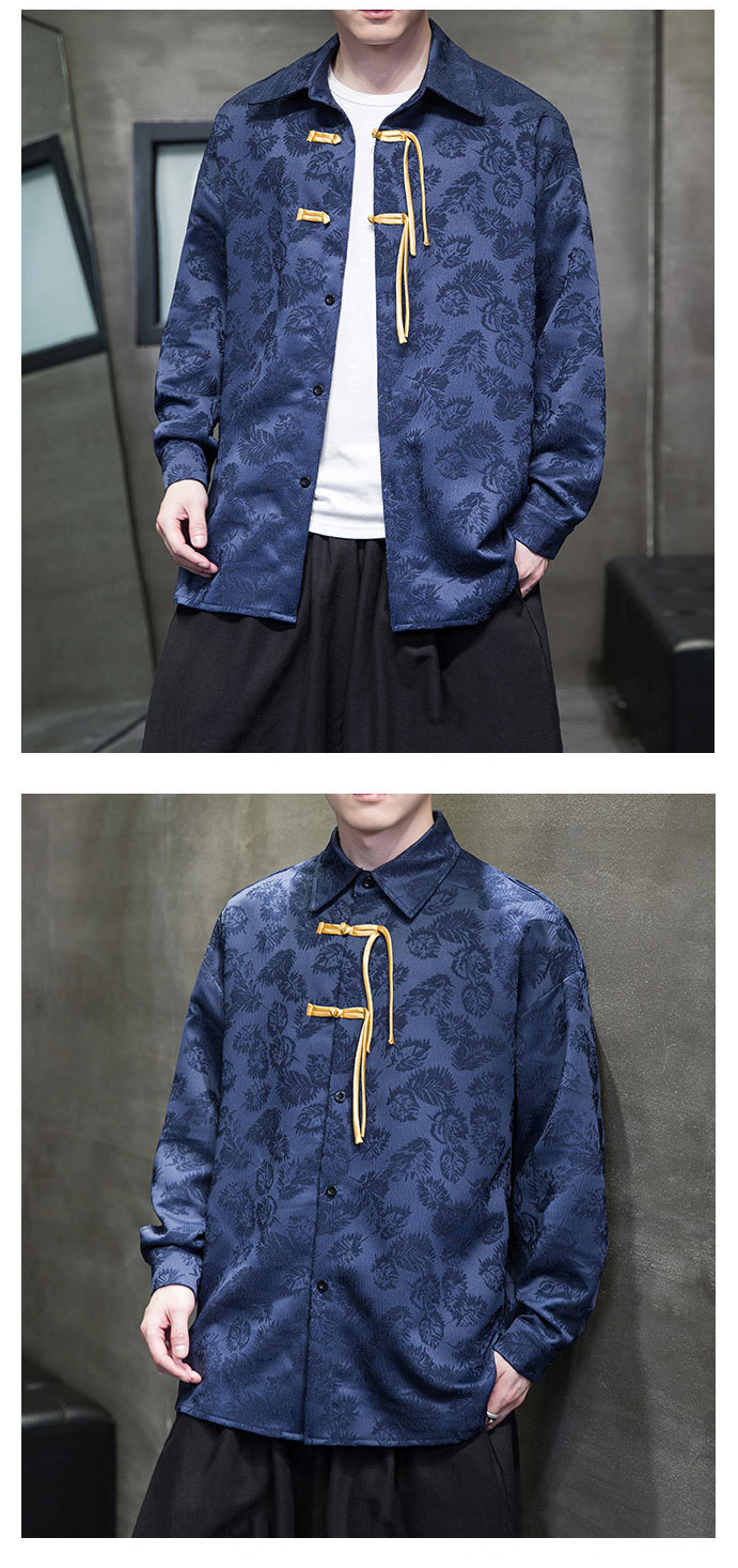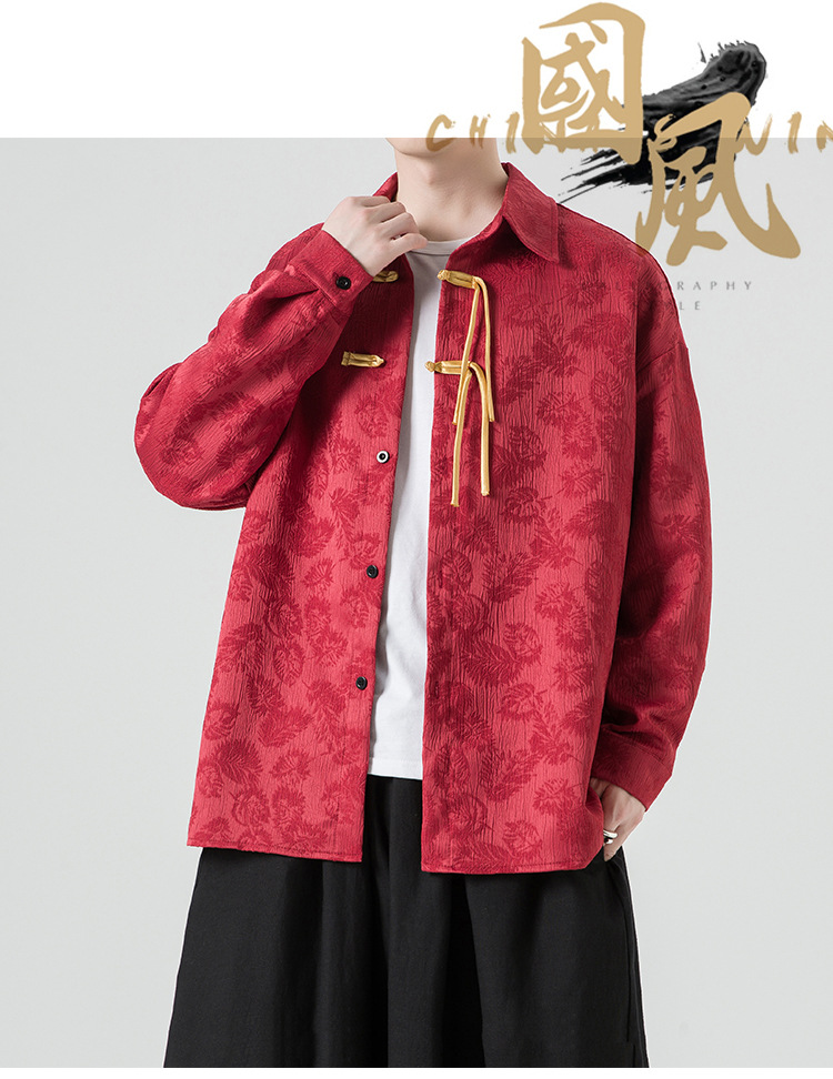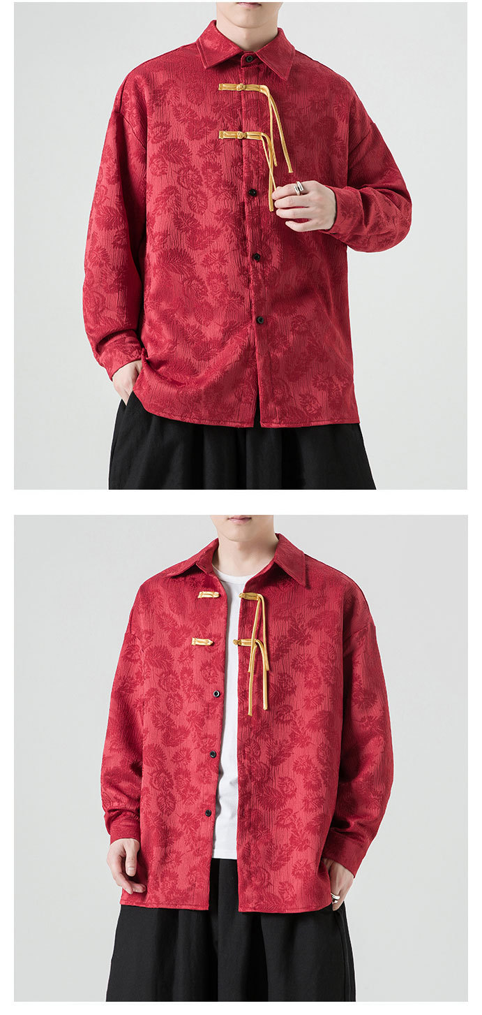 남성용 중국 스타일 빨간색 셔츠 2024 새로운 중국 스타일 자카드 당나라 정장 Hanfu 고급 긴팔 셔츠 재킷 옷깃