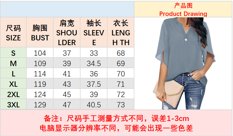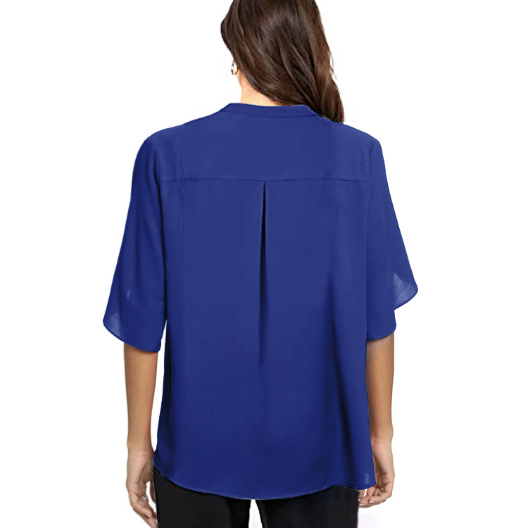 여성 유럽과 미국의 대외 무역 여성 반팔 우아한 캐주얼 솔리드 컬러 V 넥 쉬폰 셔츠 여성의 2024 새로운 스타일스토어 가기