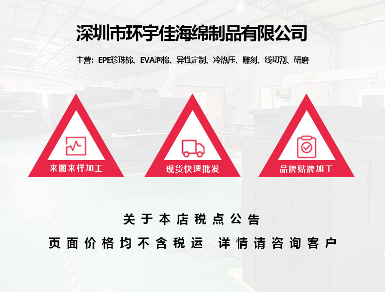 深圳市环宇佳海绵制品有限公司,从事EVA成型、海绵成型、橡塑发泡、珍珠棉成型的研发生产和销售。本公司拥有先进的设备和雄厚的科研技术力量,并通过ISO9001—2000国际质量管理体系认证、SGS环保认证,所有产品均符合欧盟ROHS指令。主要生产:EVA成型包装、防震包装、海绵制品、高发泡制品、珍珠棉制品、EVA内衬、内托、托盘、包装盒等等。公司本着诚信求实的销售方针,以市场为导向,不断开拓新产品,新市场,力争成为中国包装行业异形加工的第一厂家。勇于进取,敢于创新期待与各界朋友携手合作,共同发展。公司最近又加大技改力度,加大新设备机械的投入,不断提升产品的质量和品质。公司全部产品可根据客户要求订做。公司产品在包装行业、电子行业、家具行业、玩具行业等各个领域的广泛应用,给公司的发展和产品的推广直射出一条光明大道!我们将沿着它,不断拓展,创新!没有最好,只有更好!