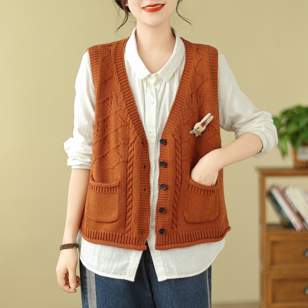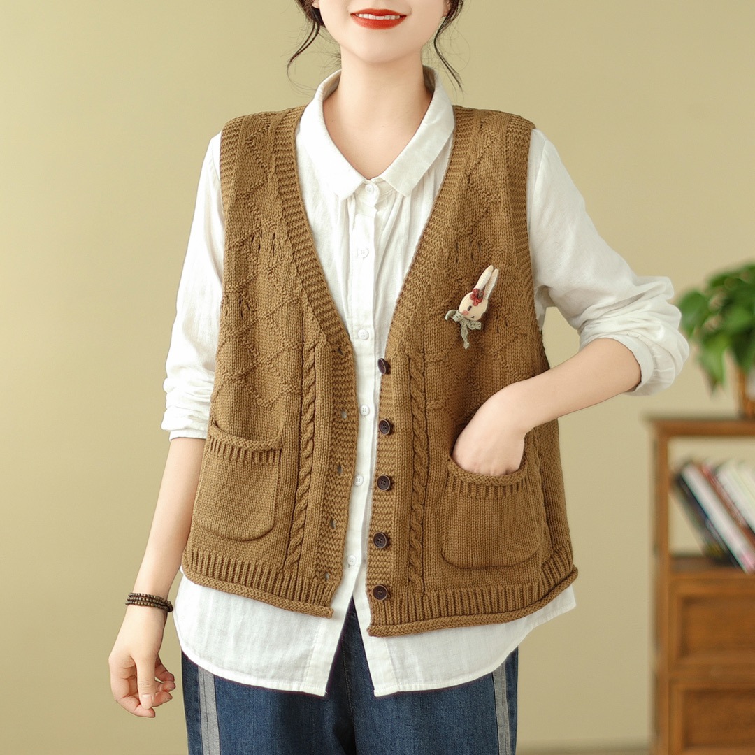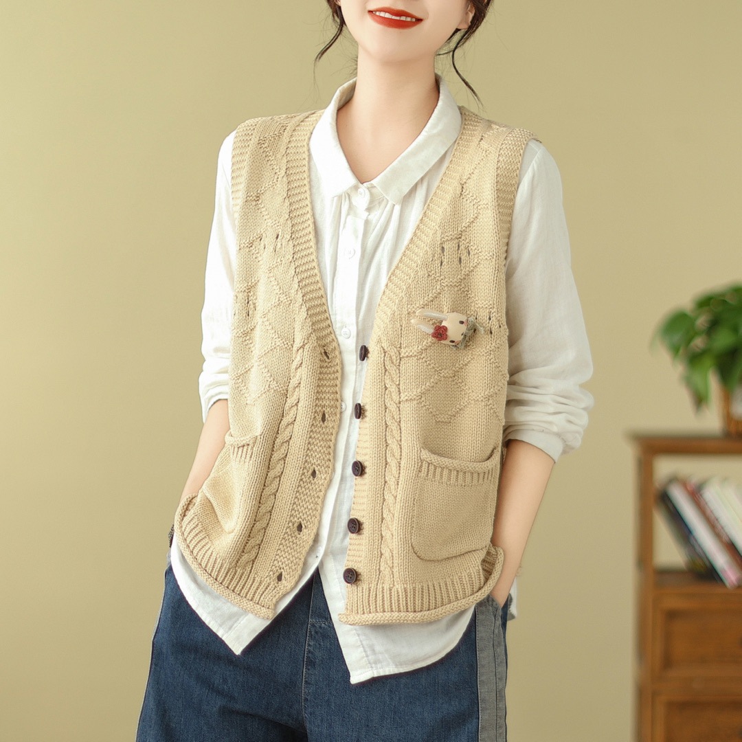 고대 카페 의류 코튼 니트 조끼 가을 새로운 카디건 V 넥 조끼 여성 느슨한 민소매 조끼 탑