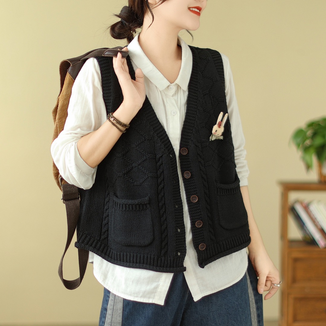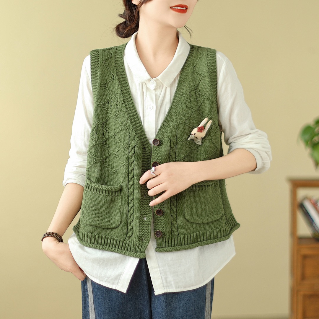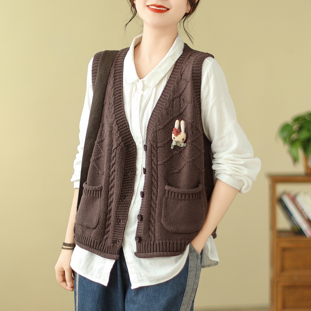 고대 카페 의류 코튼 니트 조끼 가을 새로운 카디건 V 넥 조끼 여성 느슨한 민소매 조끼 탑