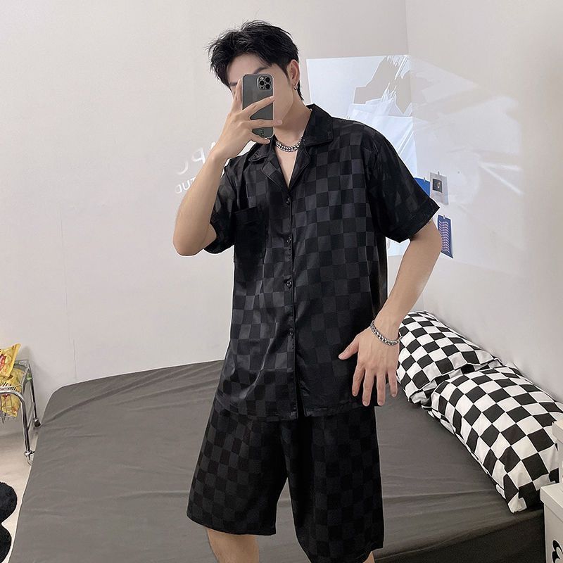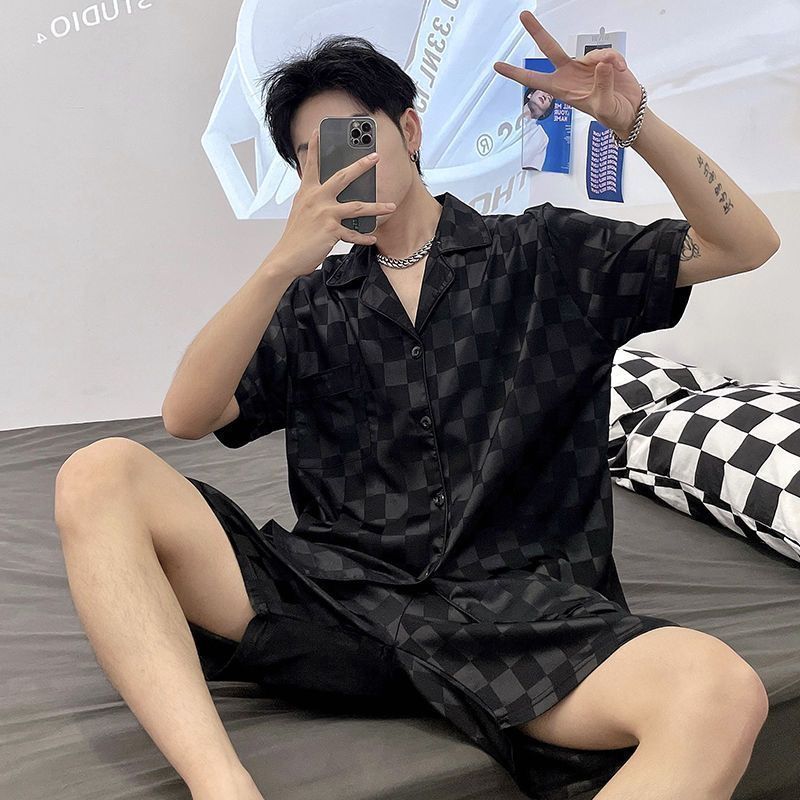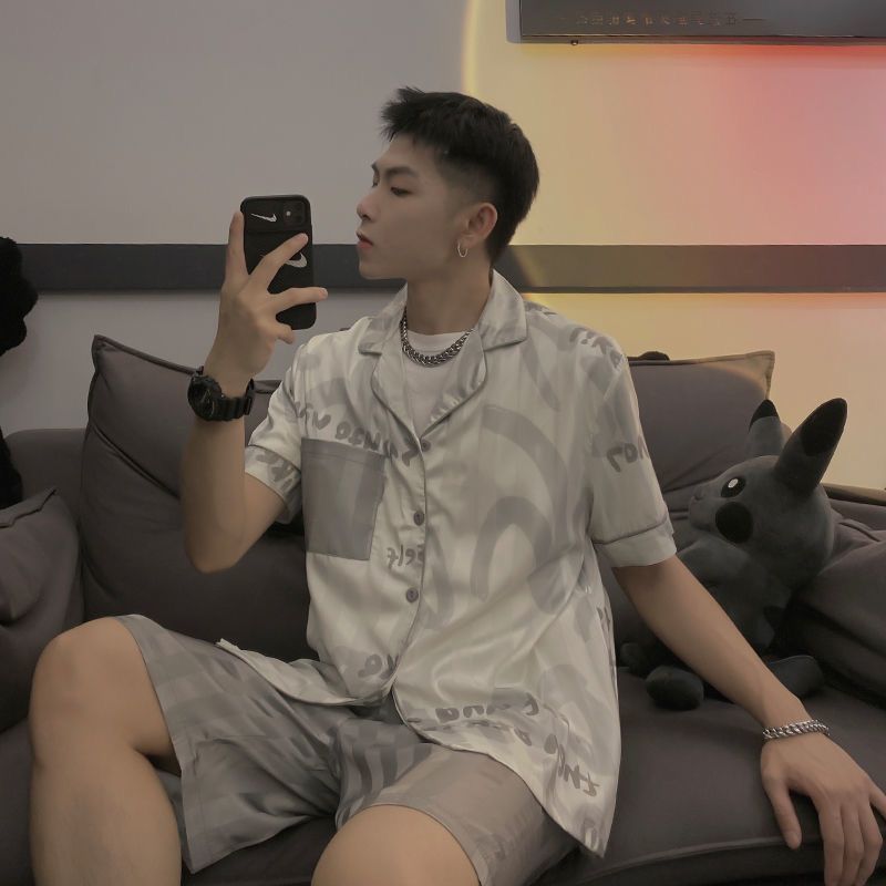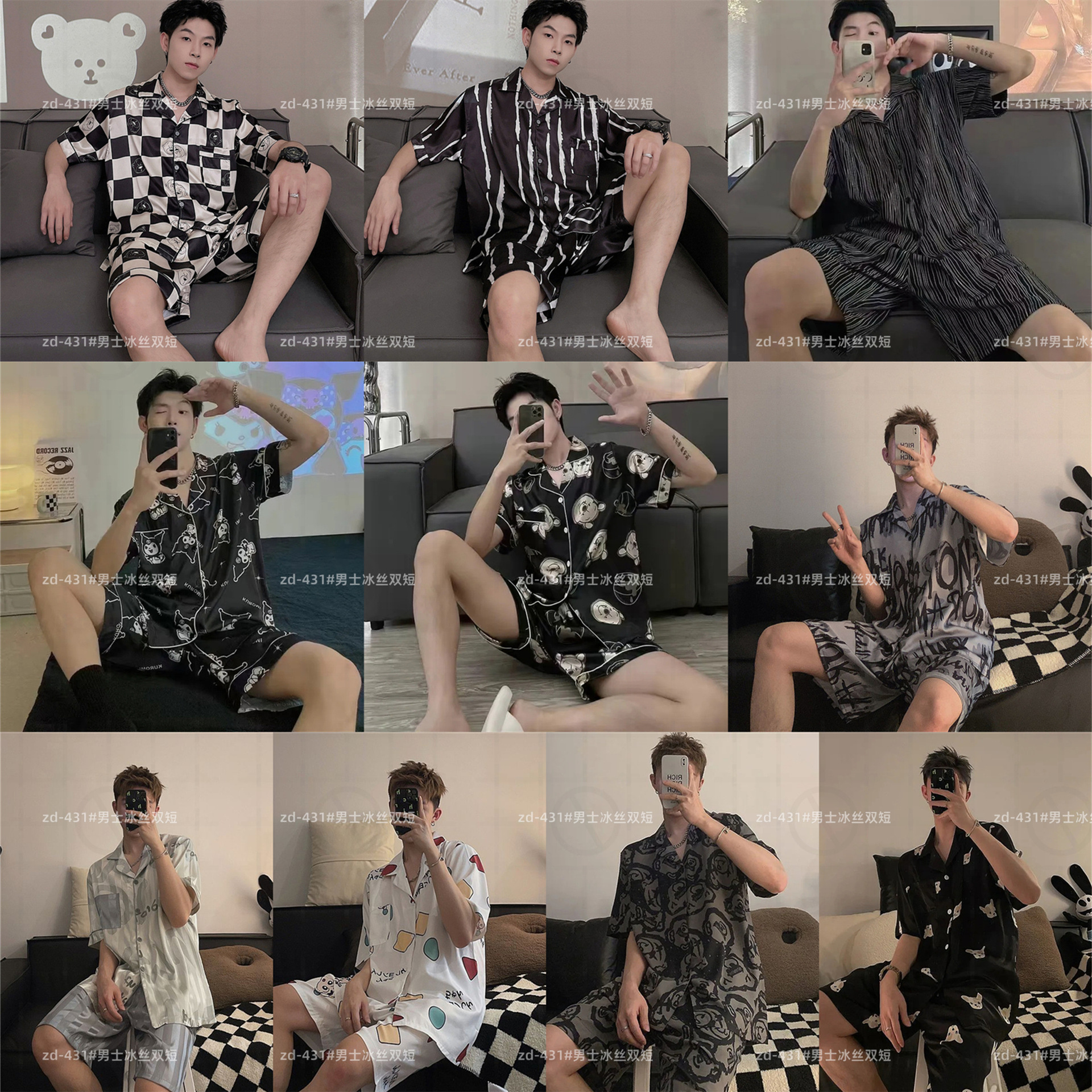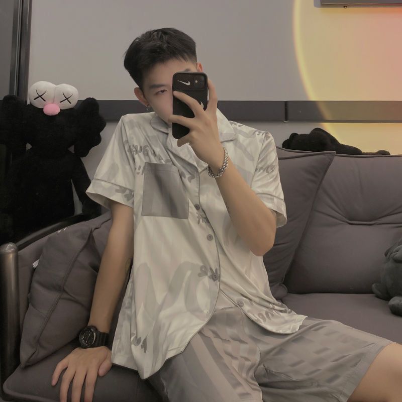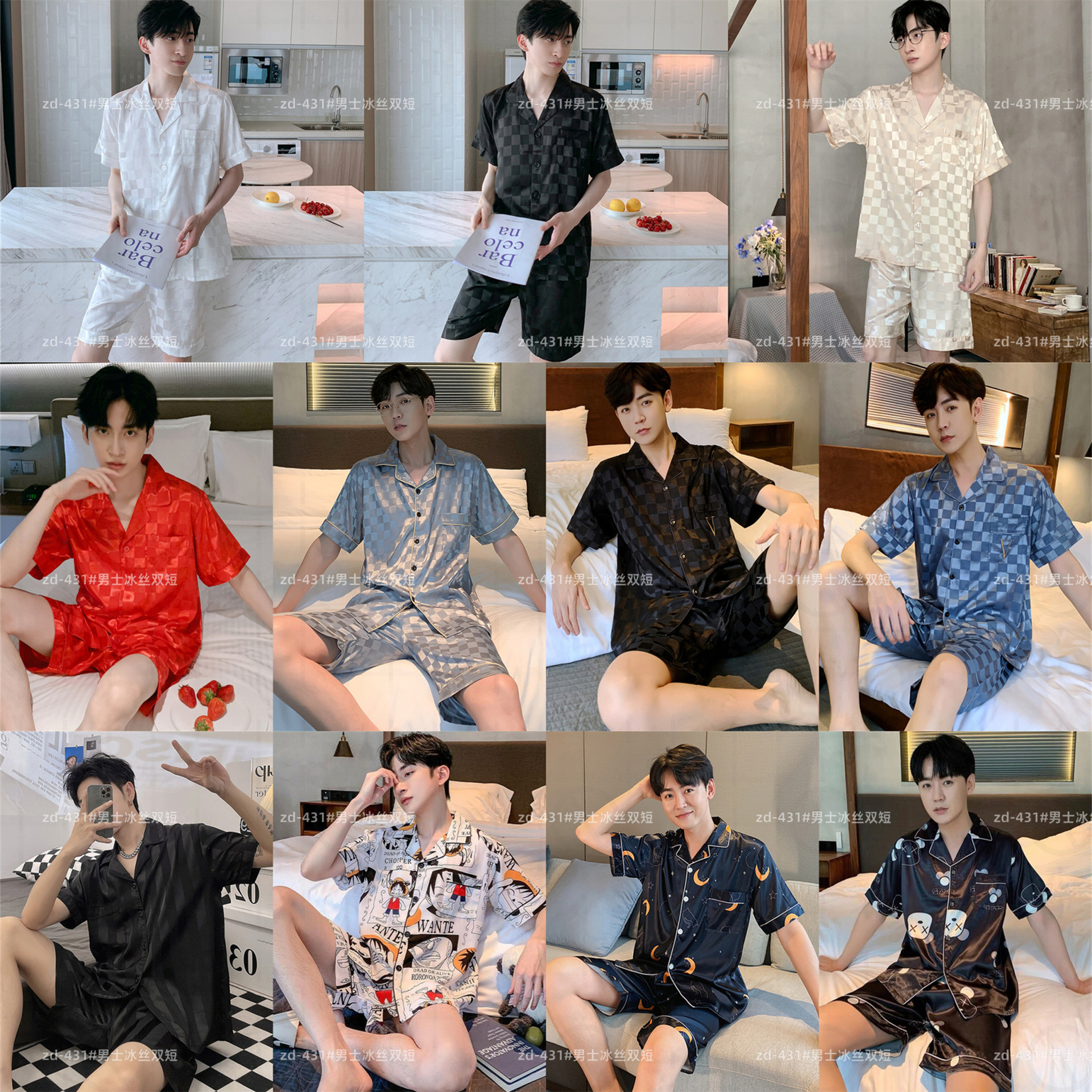 남자 잠옷 여름 아이스 실크 반팔 얇은 외부 하이 엔드 여름 실크 플러스 사이즈 홈 의류 세트 착용스토어 가기