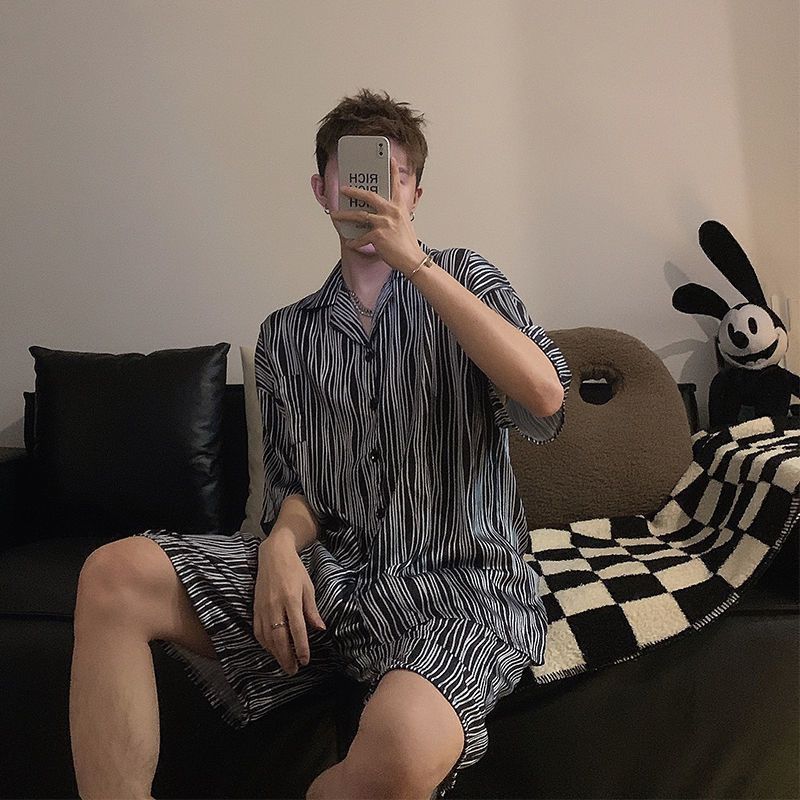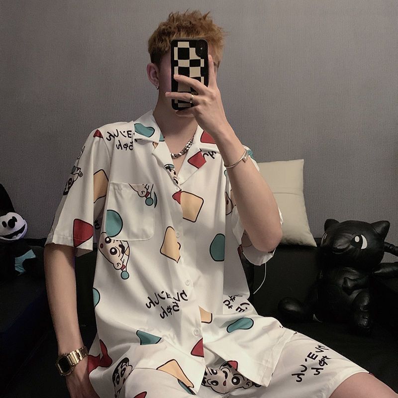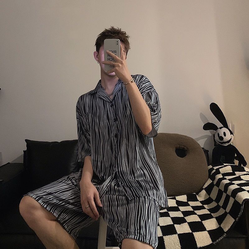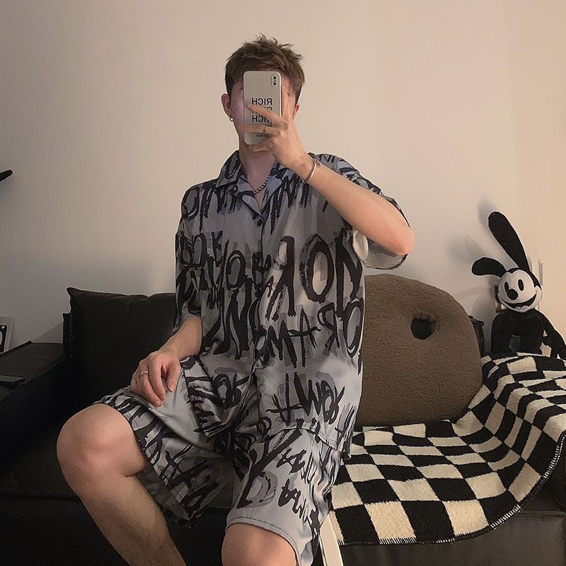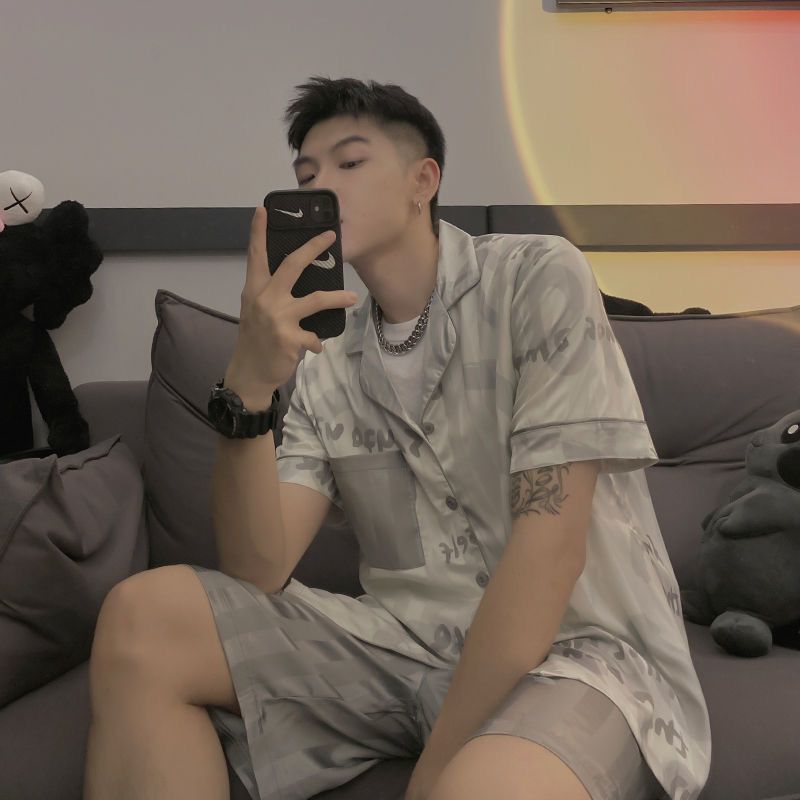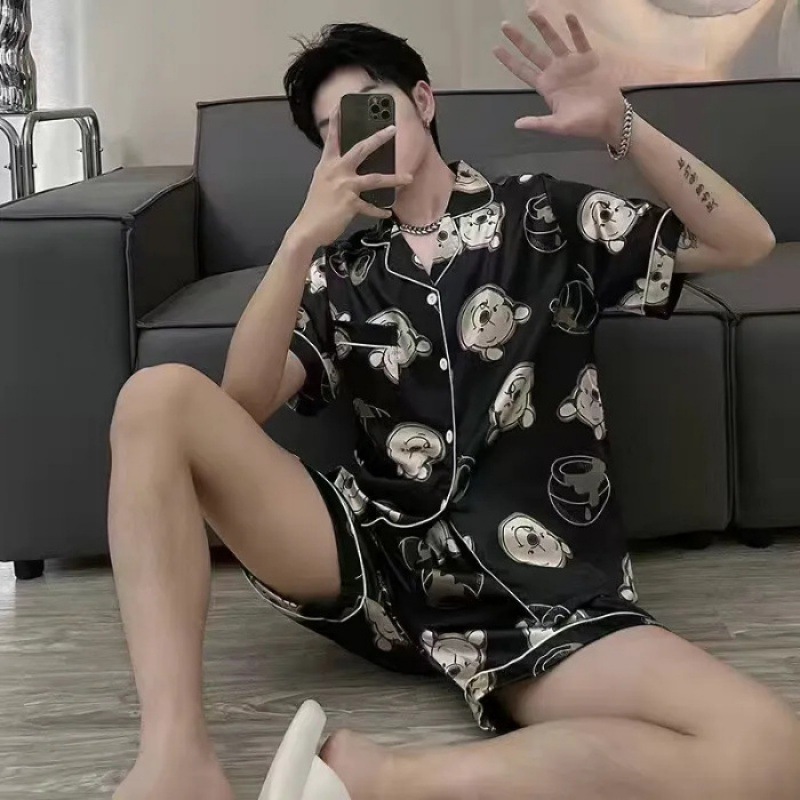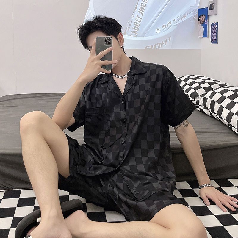 남자 잠옷 여름 아이스 실크 반팔 얇은 외부 하이 엔드 여름 실크 플러스 사이즈 홈 의류 세트 착용스토어 가기