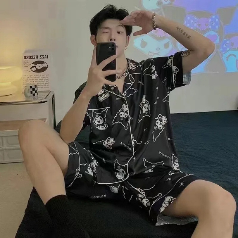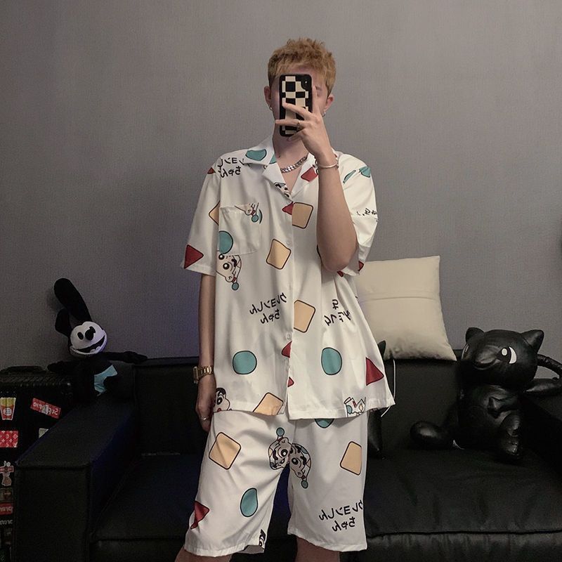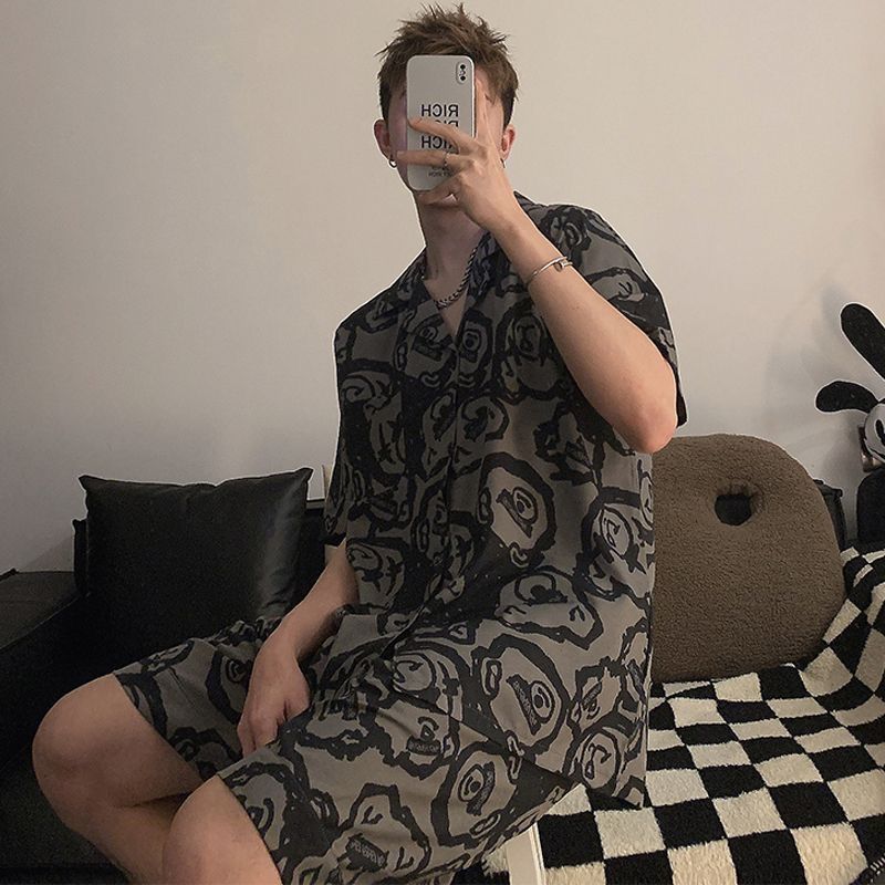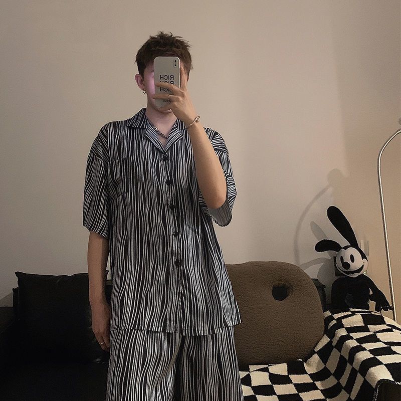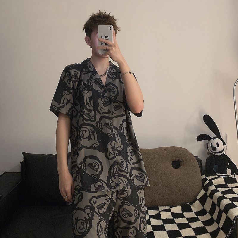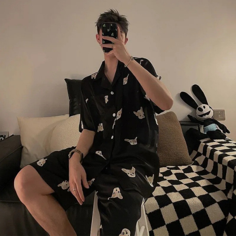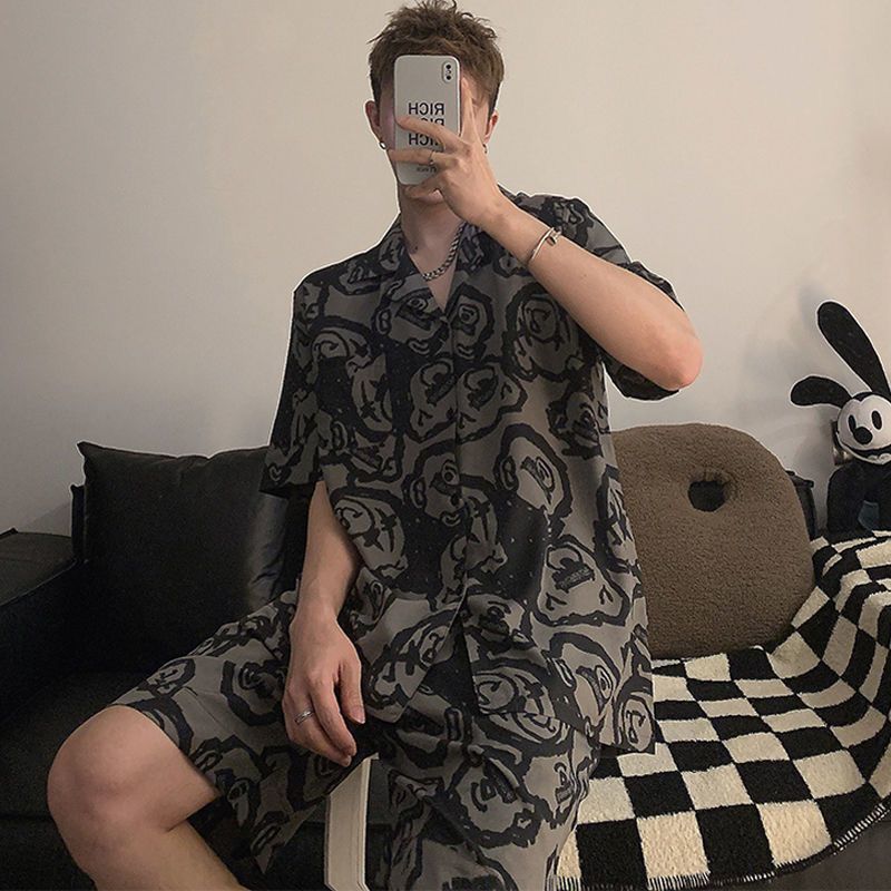 남자 잠옷 여름 아이스 실크 반팔 얇은 외부 하이 엔드 여름 실크 플러스 사이즈 홈 의류 세트 착용스토어 가기