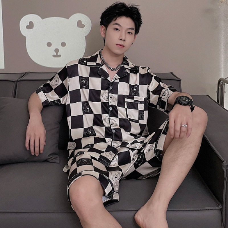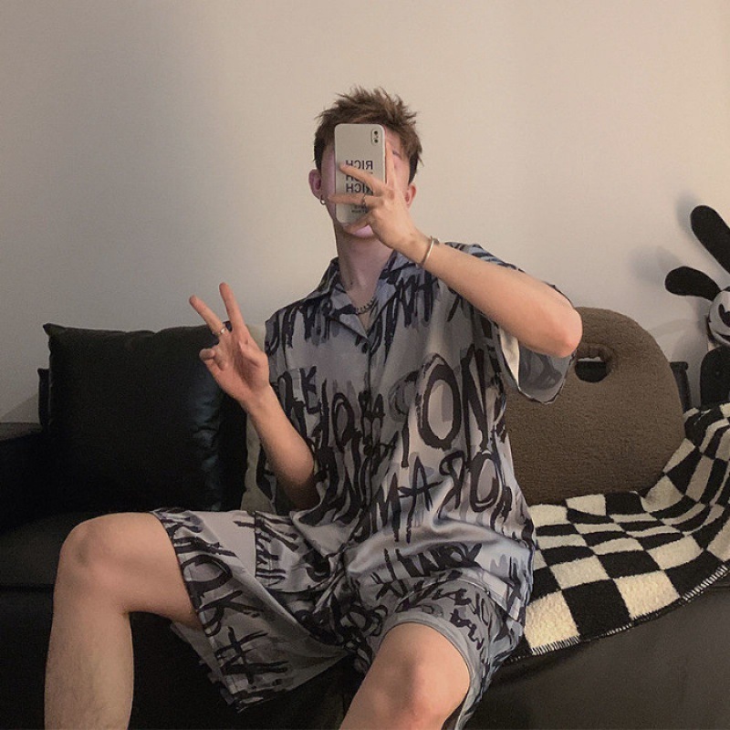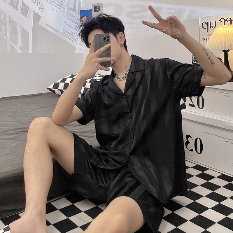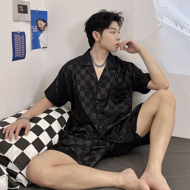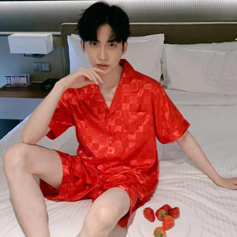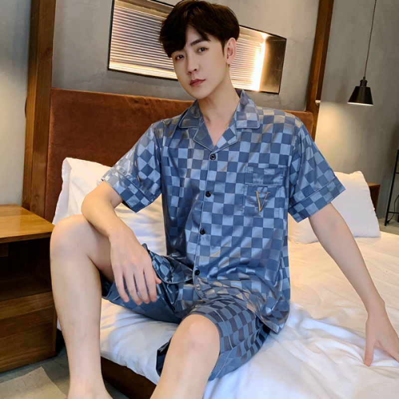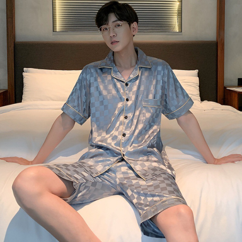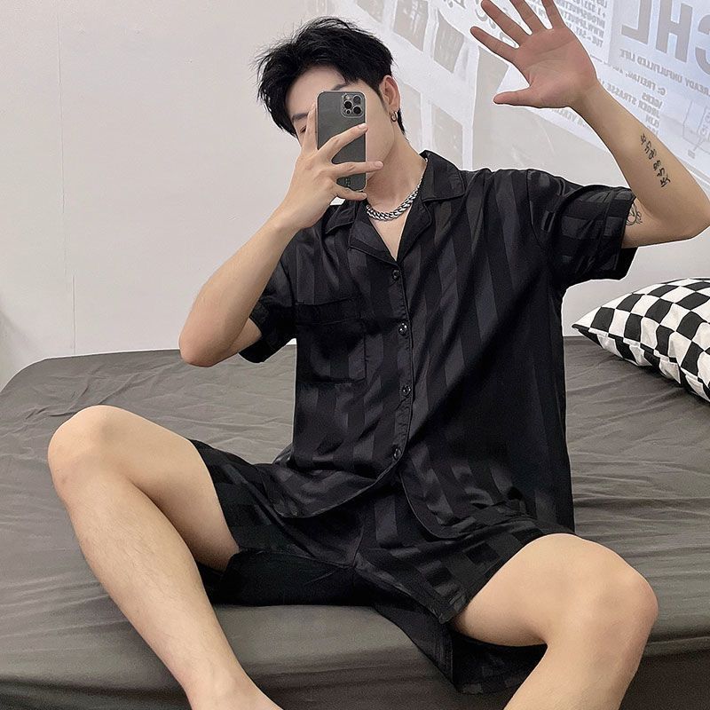 남자 잠옷 여름 아이스 실크 반팔 얇은 외부 하이 엔드 여름 실크 플러스 사이즈 홈 의류 세트 착용