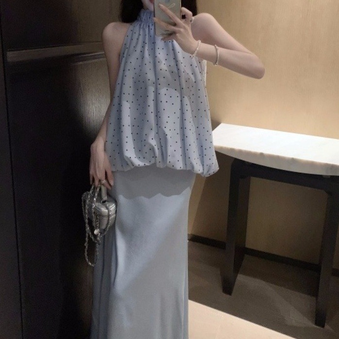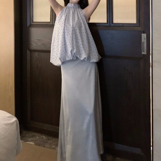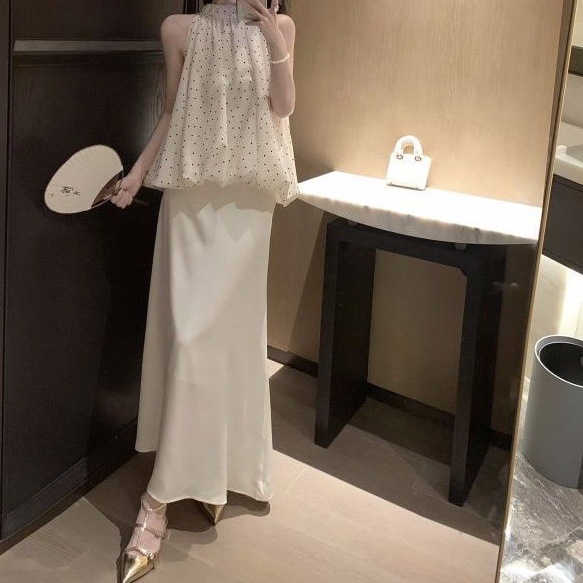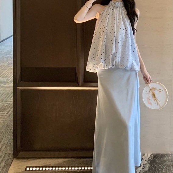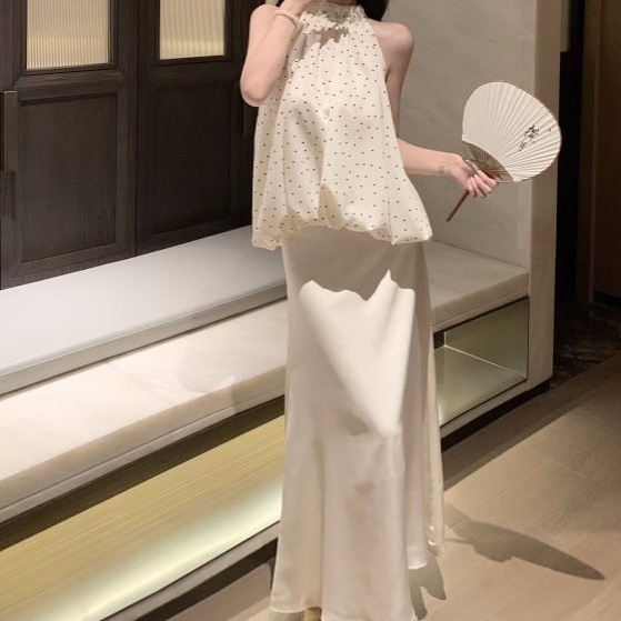 순수한 섹시 스타일의 홀터넥 도트무늬 꽃봉오리 민소매 조끼 루즈핏 탑 여성 여름 새틴 스커트 롱스커트 투피스 세트