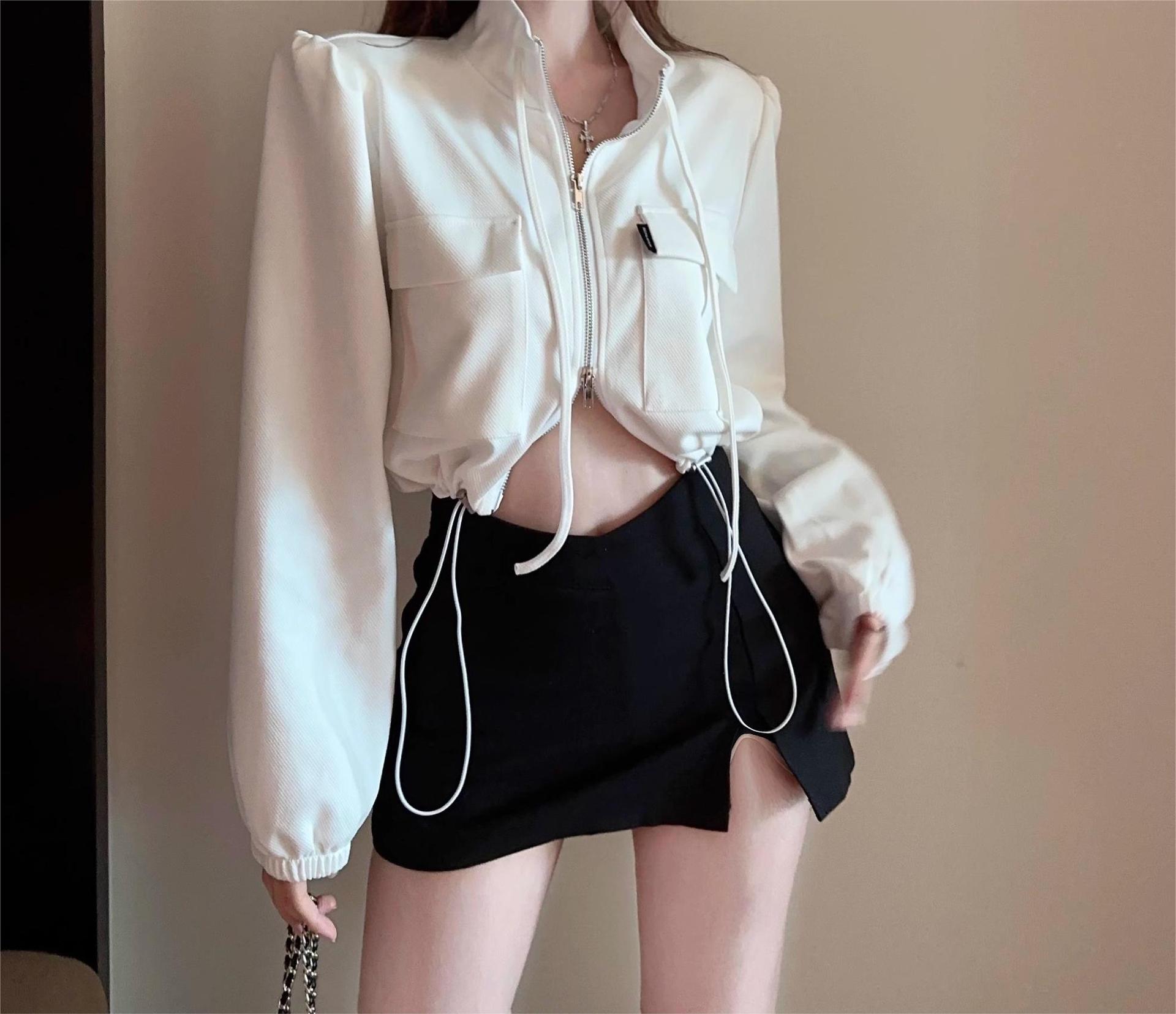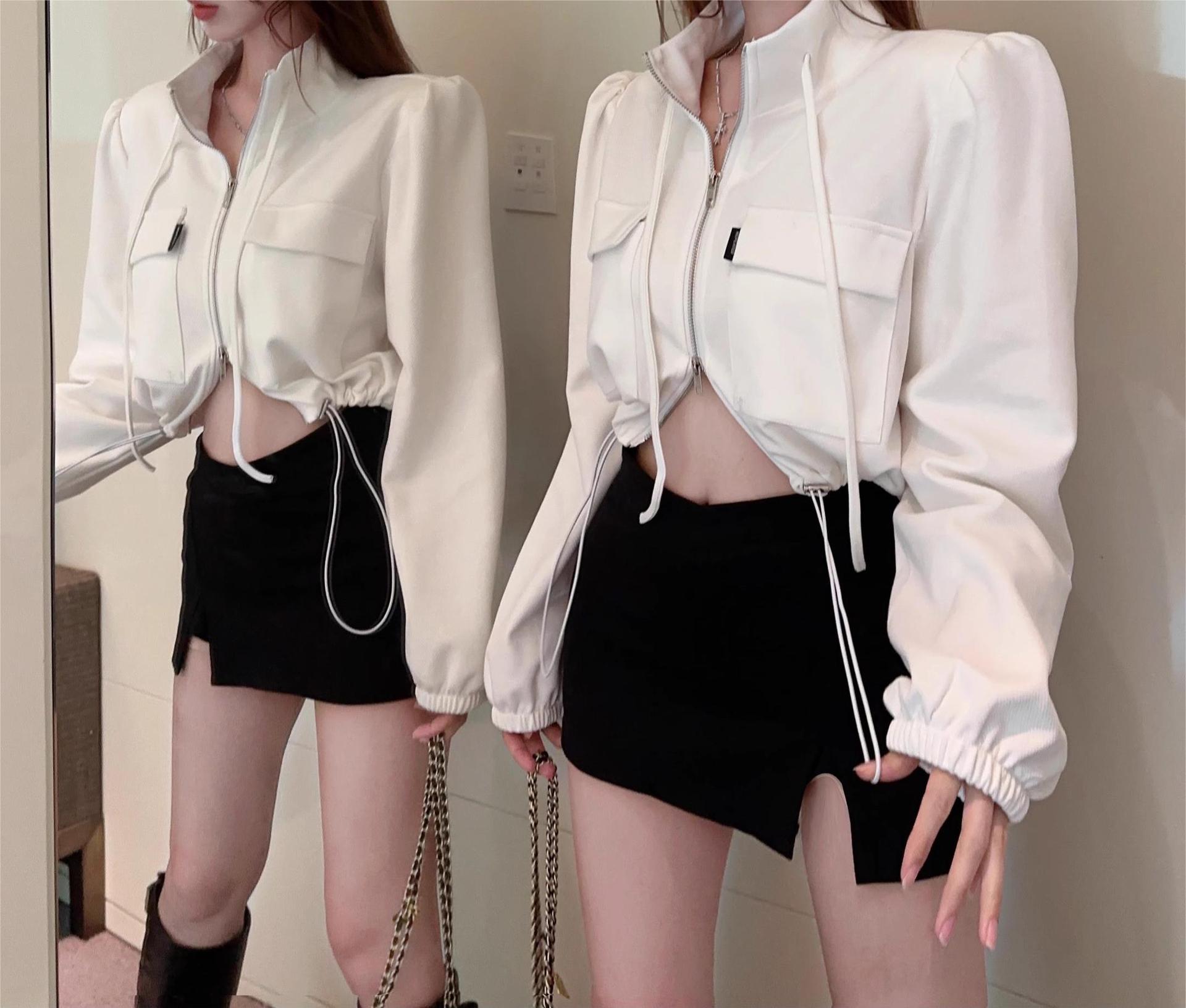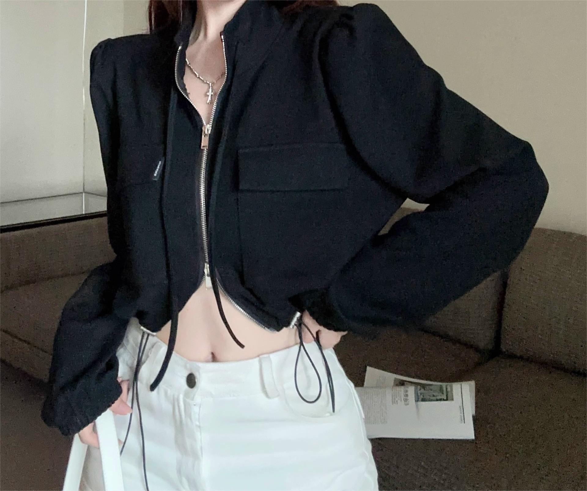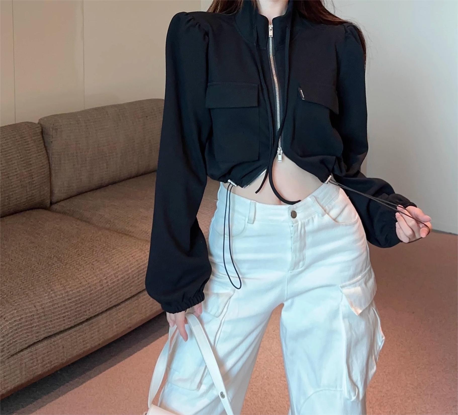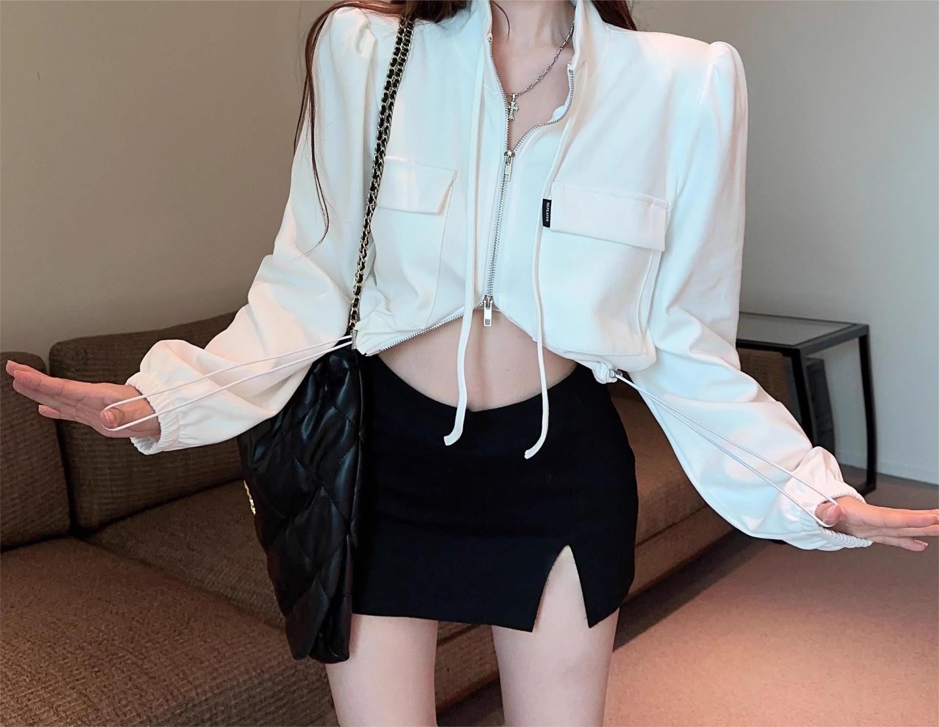 아메리칸 핫걸 여성용 짧은 퍼프 슬리브 탑, 틈새 가을 겨울 오토바이 재킷, 작업복 재킷, 재킷스토어 가기