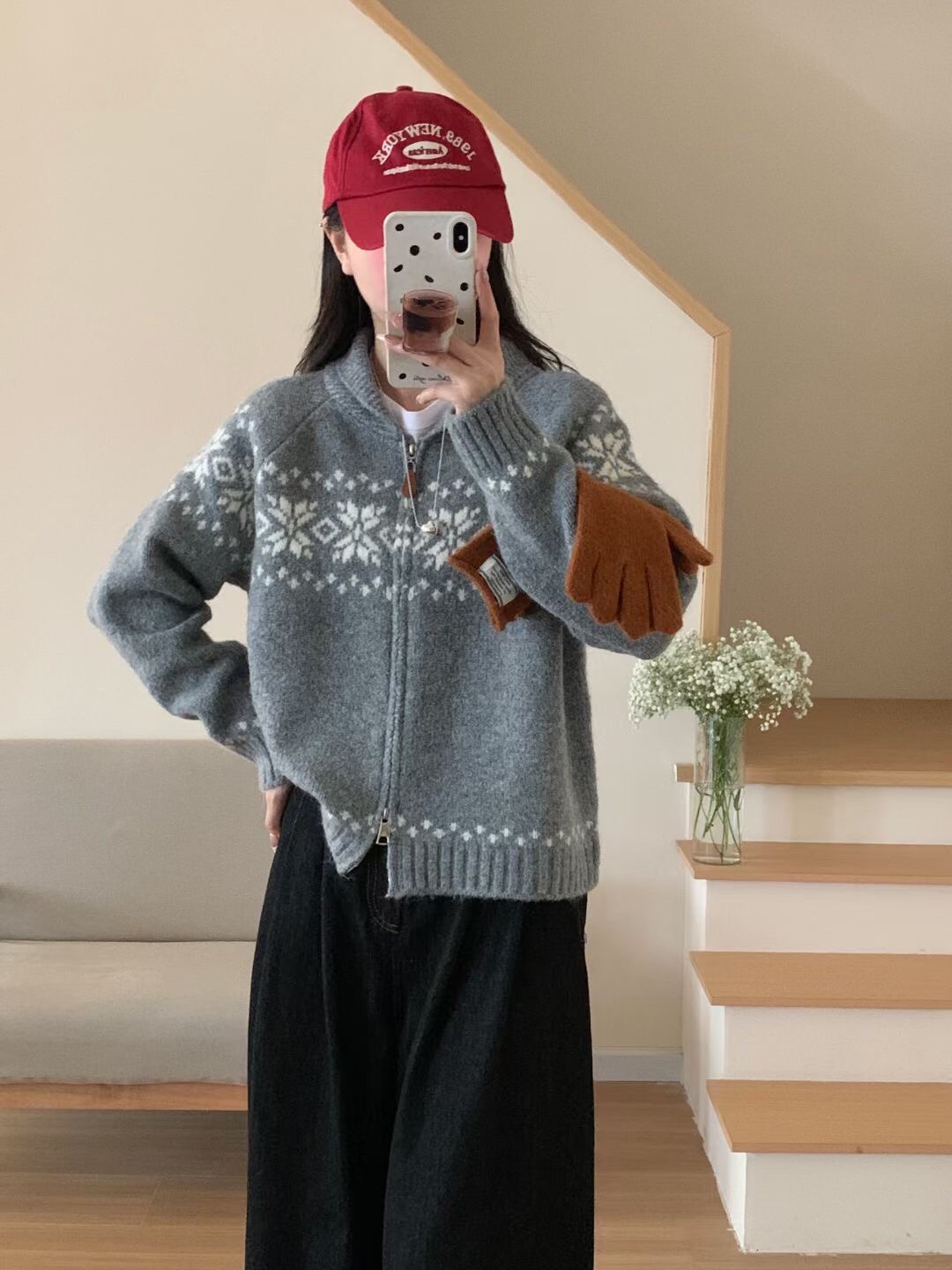 한국 빈티지 부드러운 스타일 자카드 스웨터 가을과 겨울 새로운 느슨한 콘트라스트 컬러 지퍼 니트 카디건 재킷
