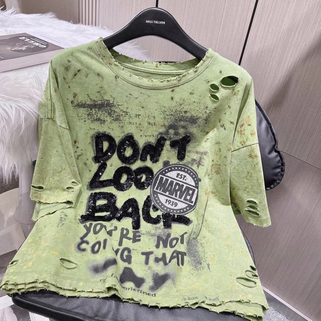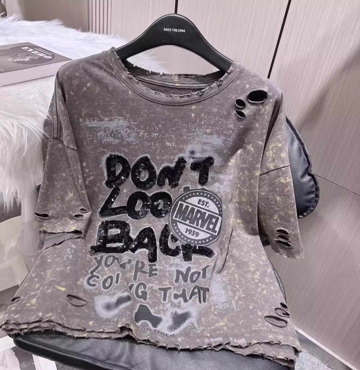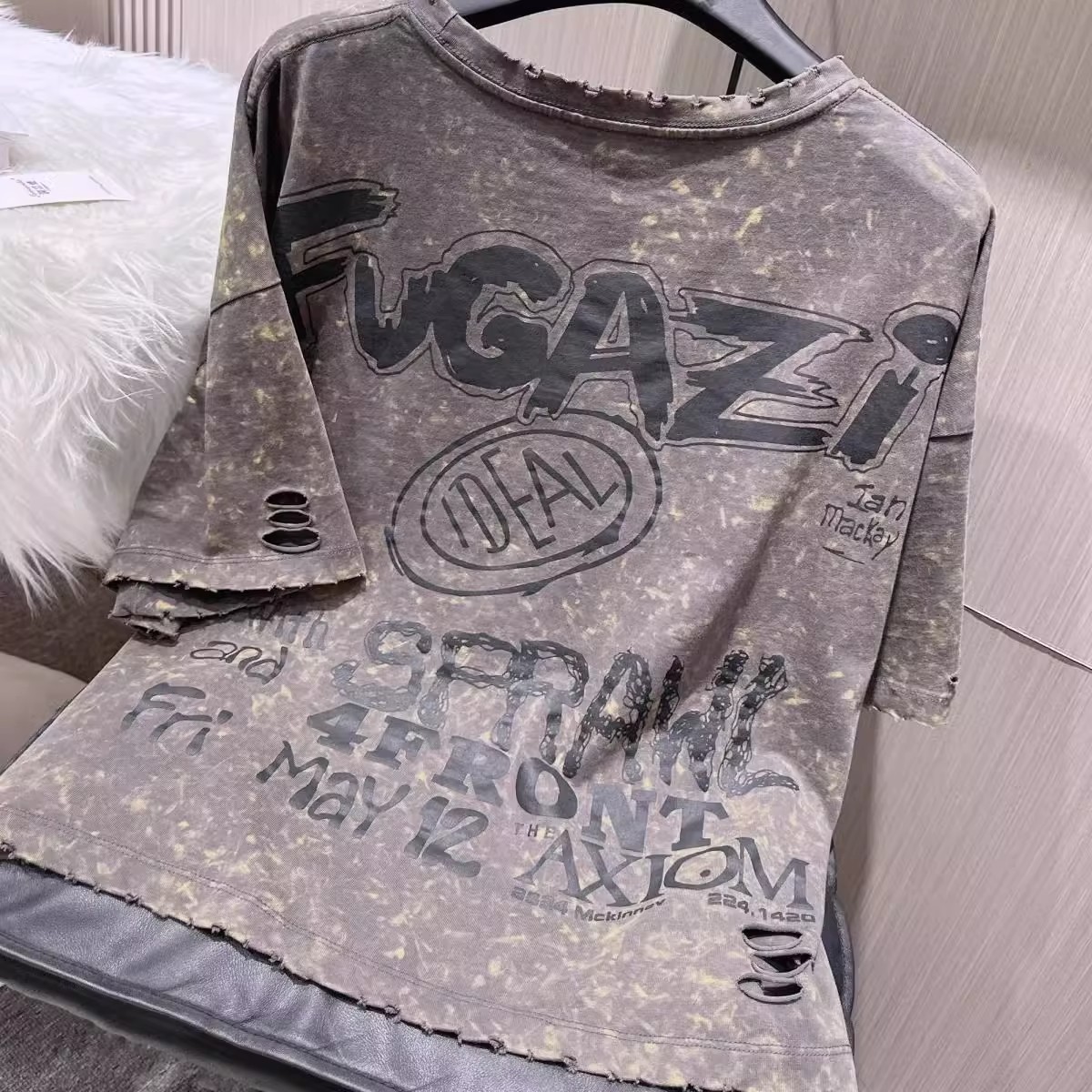 슈퍼 플러스 사이즈 1.00 kg-150.00 kg 통통녀 여름 디자인 센스 리핑 프린트 리퀸 반팔 티셔츠 여성용 루즈 라운드 넥 탑