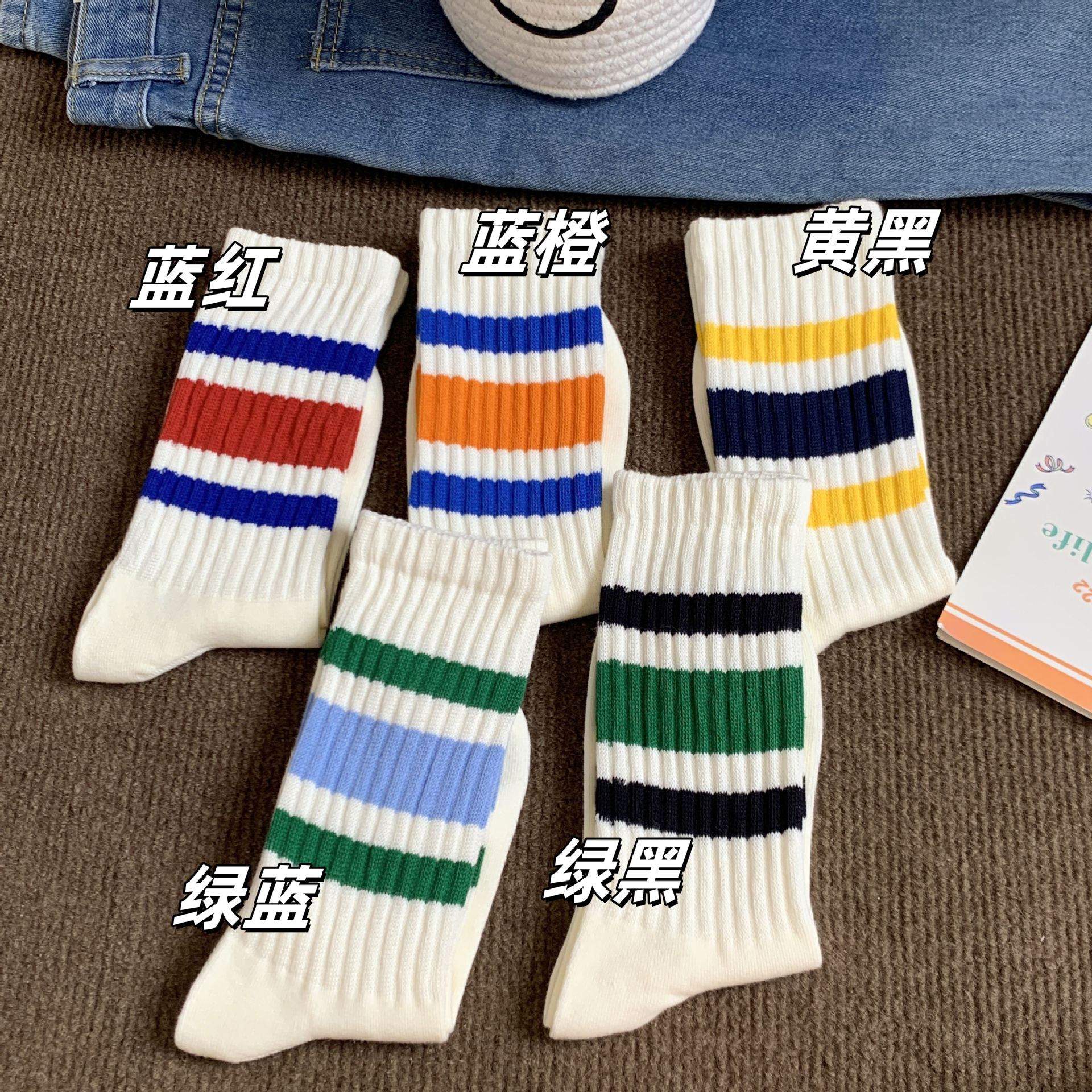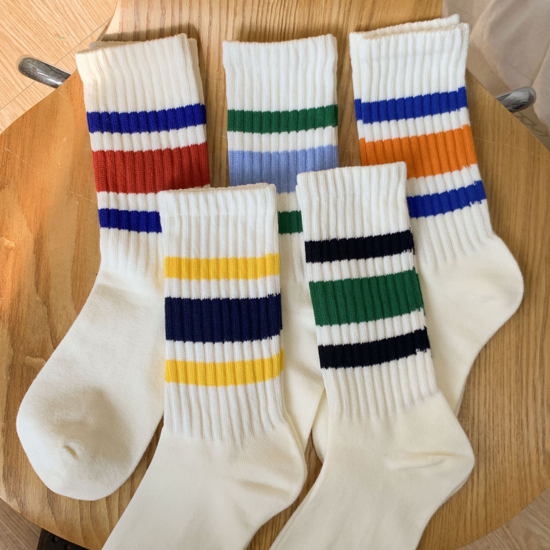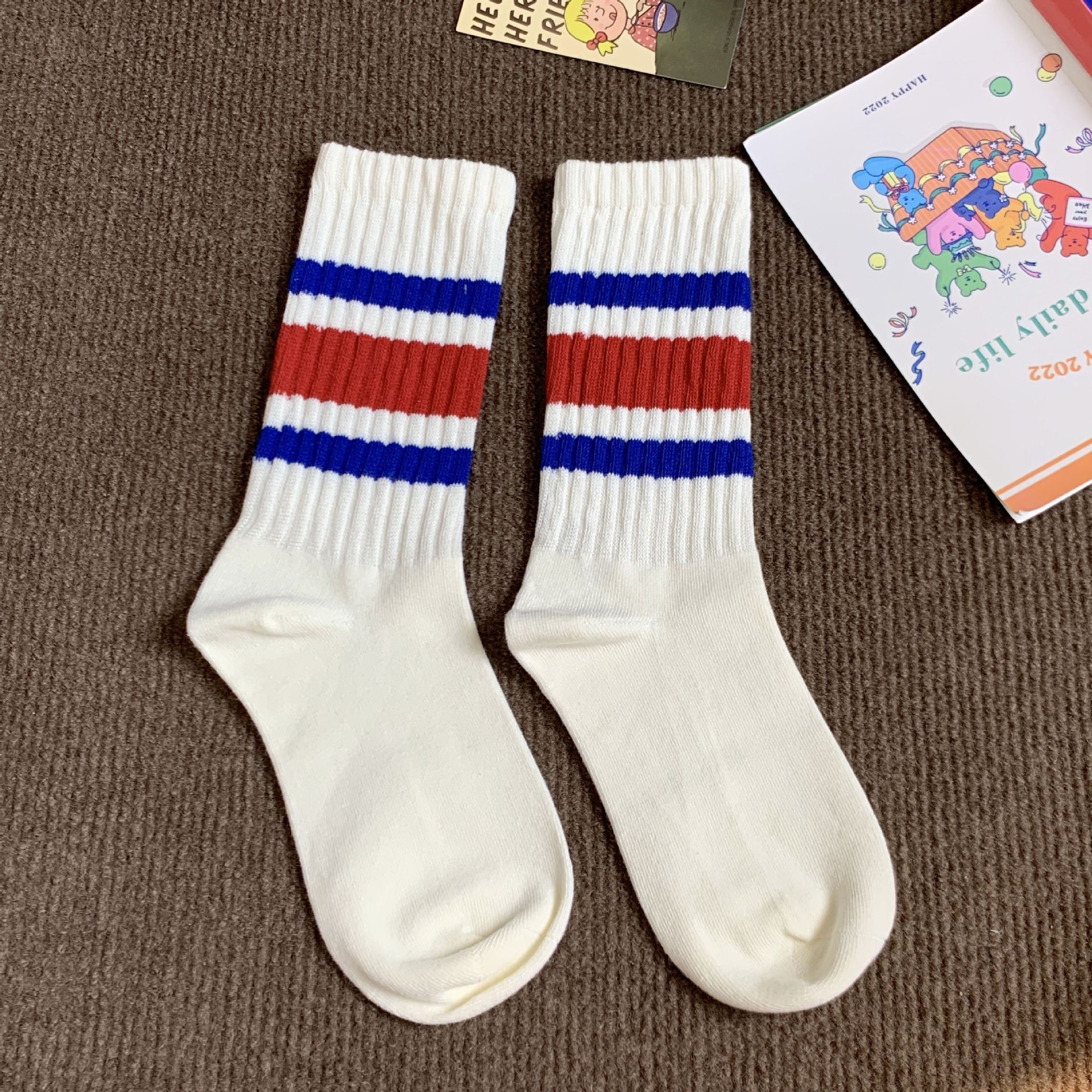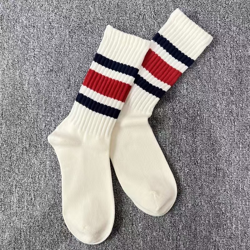 양말 여성의 중립 가을과 겨울 땀 흡수성 테리 스트라이프 스태킹 양말 Ins 트렌디 한 커플 스포츠 대비 컬러 미드 양말