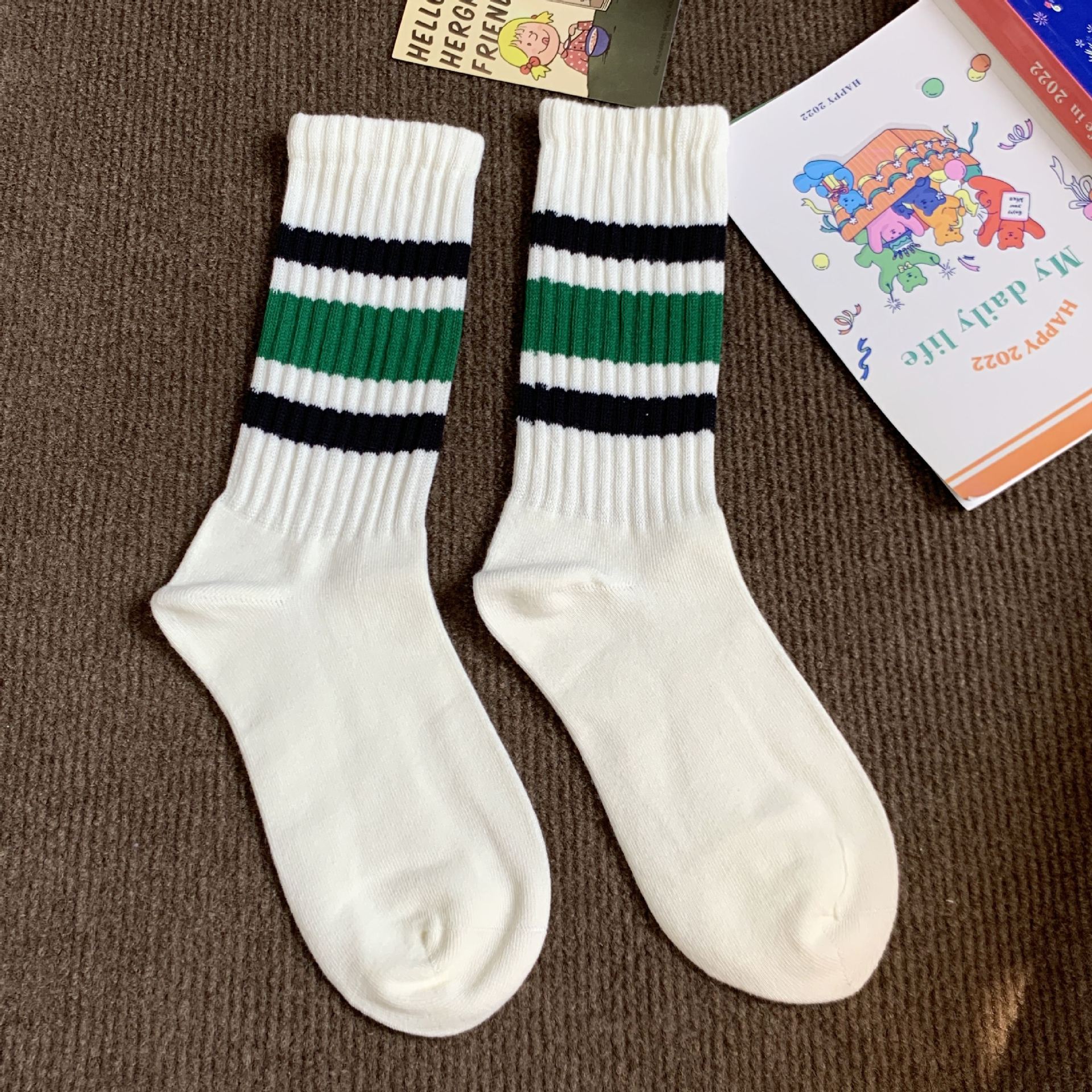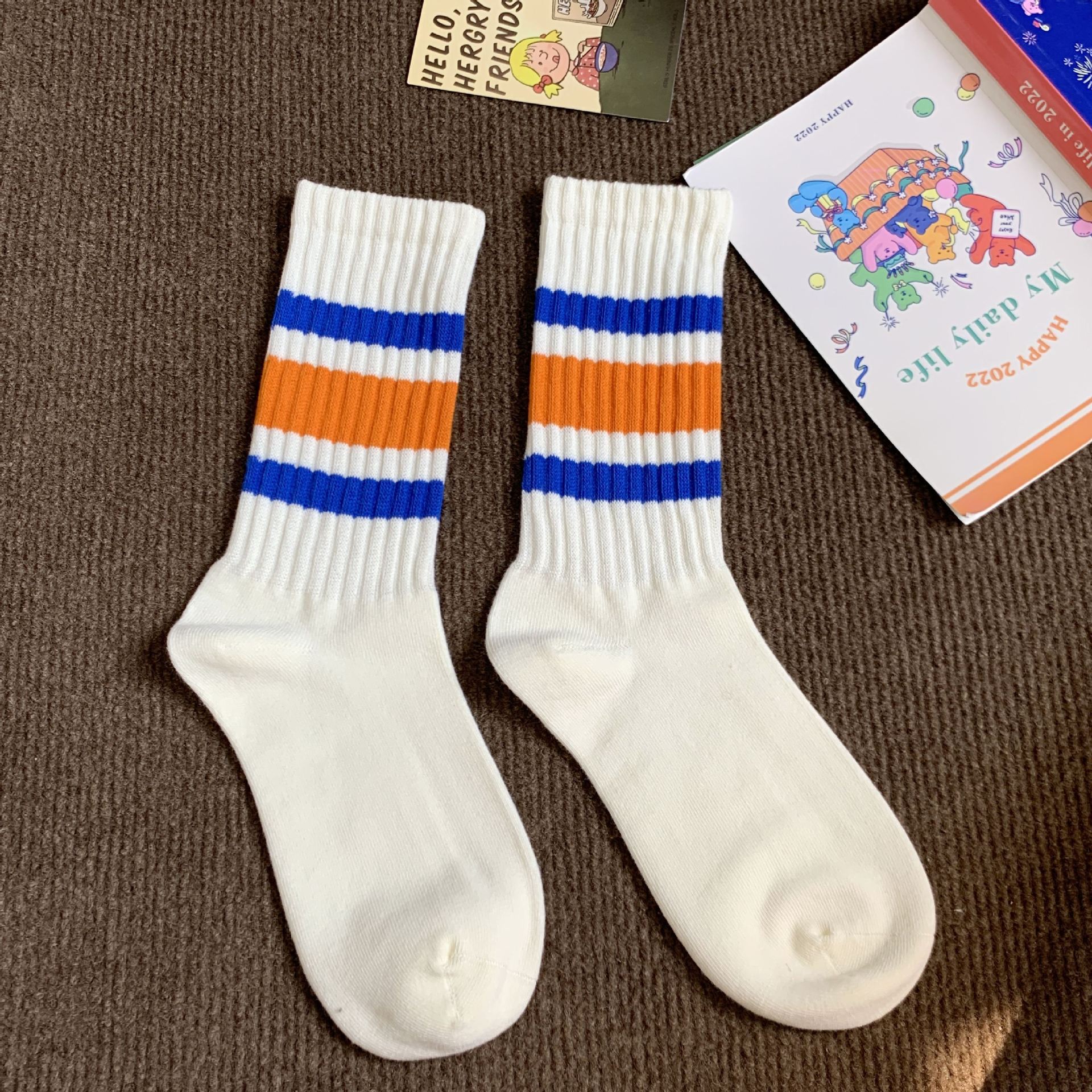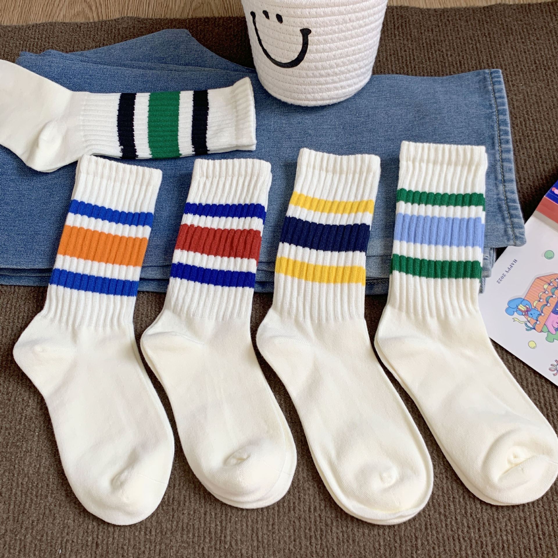 양말 여성의 중립 가을과 겨울 땀 흡수성 테리 스트라이프 스태킹 양말 Ins 트렌디 한 커플 스포츠 대비 컬러 미드 양말