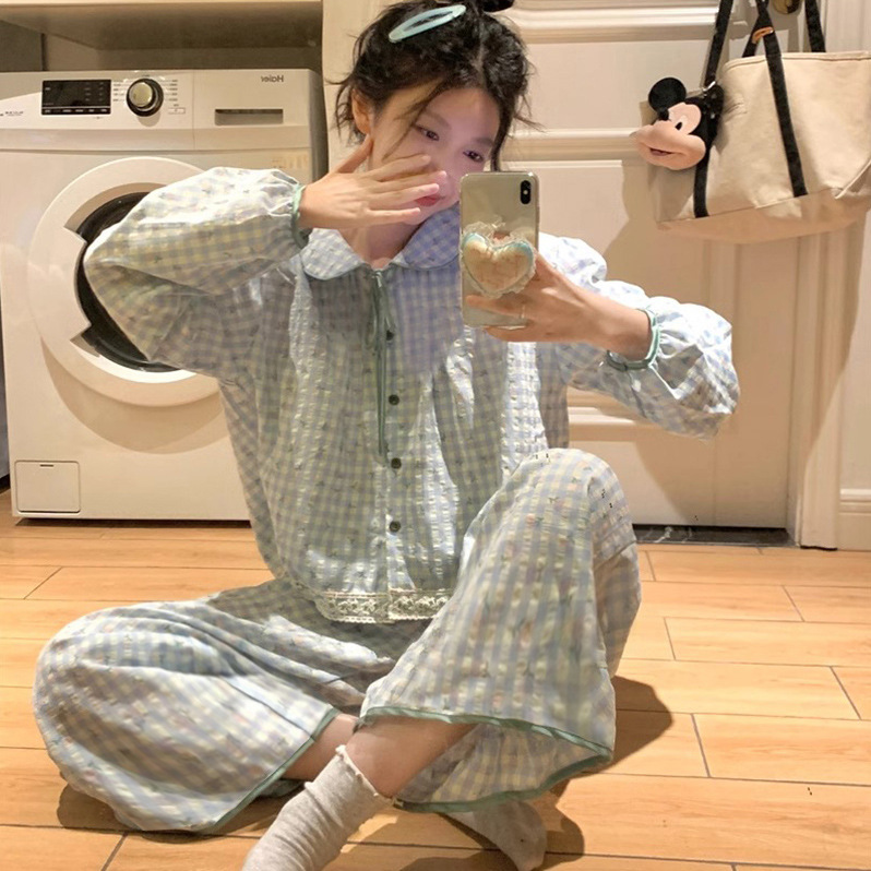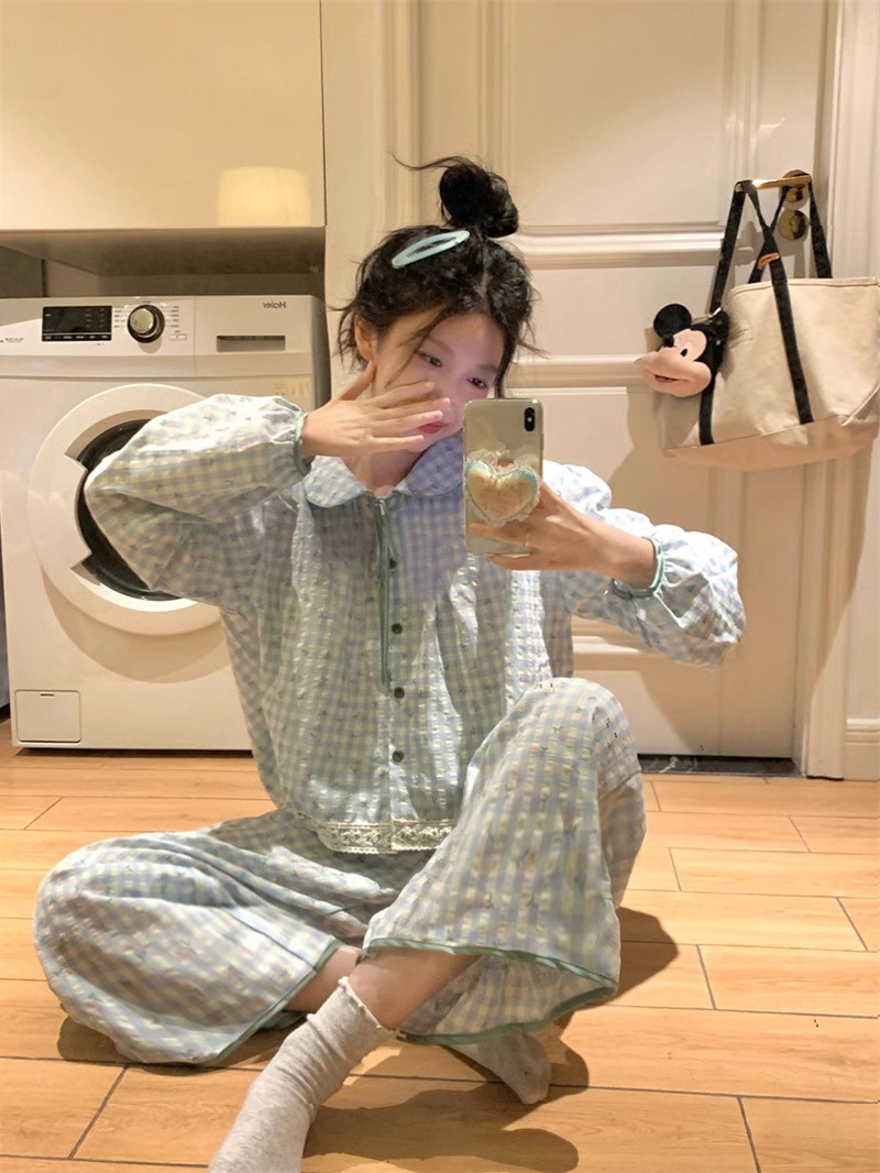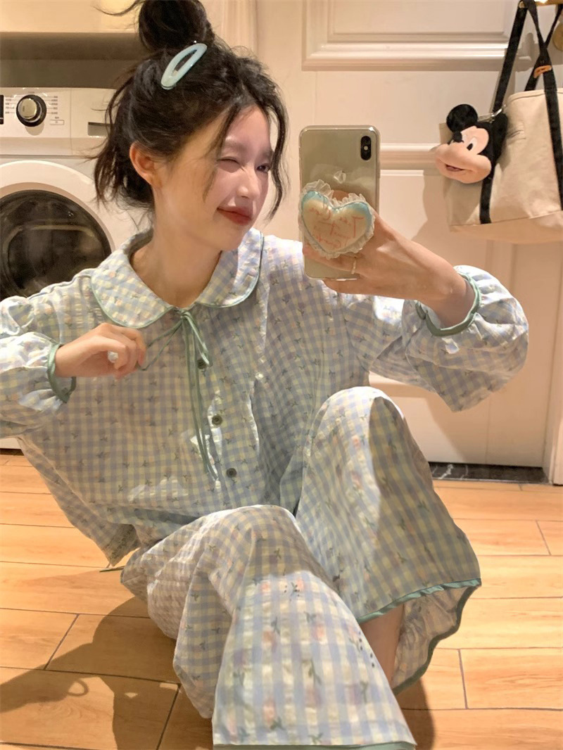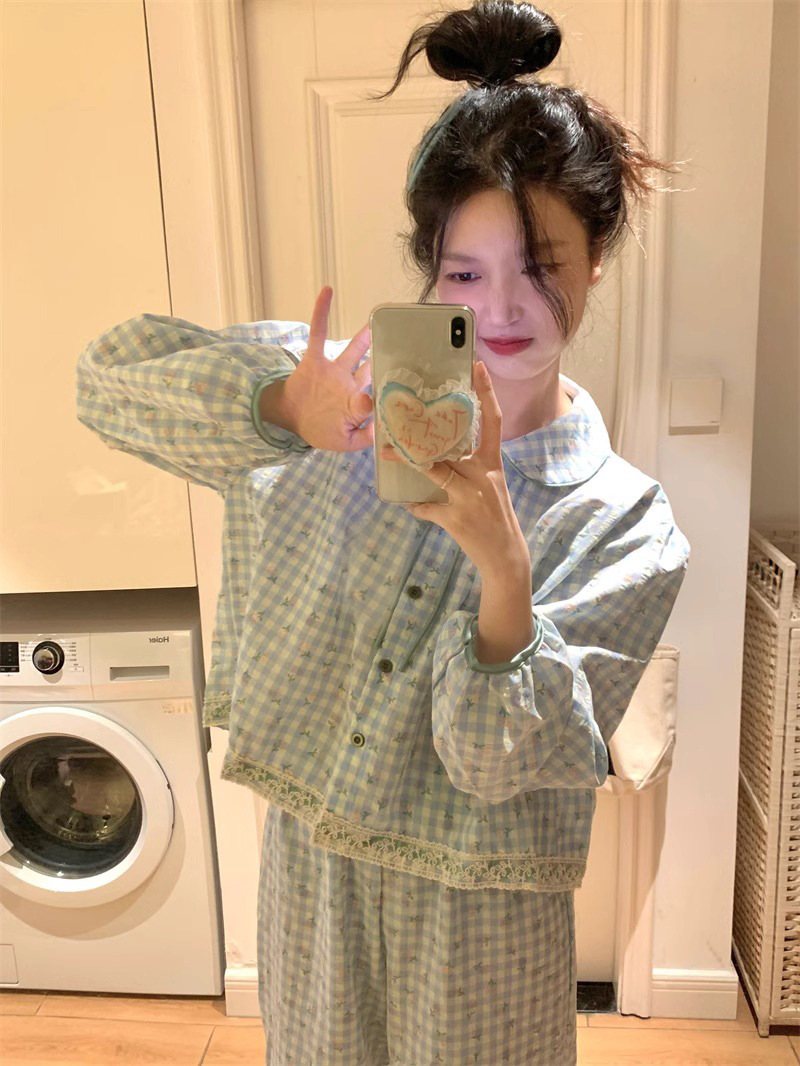 한국 인터넷 연예인 Ins 스타일 꽃 무늬 잠옷 여성 봄과 가을 달콤한 귀여운 학생 긴 소매 세트 홈 옷스토어 가기