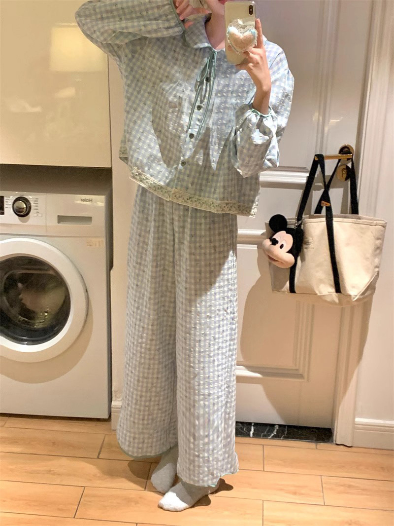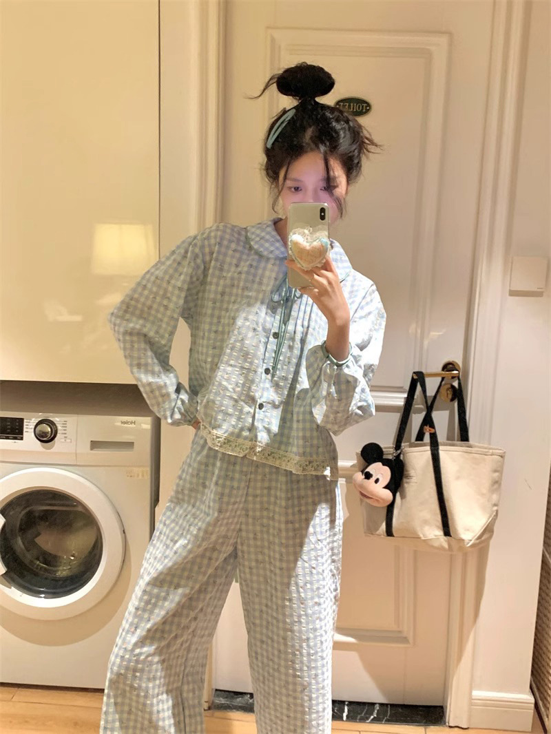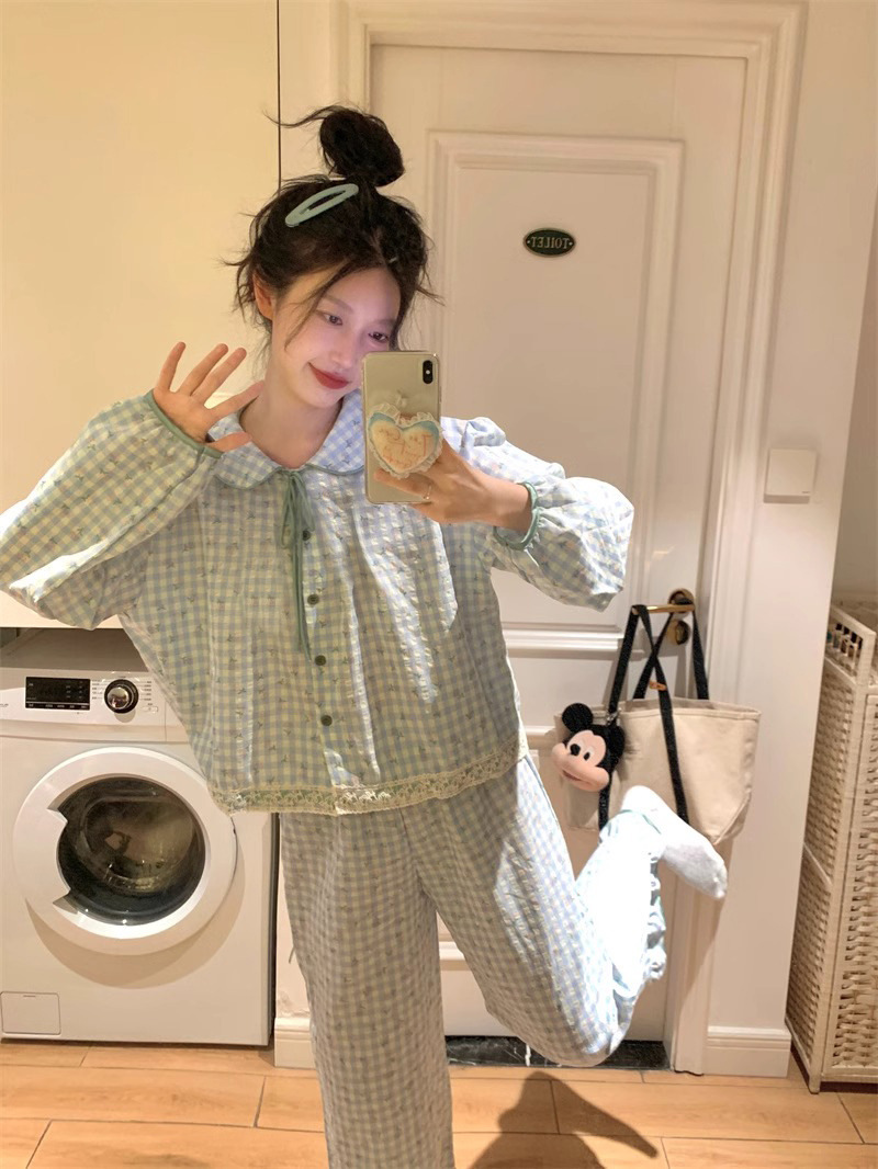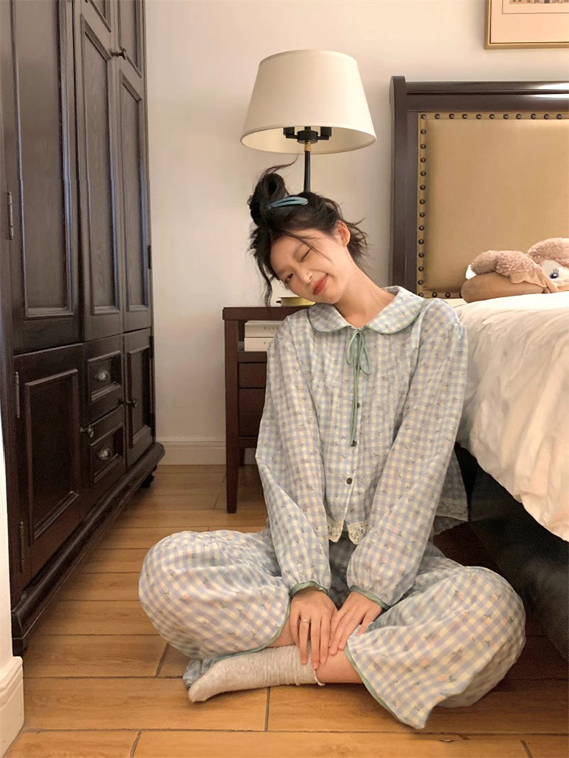 한국 인터넷 연예인 Ins 스타일 꽃 무늬 잠옷 여성 봄과 가을 달콤한 귀여운 학생 긴 소매 세트 홈 옷스토어 가기