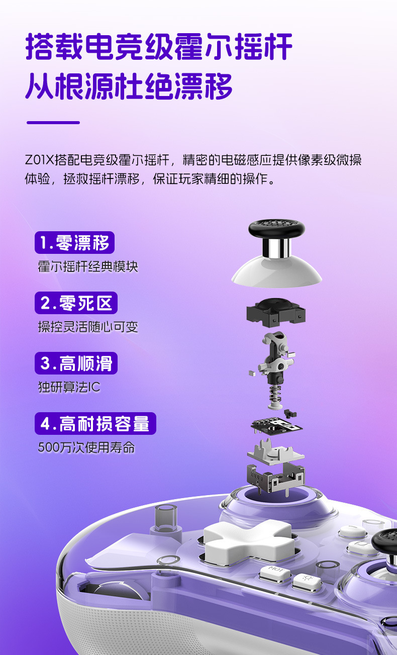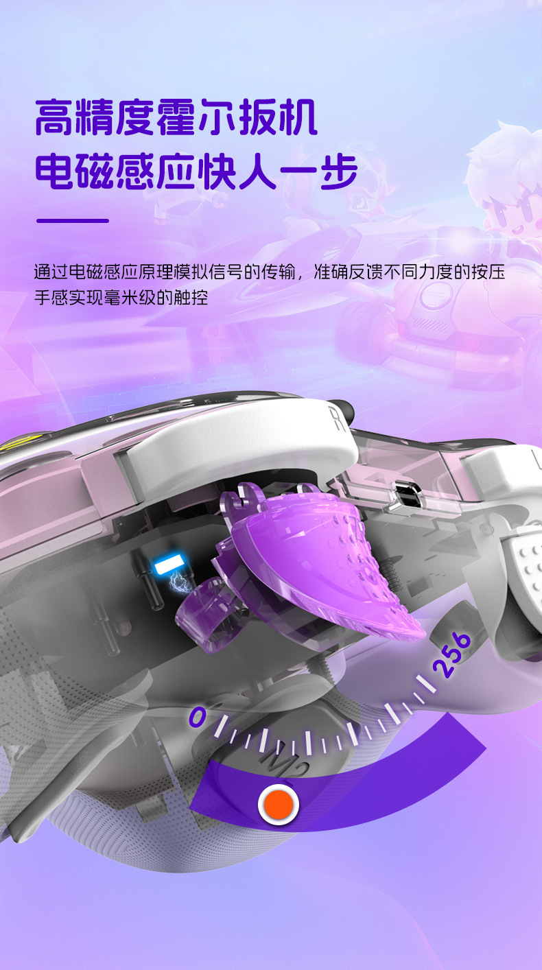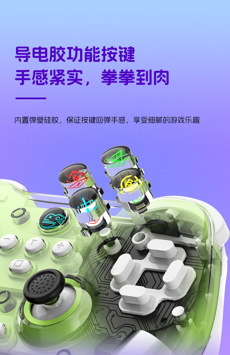 2.搭载霍尔摇杆;霍尔扳机;导电胶功能按键,内置弹壁硅胶,保证按键回弹手感,享受细腻的游戏乐趣。