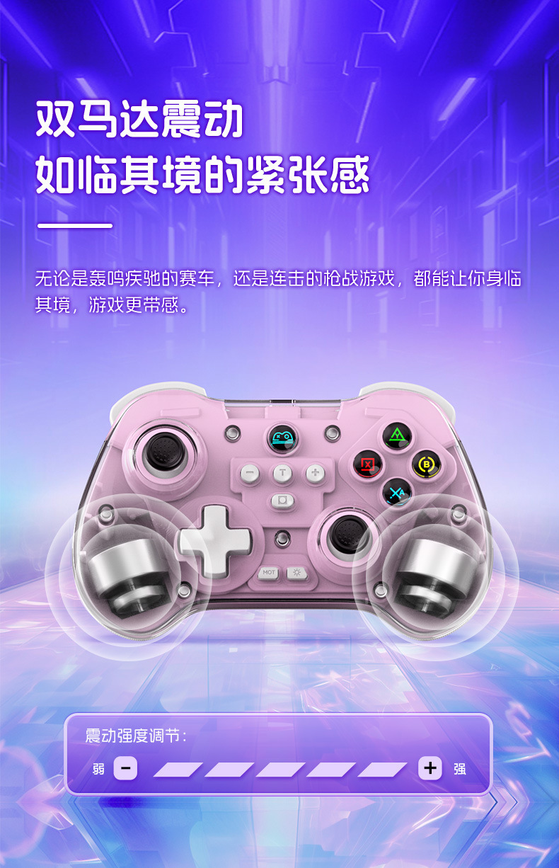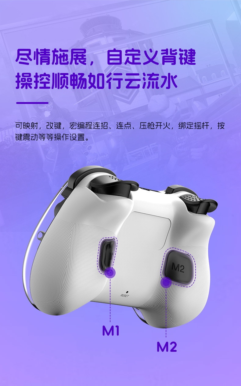 4.带自定义宏编程背键、六轴体感陀螺仪、HD双震动马达可调节,TURBO一键连发。