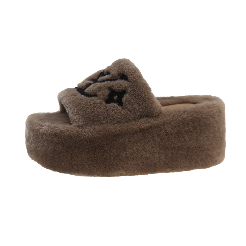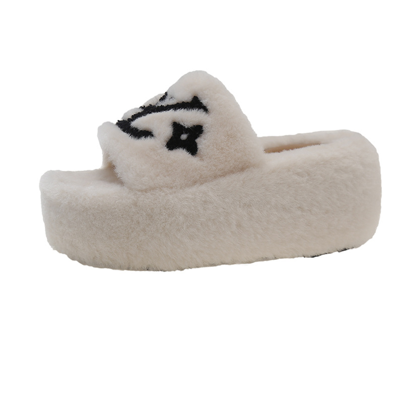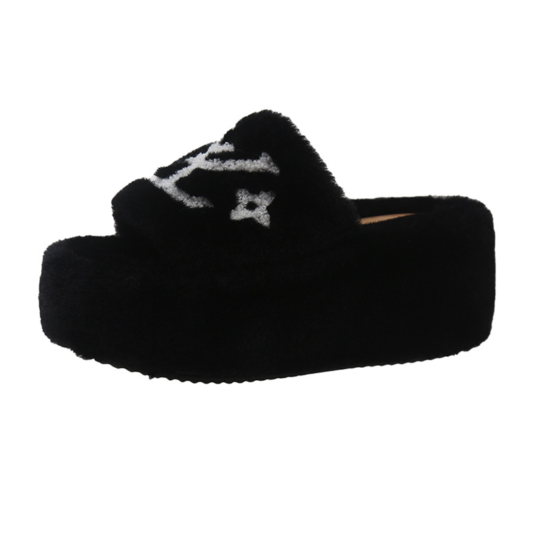 2025 가을 겨울 신상 8CM 두꺼운 밑창 레터링 퍼 슬리퍼, 외출용 샤넬 스타일 양털 슬리퍼 여성용스토어 가기