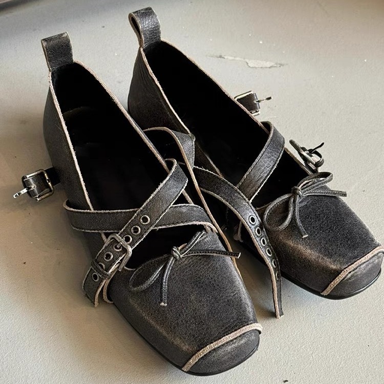 Cowhide 버전 ~ 레트로 활 벨트 버클 발레 신발 여성의 새로운 한국 스타일 돼지 코 메리 제인 신발 여성