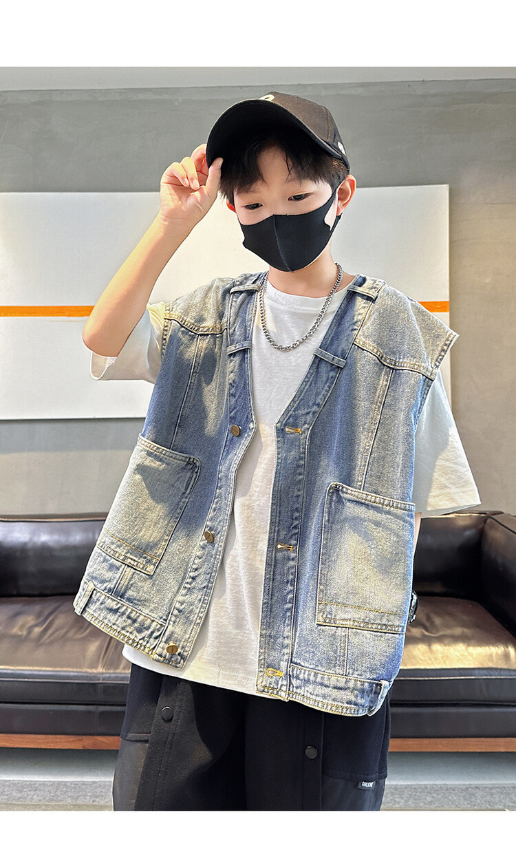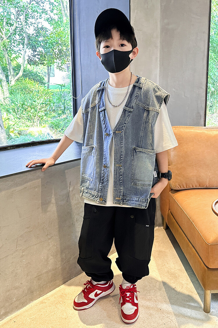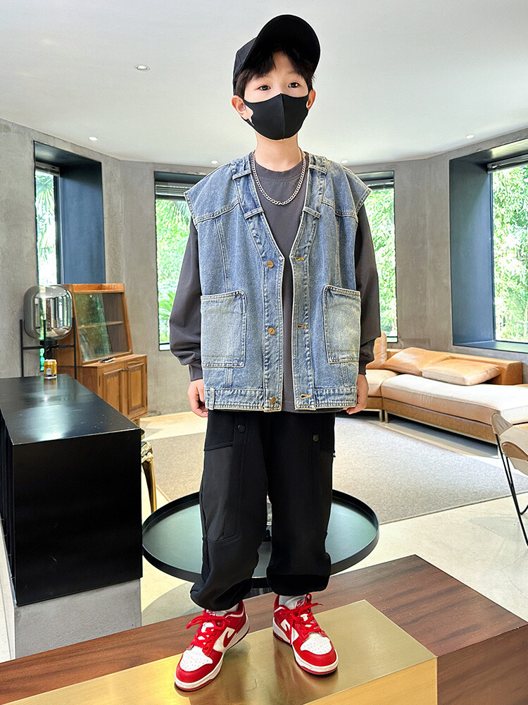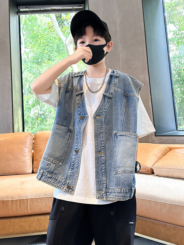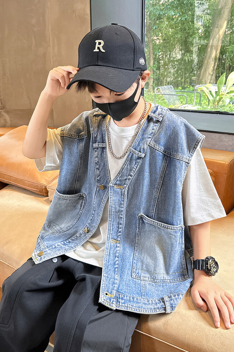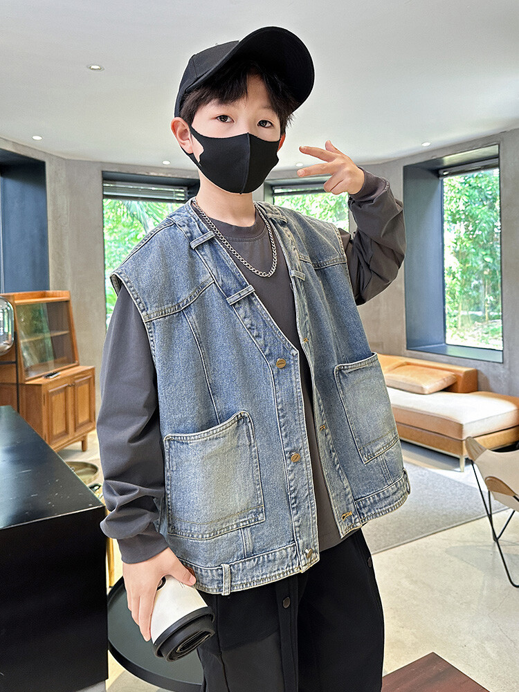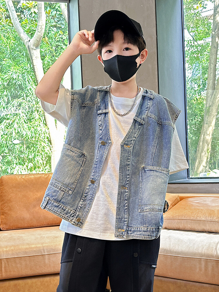 대외 무역 소년들의 트렌디 한 쿨소 조끼 빅 키즈 웨스턴 스타일 봄과 가을 올 매치 탑을위한 세련된 민소매 작업복 조끼스토어 가기