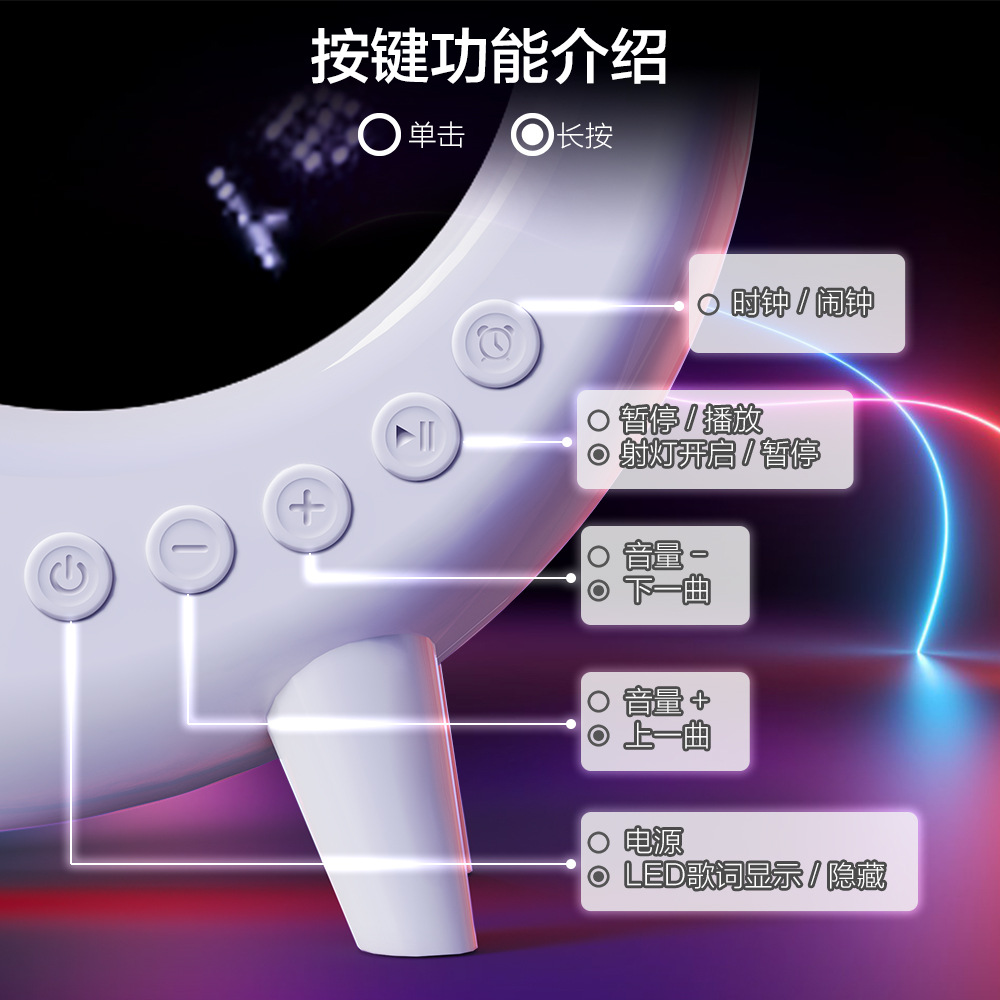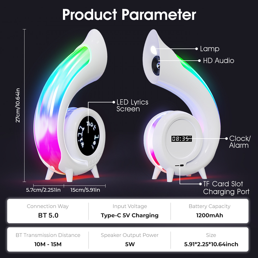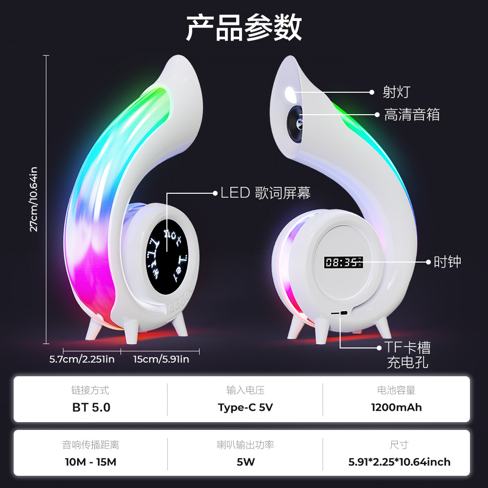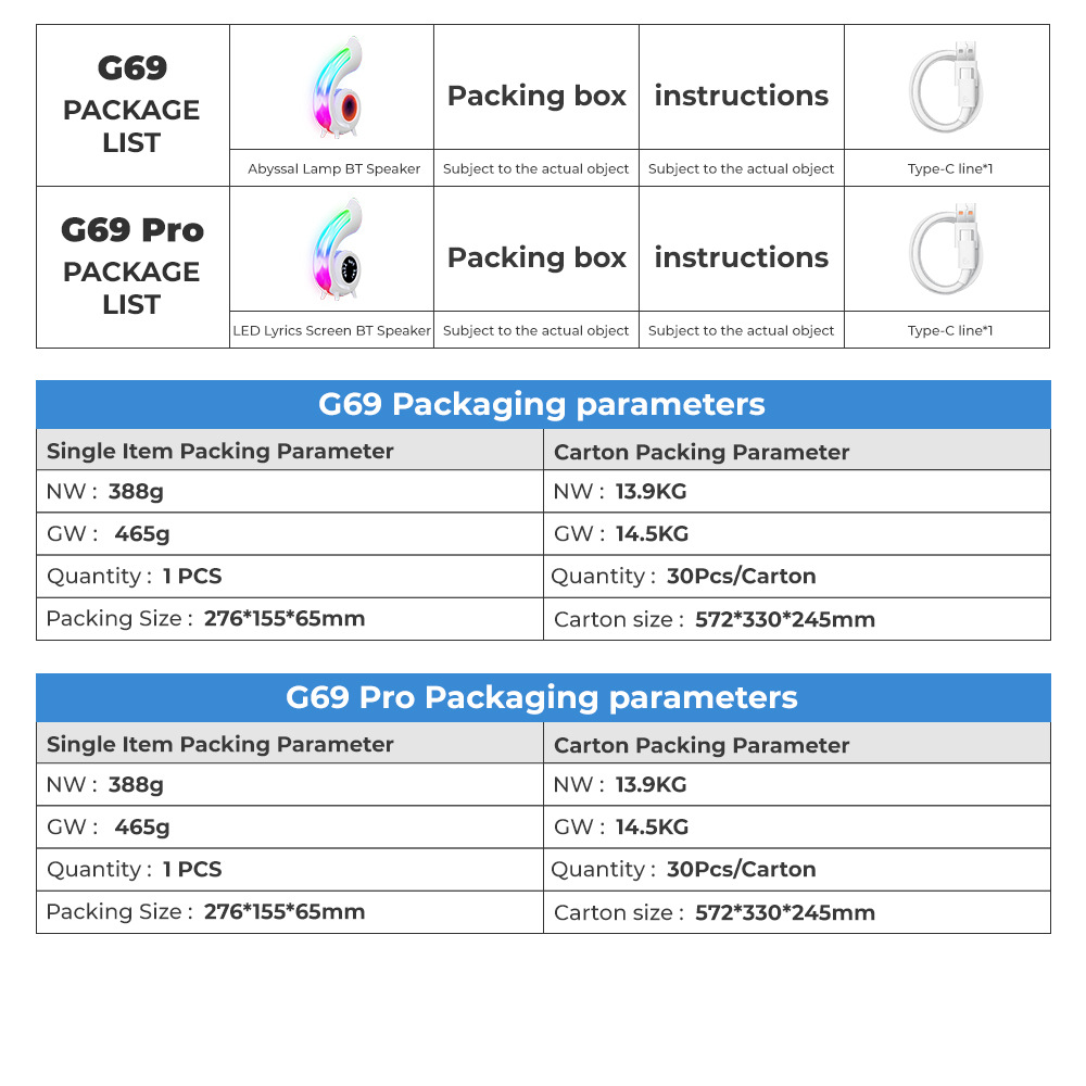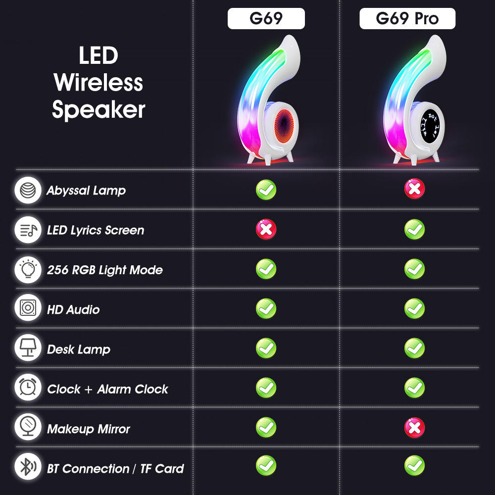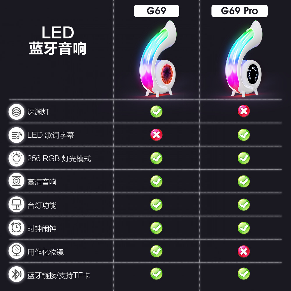 功能:BT,TF,时钟,闹钟,深渊灯(G69)/歌词字幕(G69 PRO),化妆镜,256种炫彩灯,Type-C插口。