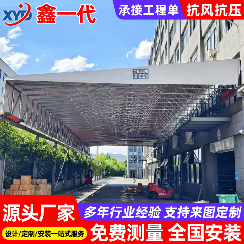 工厂架空型遥控电动雨篷 屋顶悬空收缩推拉蓬 仓库卸货区移动雨棚