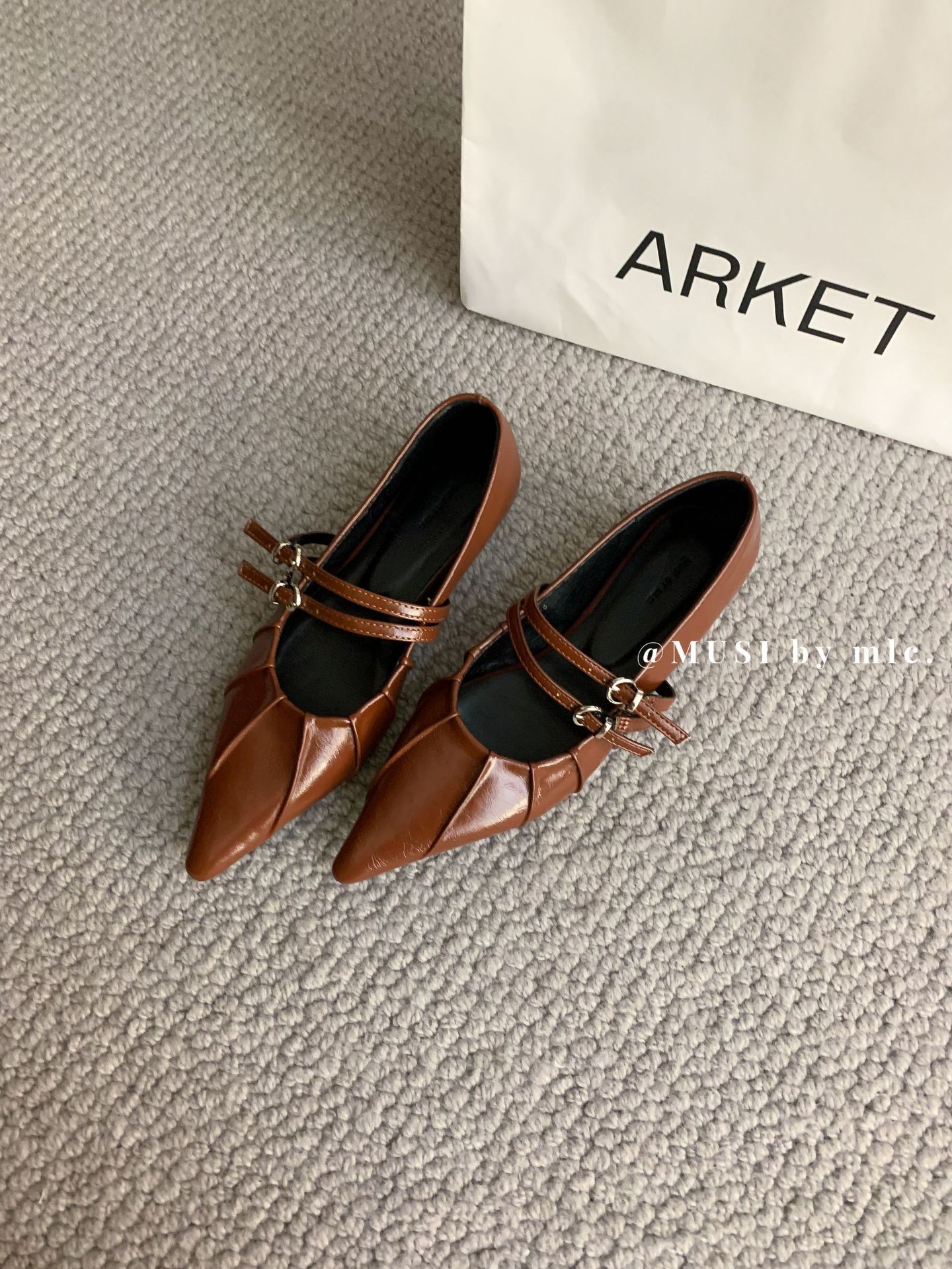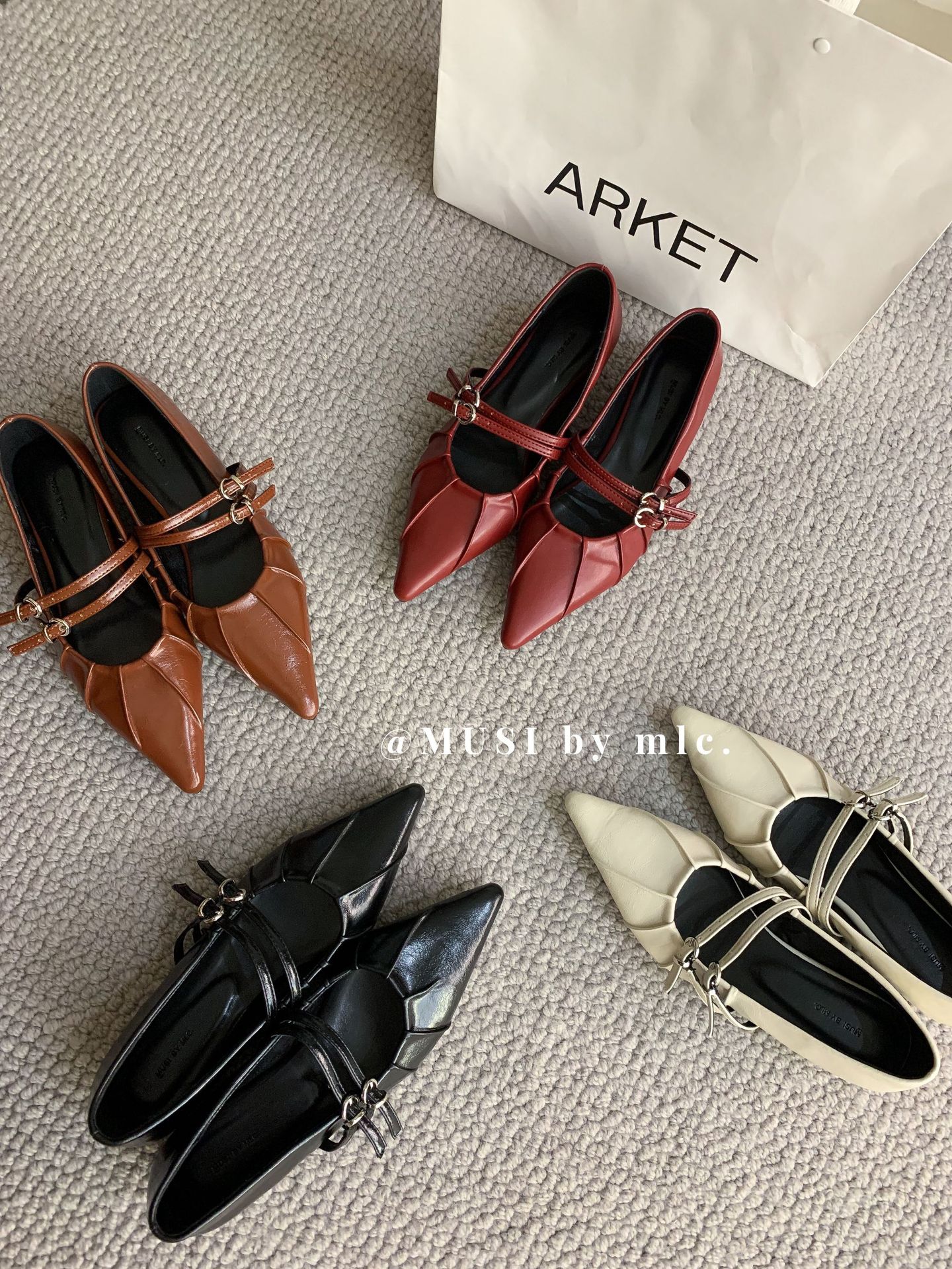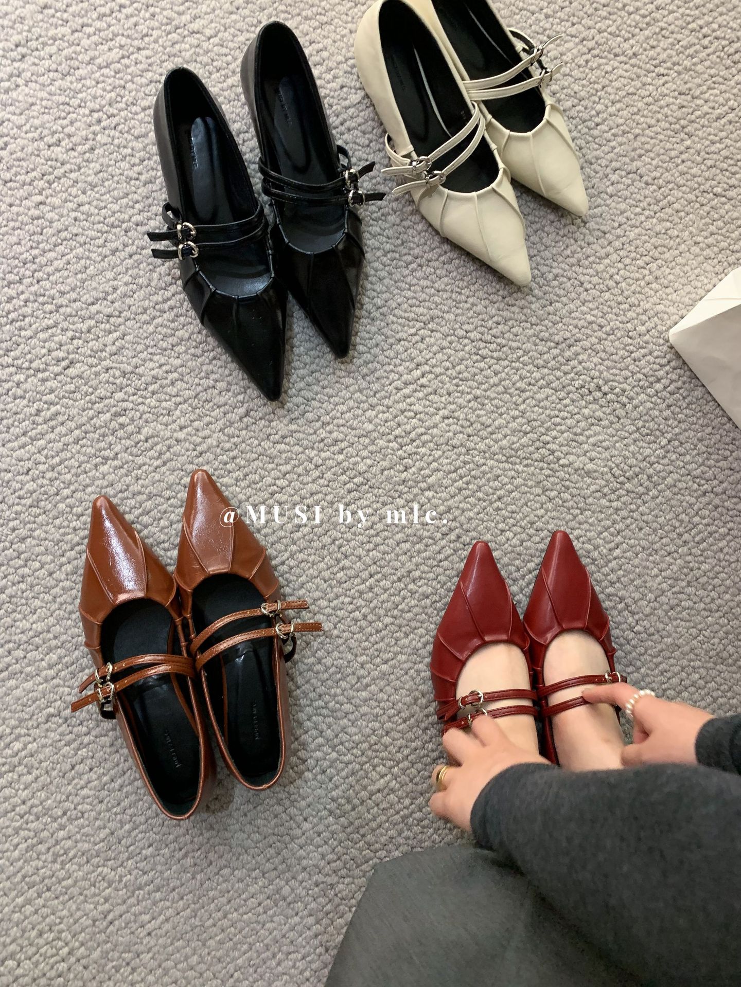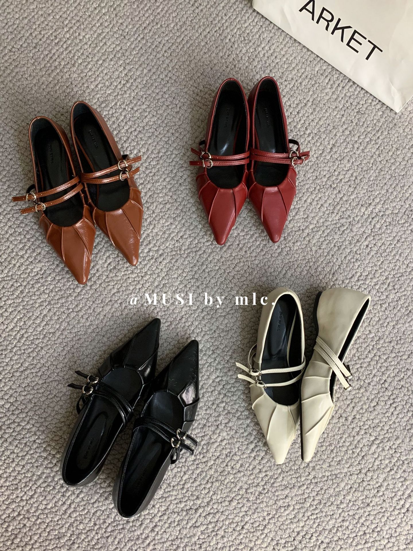 2024 새로운 가을 스타일 뾰족한 앞코 가죽 벨트 버클 소프트 솔 슬립온 여성용 다용도 비니 발레 슈즈스토어 가기