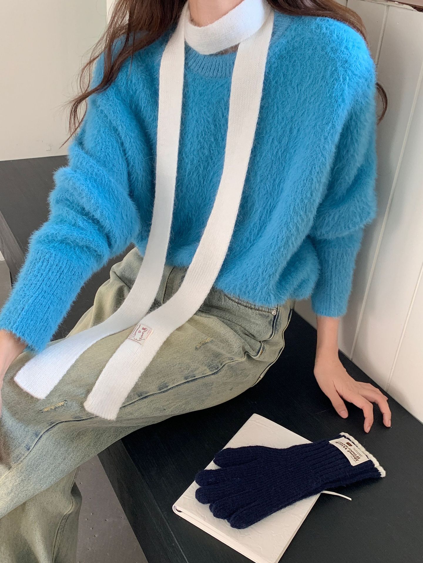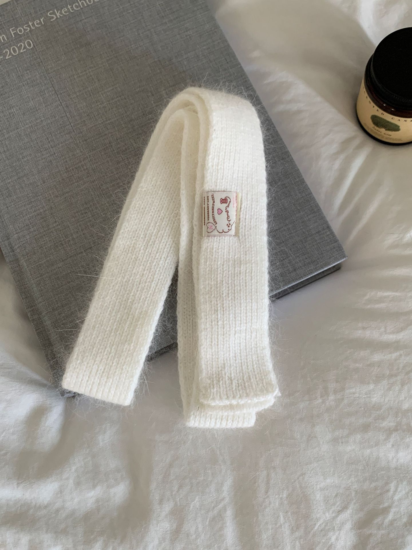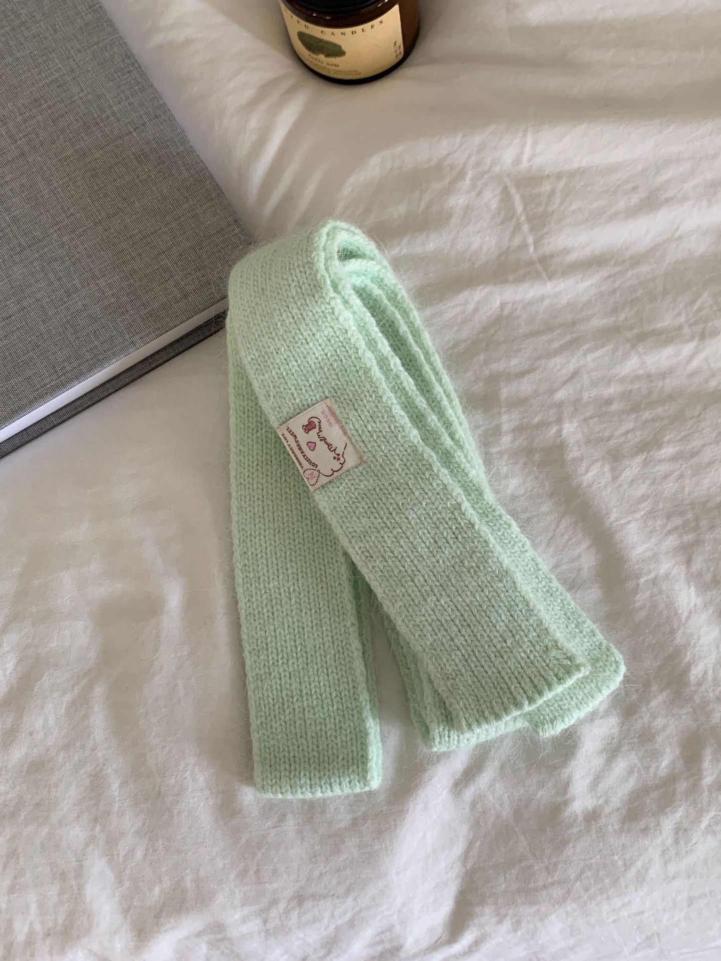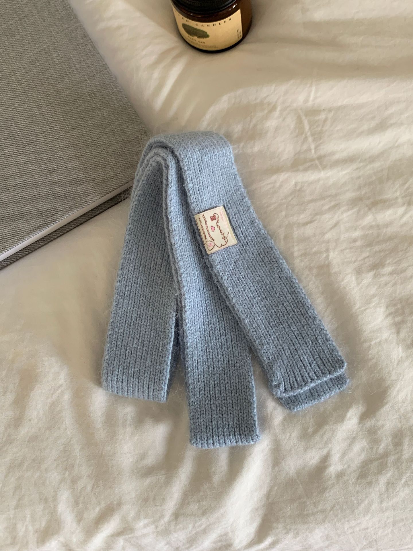 마카롱 컬러의 부드러운 만화 직물, 토끼털이 들어간 좁고 긴 스카프, 밀레니얼 스타일의 작은 스카프, 겨울 학생