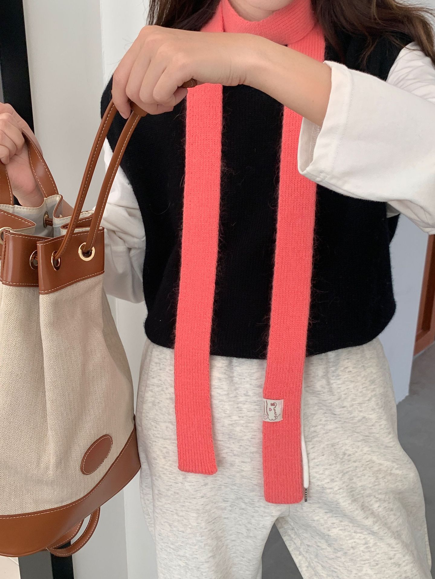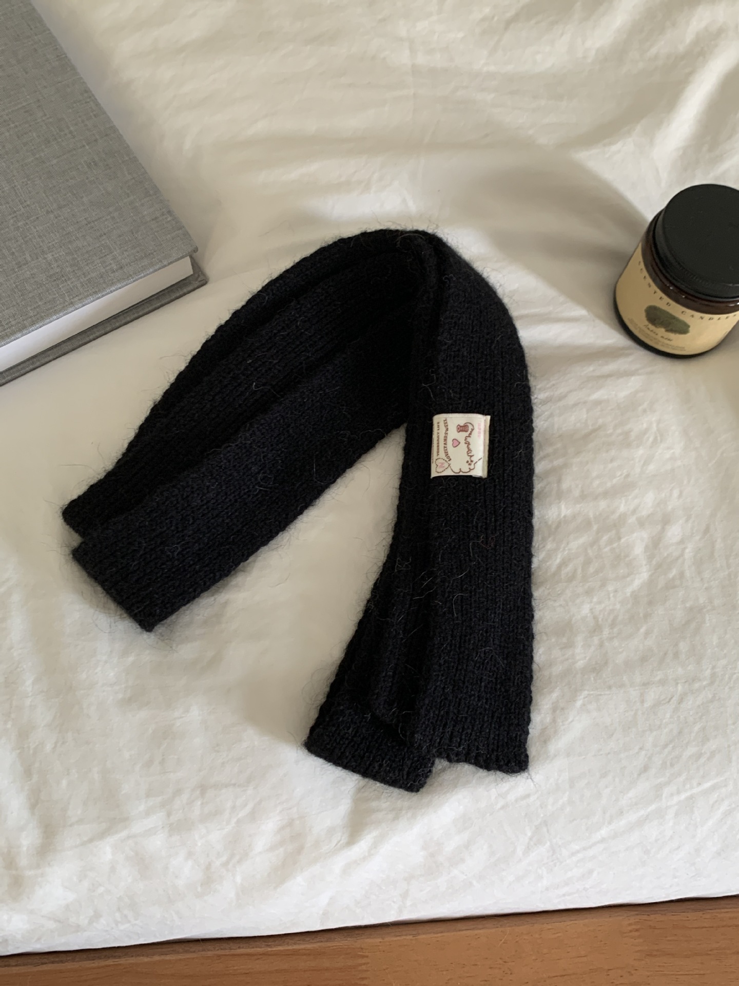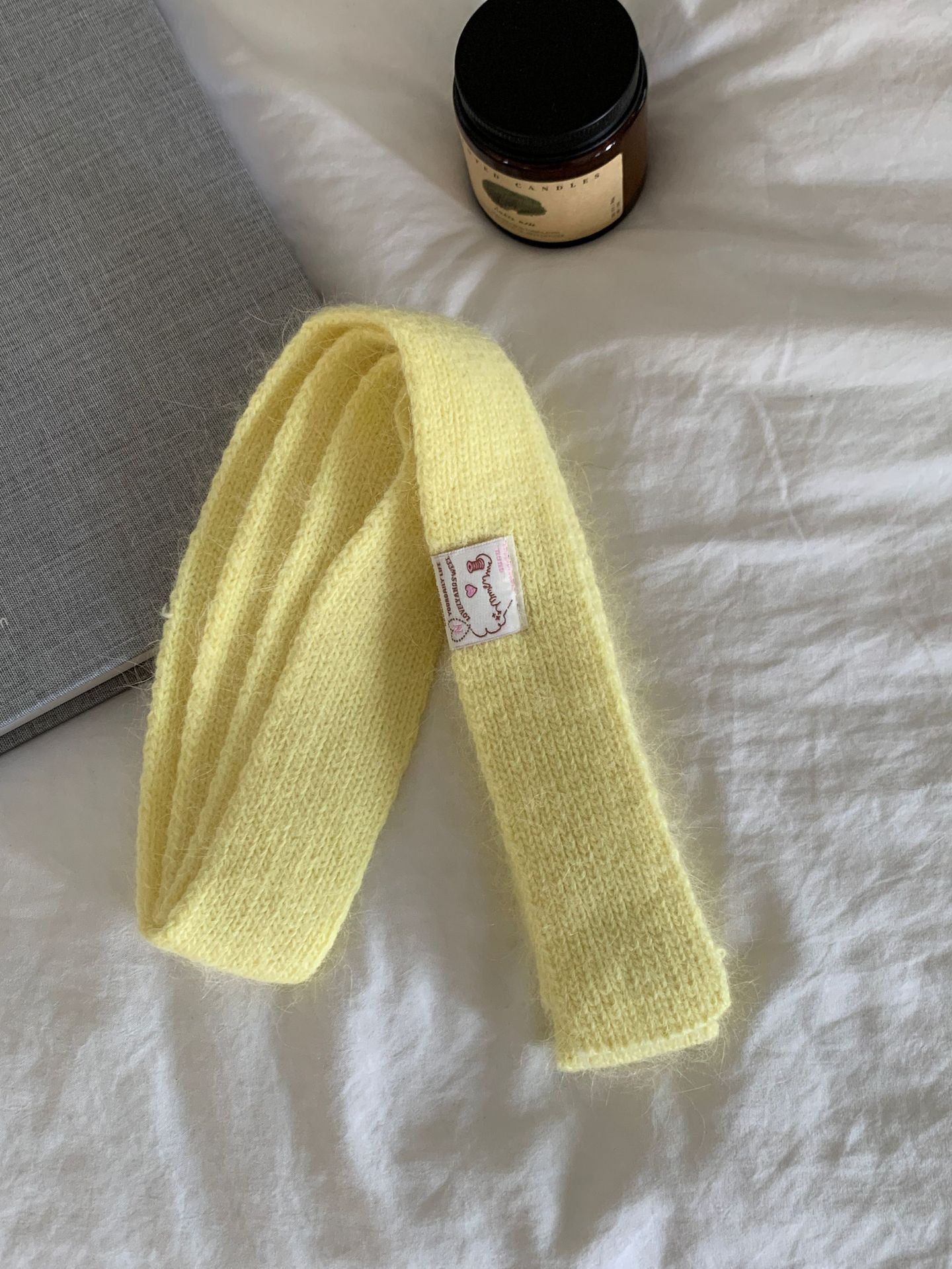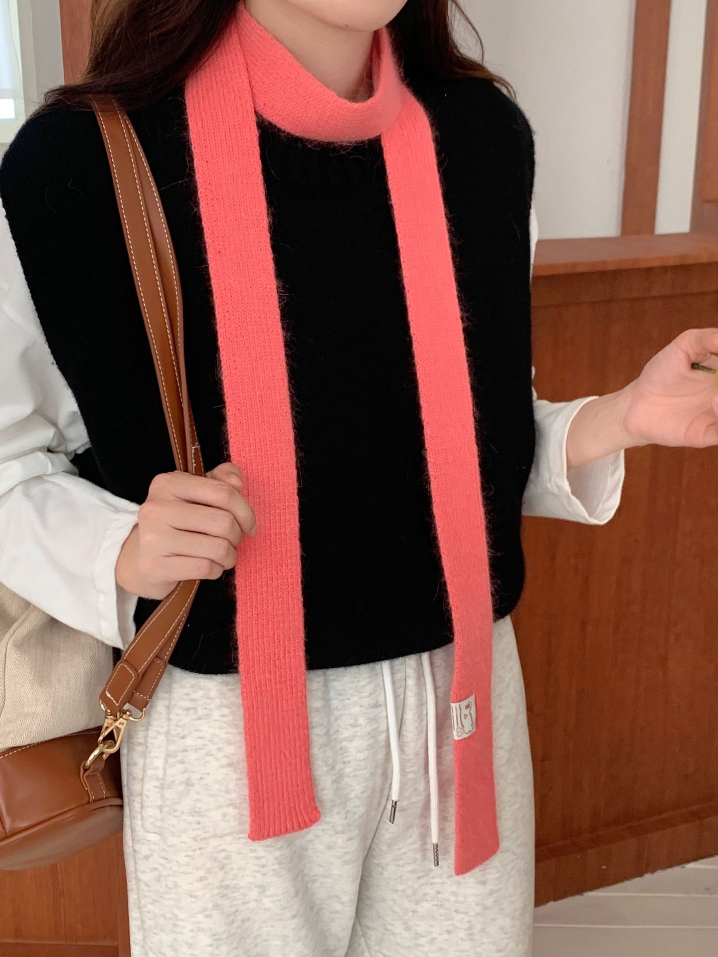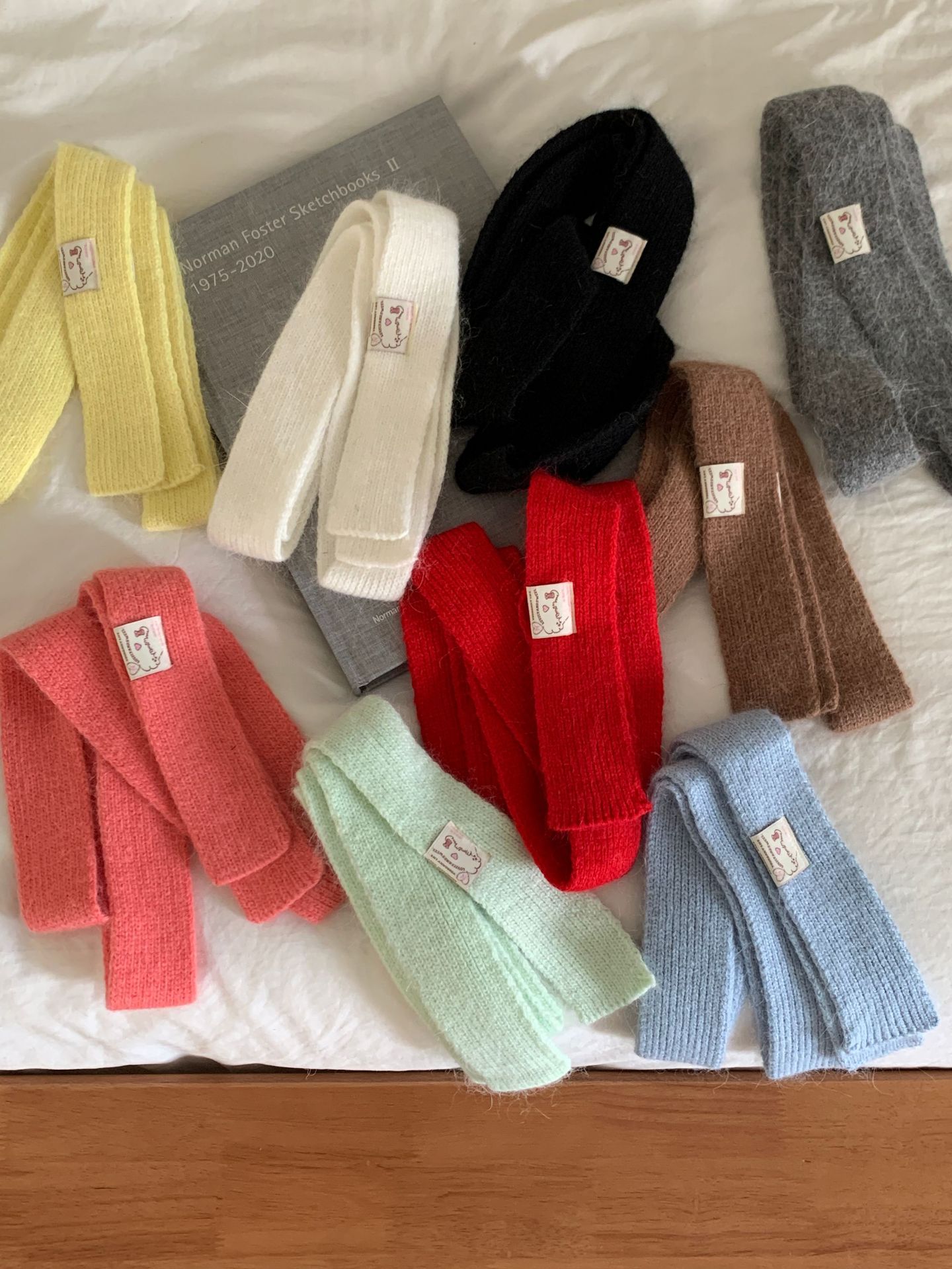마카롱 컬러의 부드러운 만화 직물, 토끼털이 들어간 좁고 긴 스카프, 밀레니얼 스타일의 작은 스카프, 겨울 학생