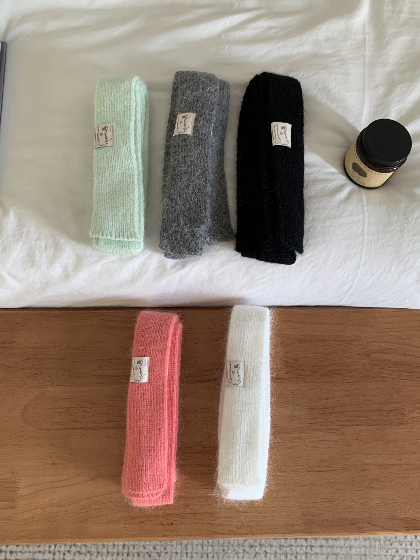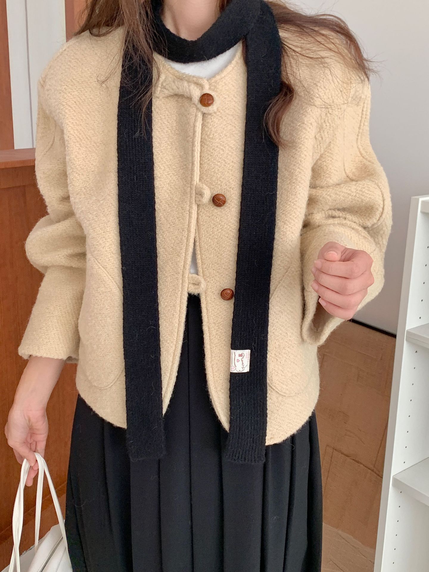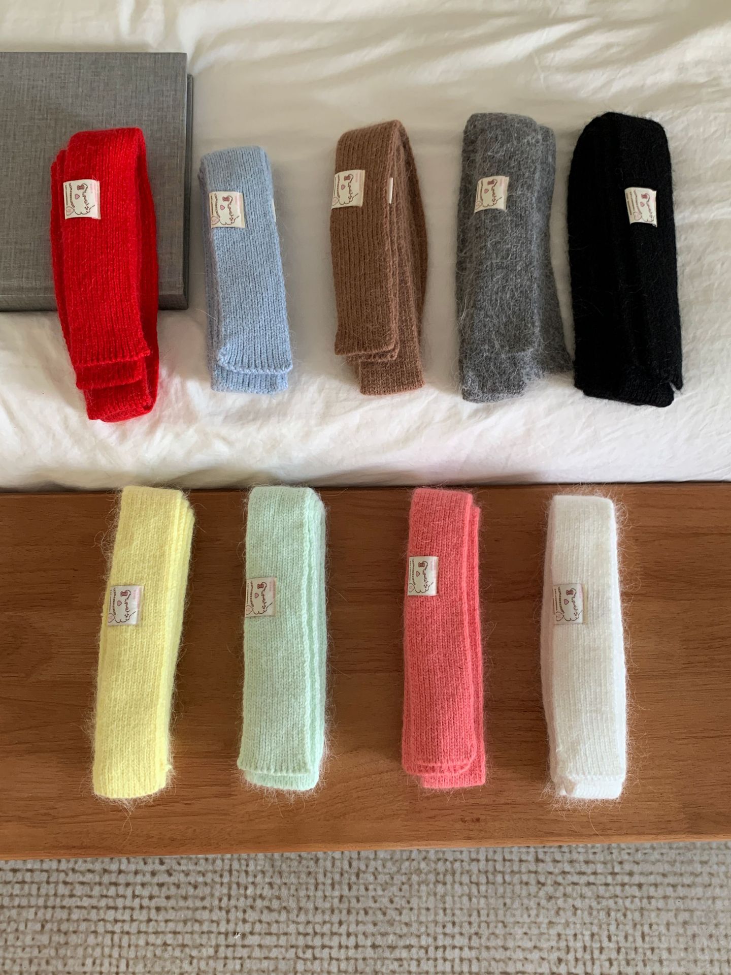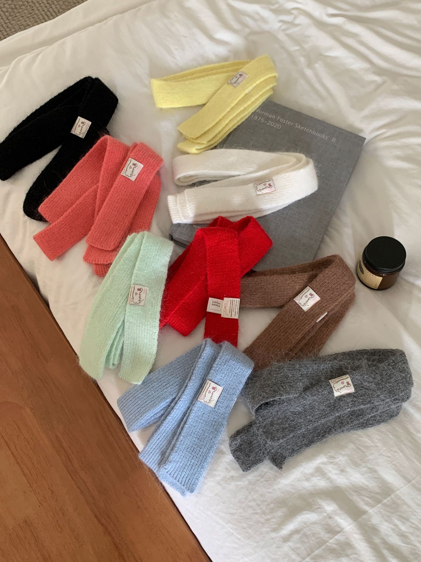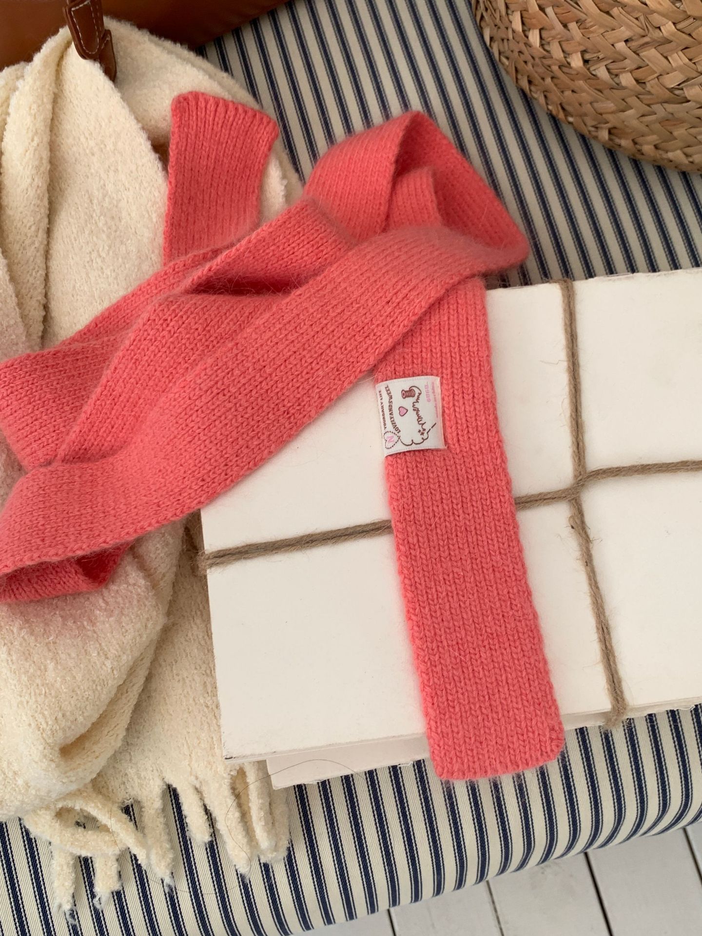 마카롱 컬러의 부드러운 만화 직물, 토끼털이 들어간 좁고 긴 스카프, 밀레니얼 스타일의 작은 스카프, 겨울 학생