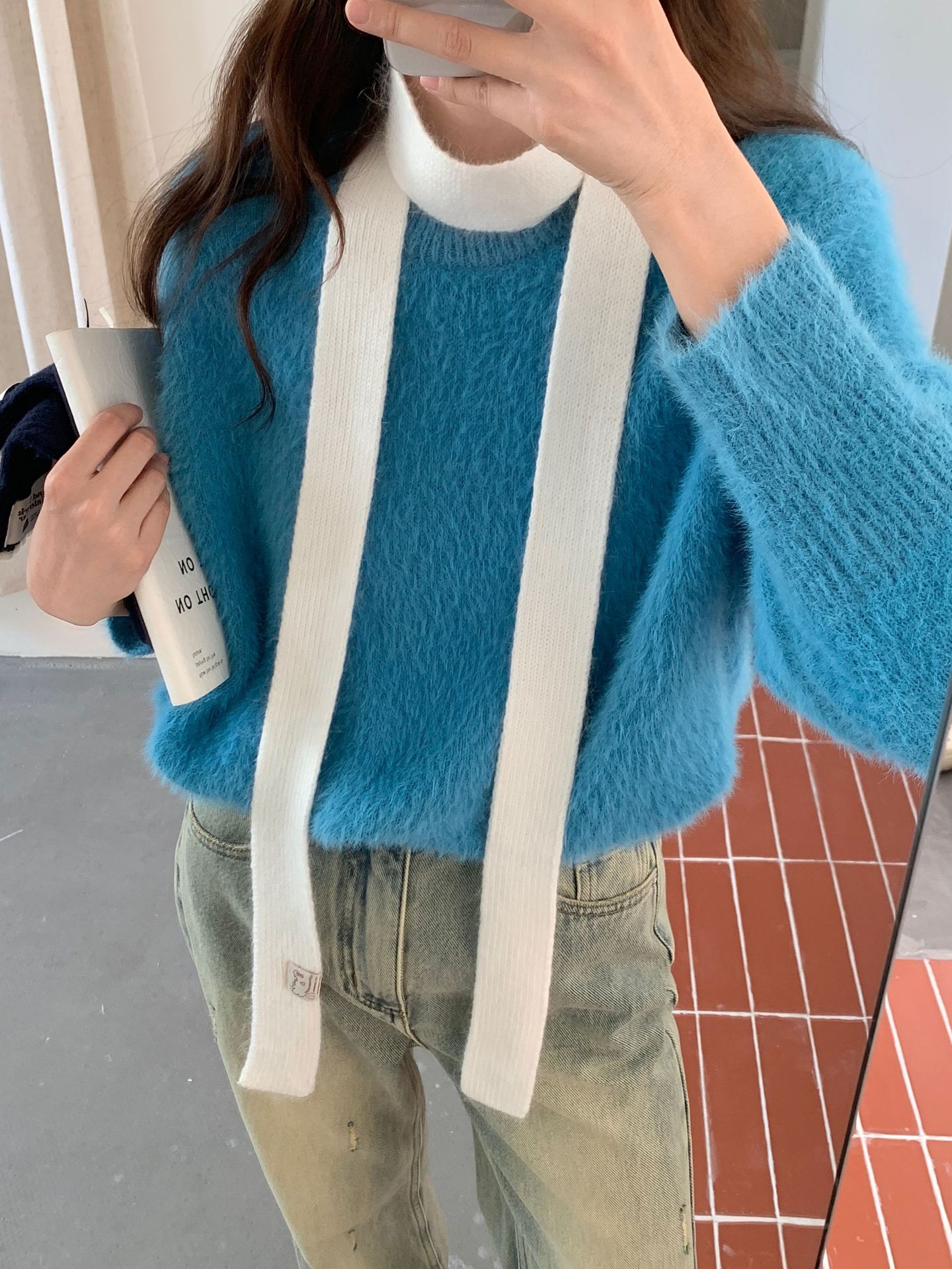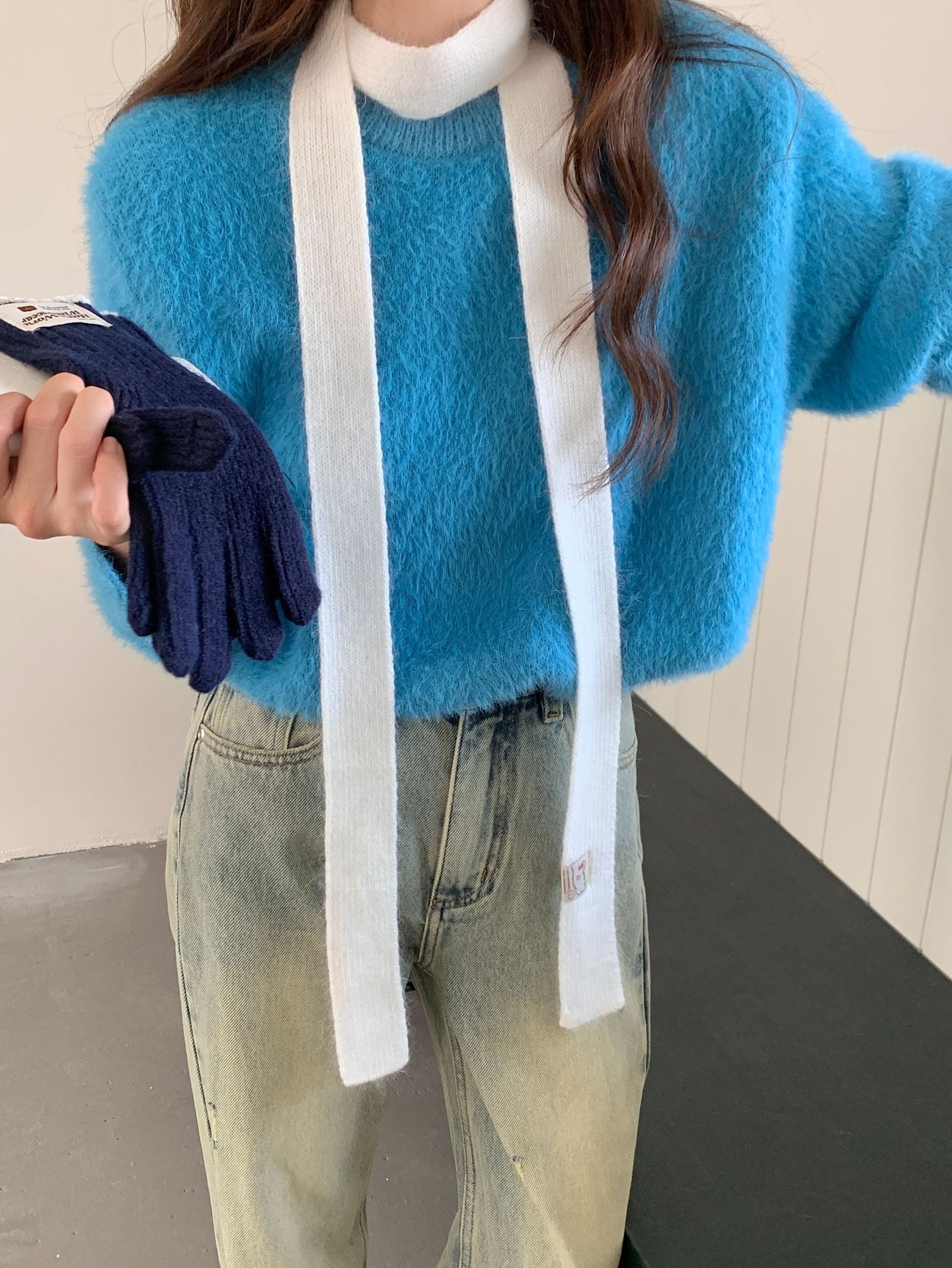 마카롱 컬러의 부드러운 만화 직물, 토끼털이 들어간 좁고 긴 스카프, 밀레니얼 스타일의 작은 스카프, 겨울 학생스토어 가기