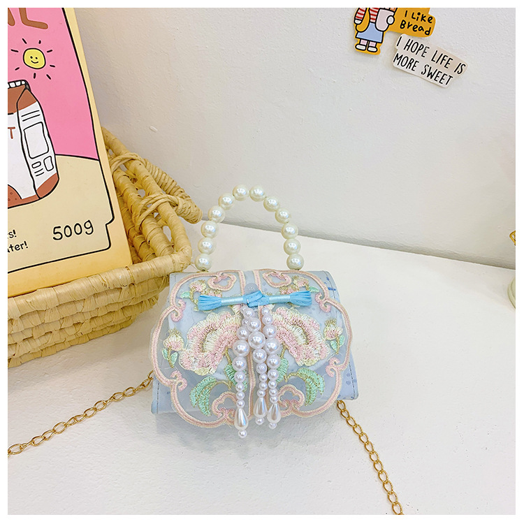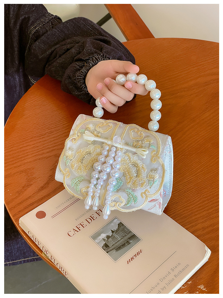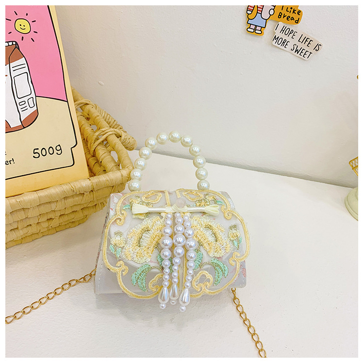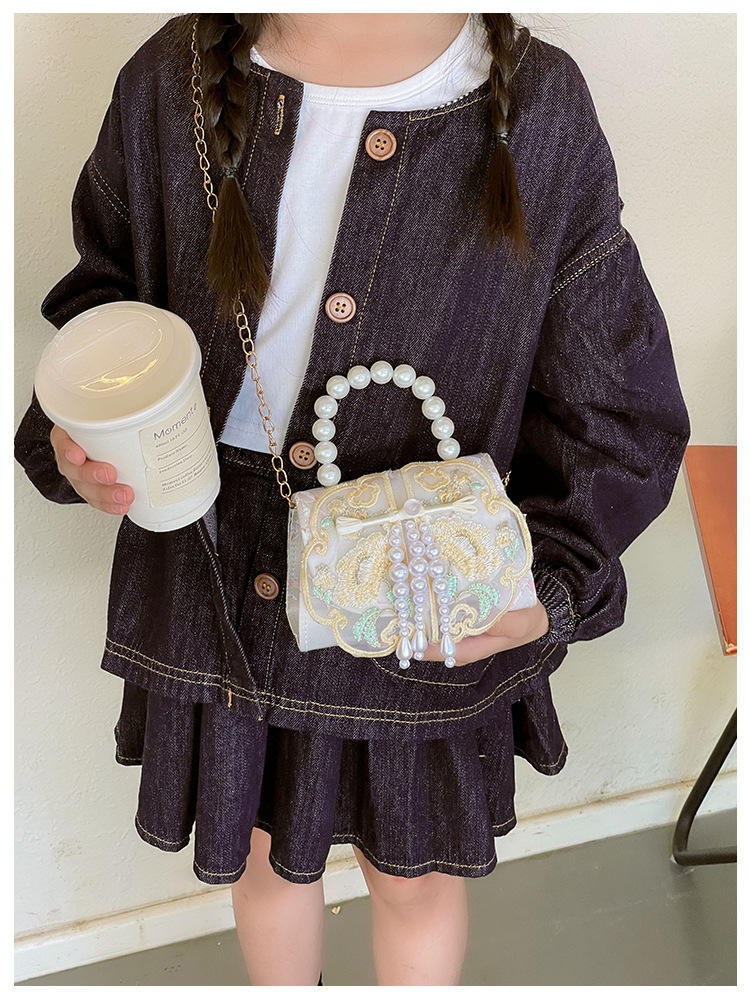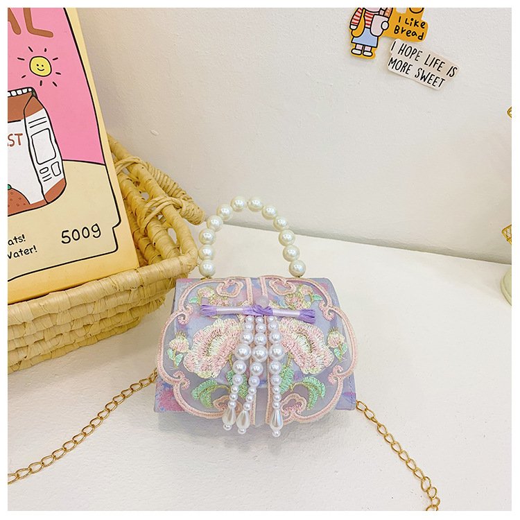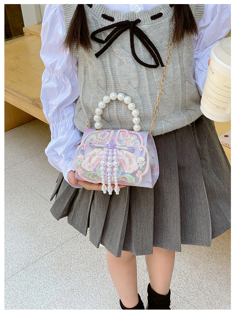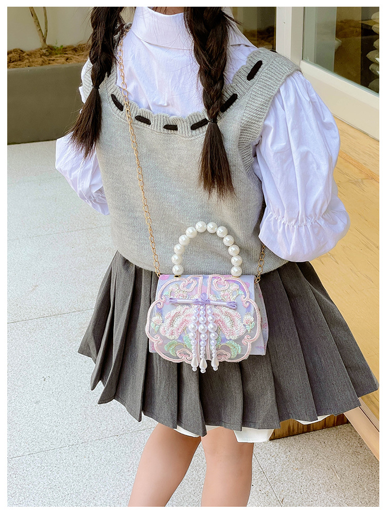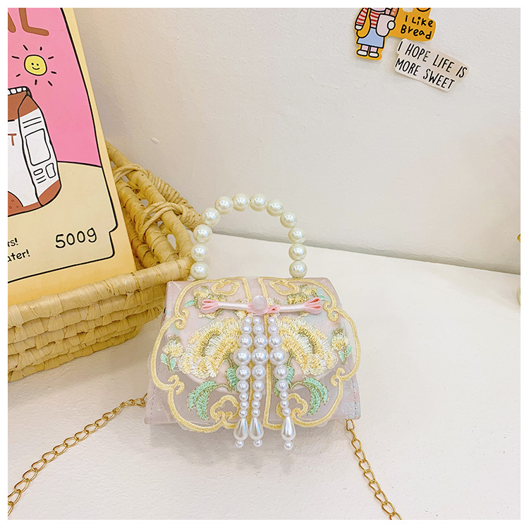 고풍스러운 자수 소녀 숄더백 신상 진주 장식 어린이 핸드백 외출용 체인 아기 크로스백