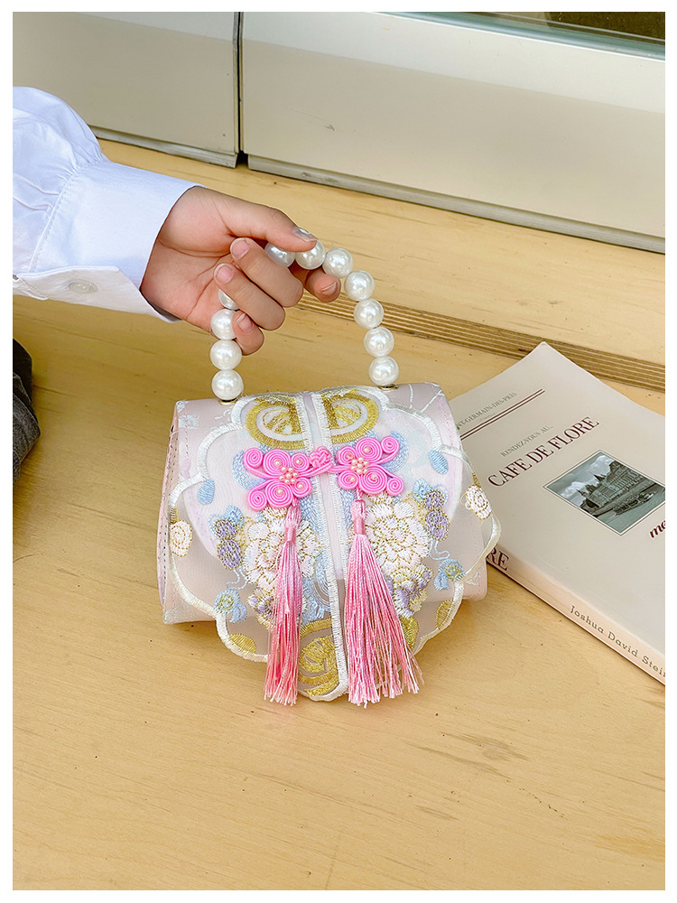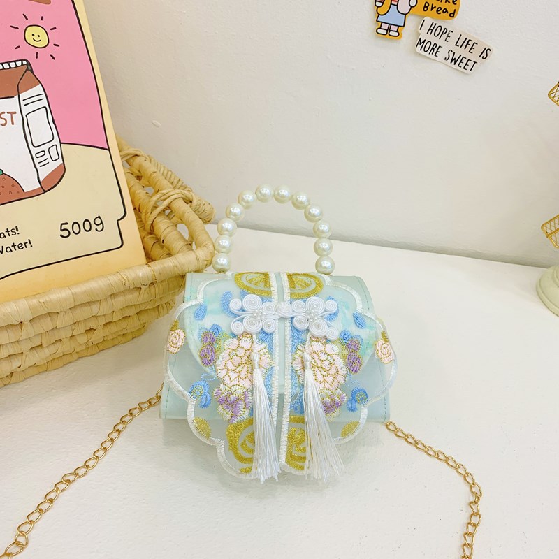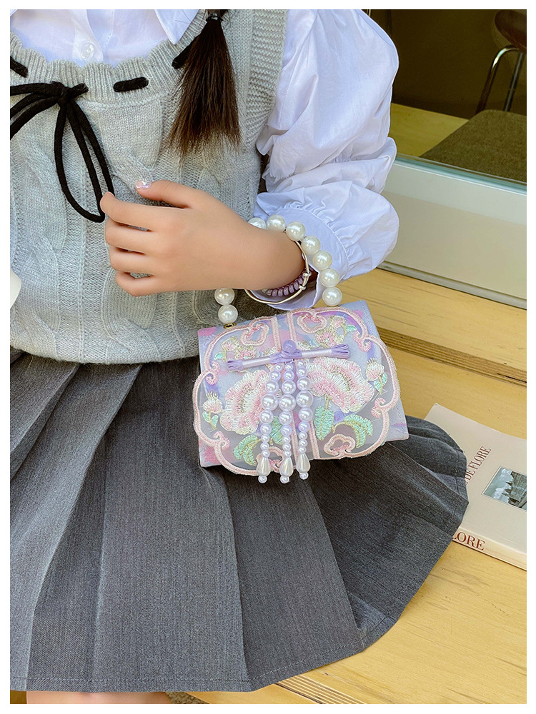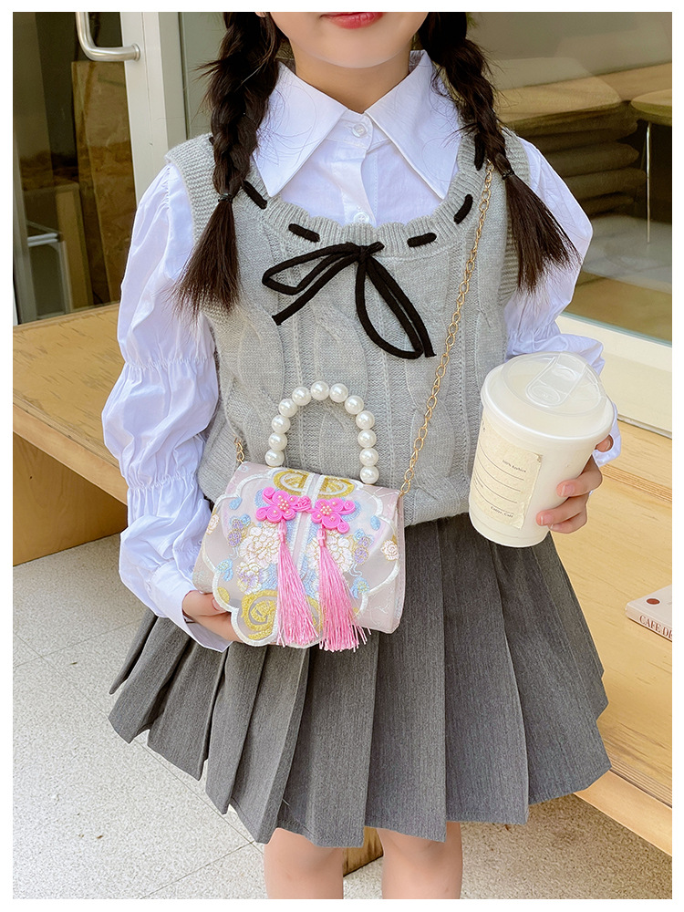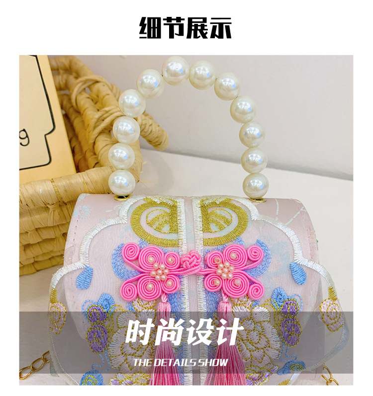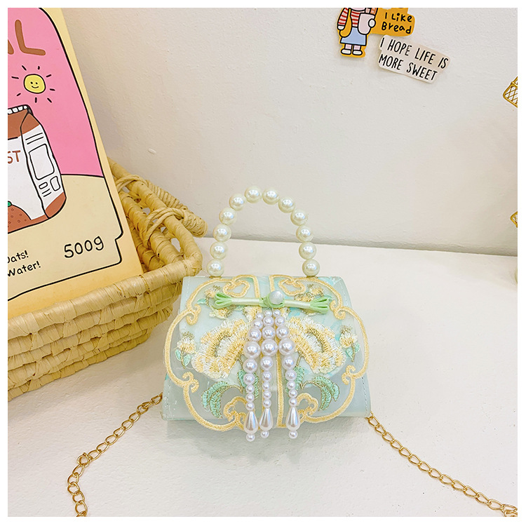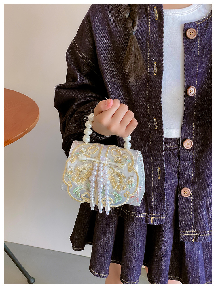 고풍스러운 자수 소녀 숄더백 신상 진주 장식 어린이 핸드백 외출용 체인 아기 크로스백
