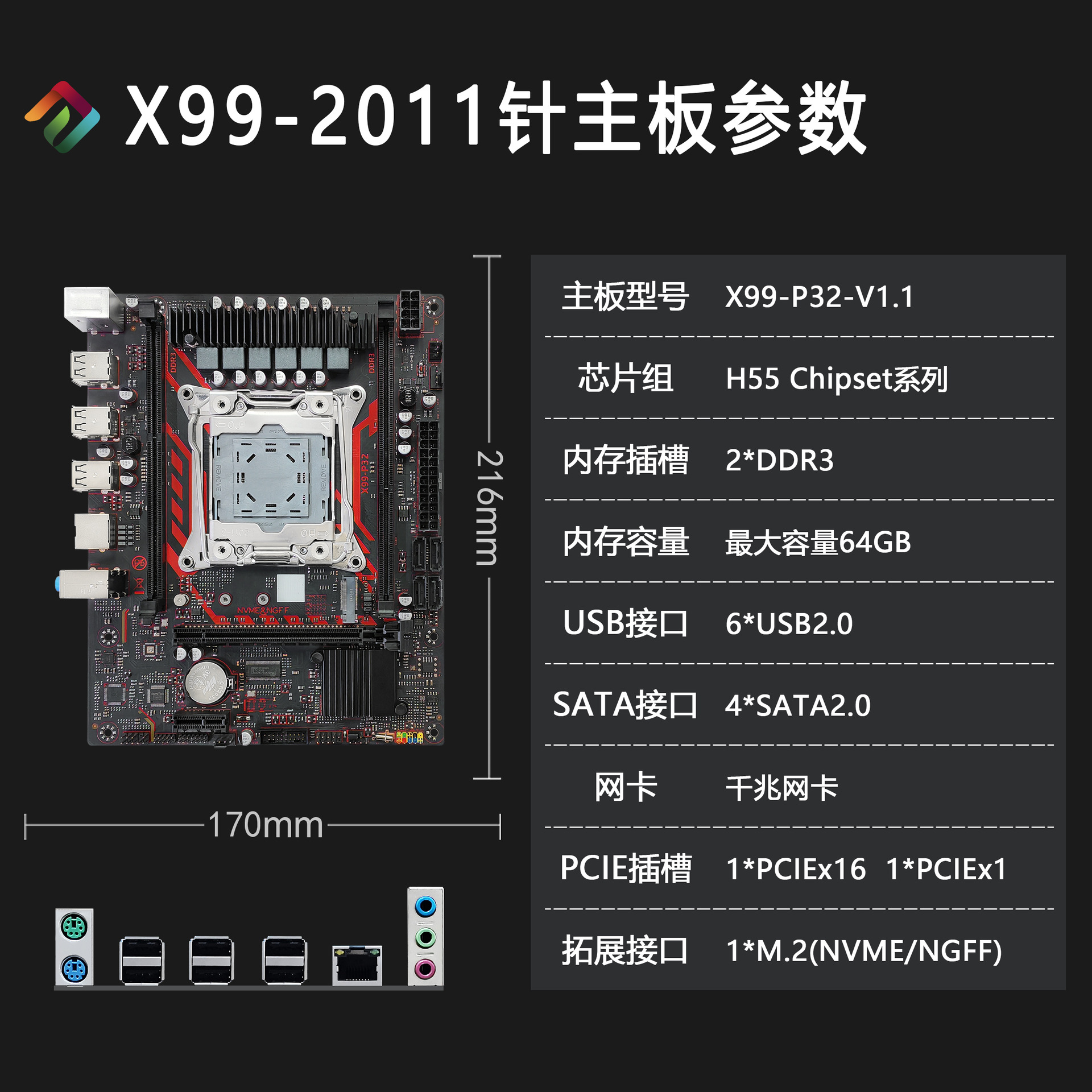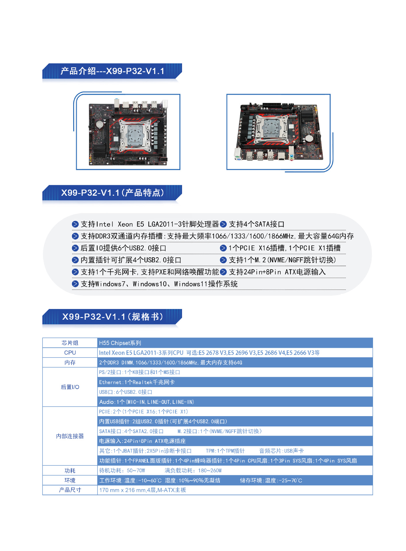 새로운 X99 마더보드 LGA2011-3핀 DDR3 듀얼 슬롯 X99-P32-V1.1 데스크탑 컴퓨터