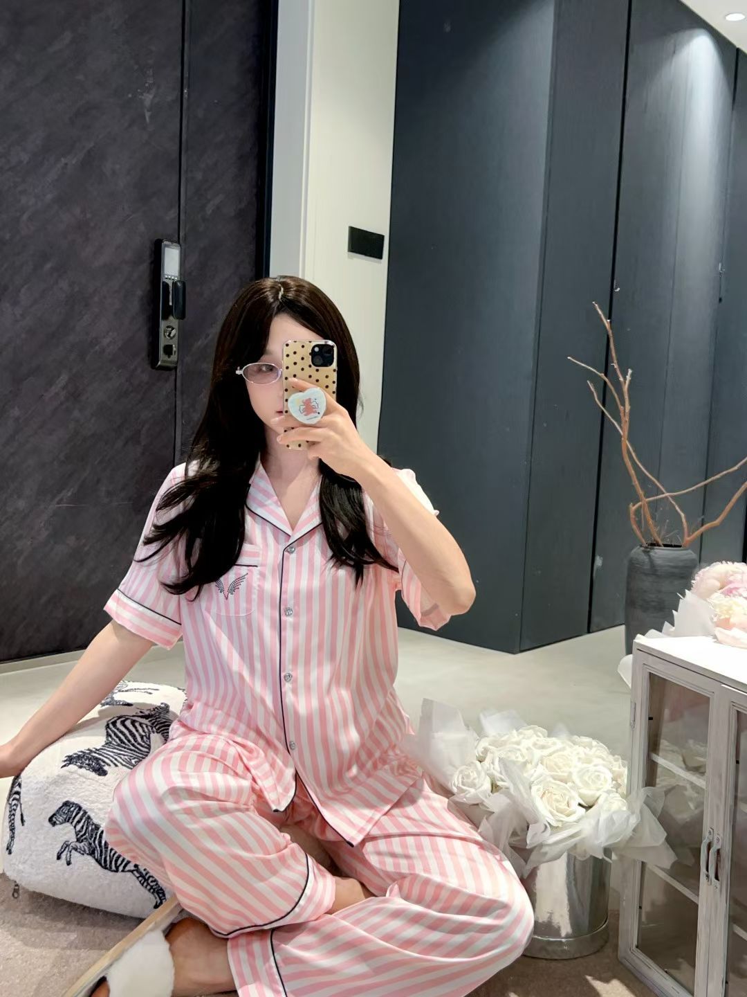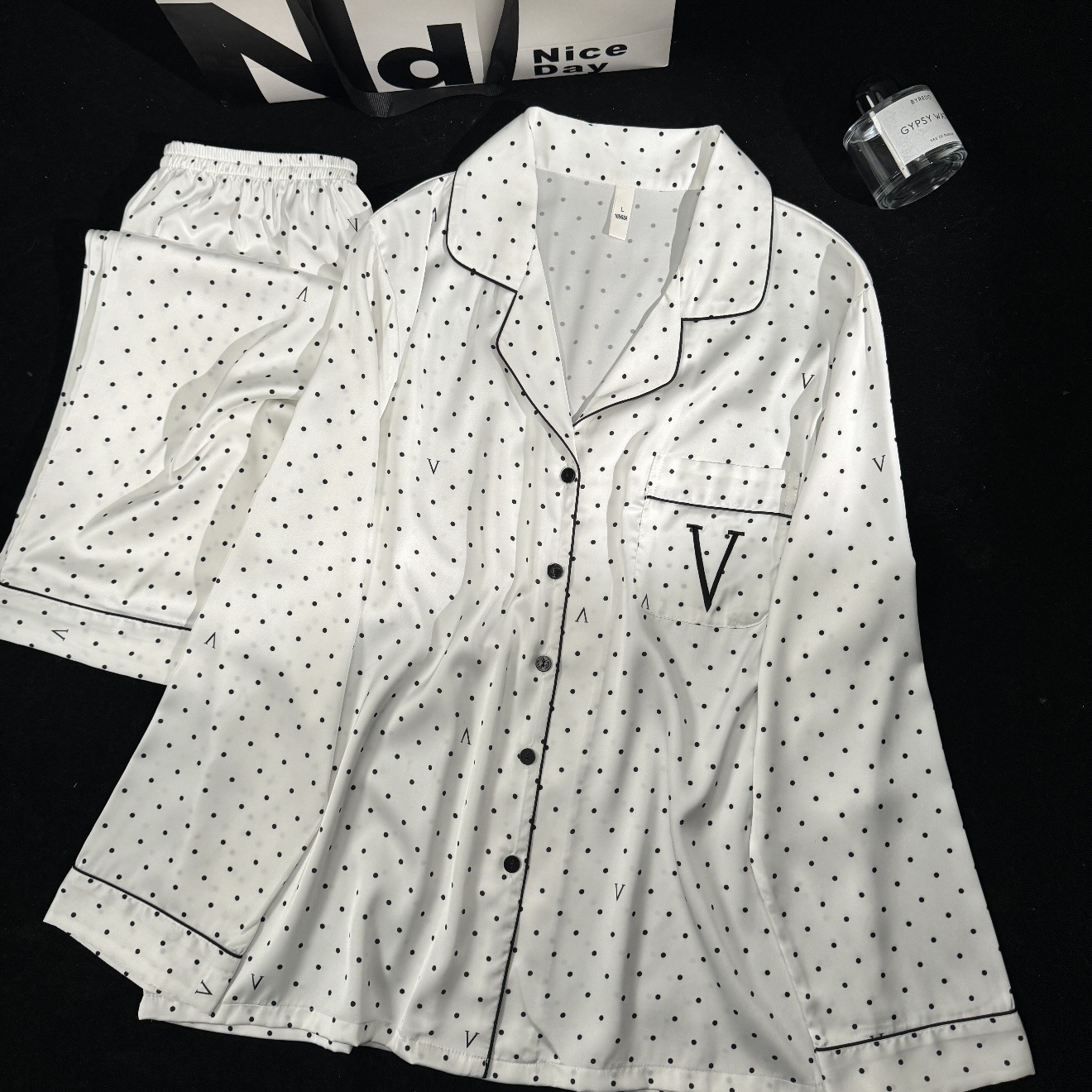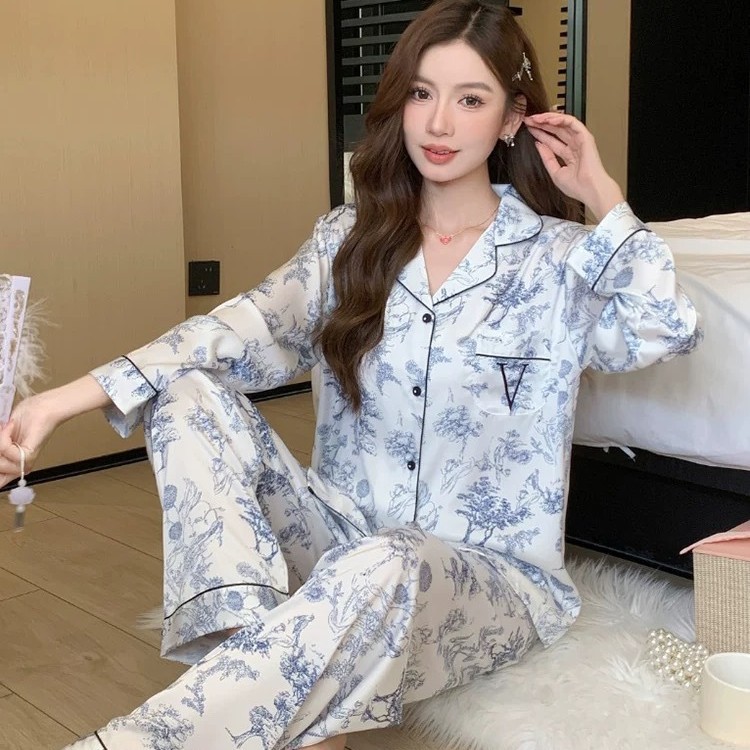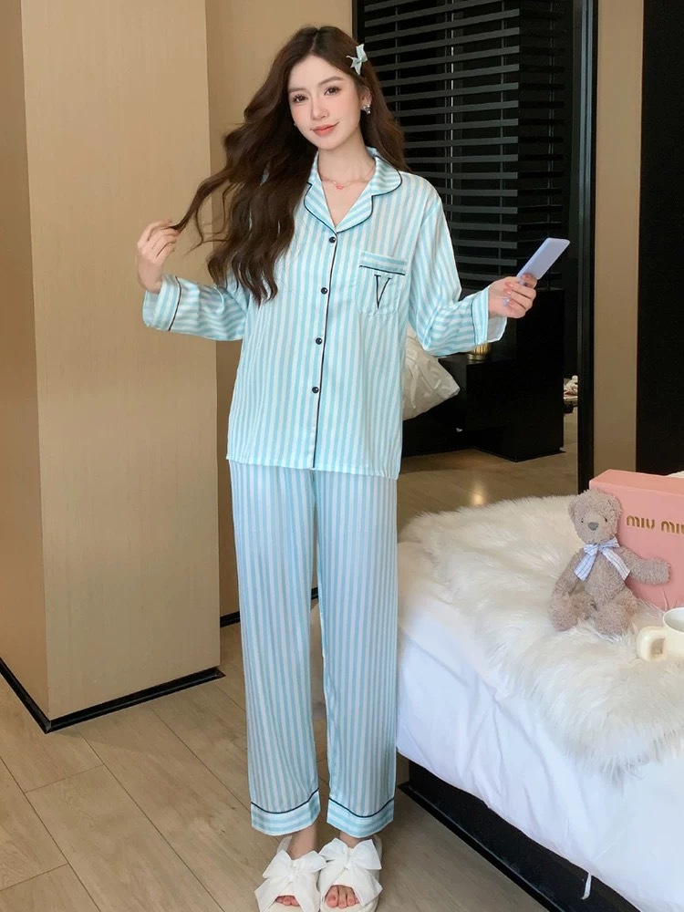 라이트 파우더 리본 vs 워터 실크 아이스 실크 파자마 여성 봄과 가을 하이 엔드 긴팔 홈 의류 세트 비밀 같은 스타일스토어 가기