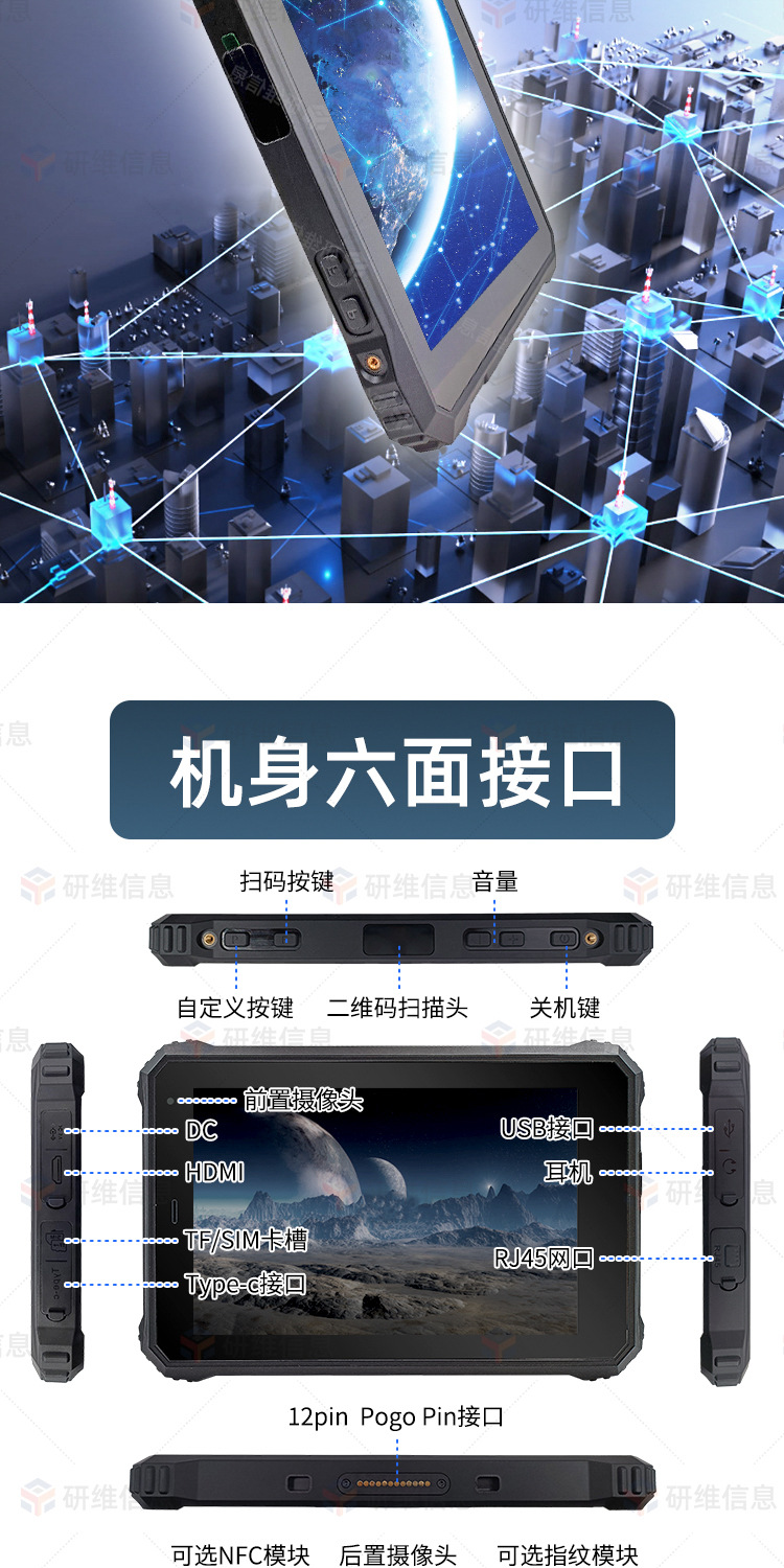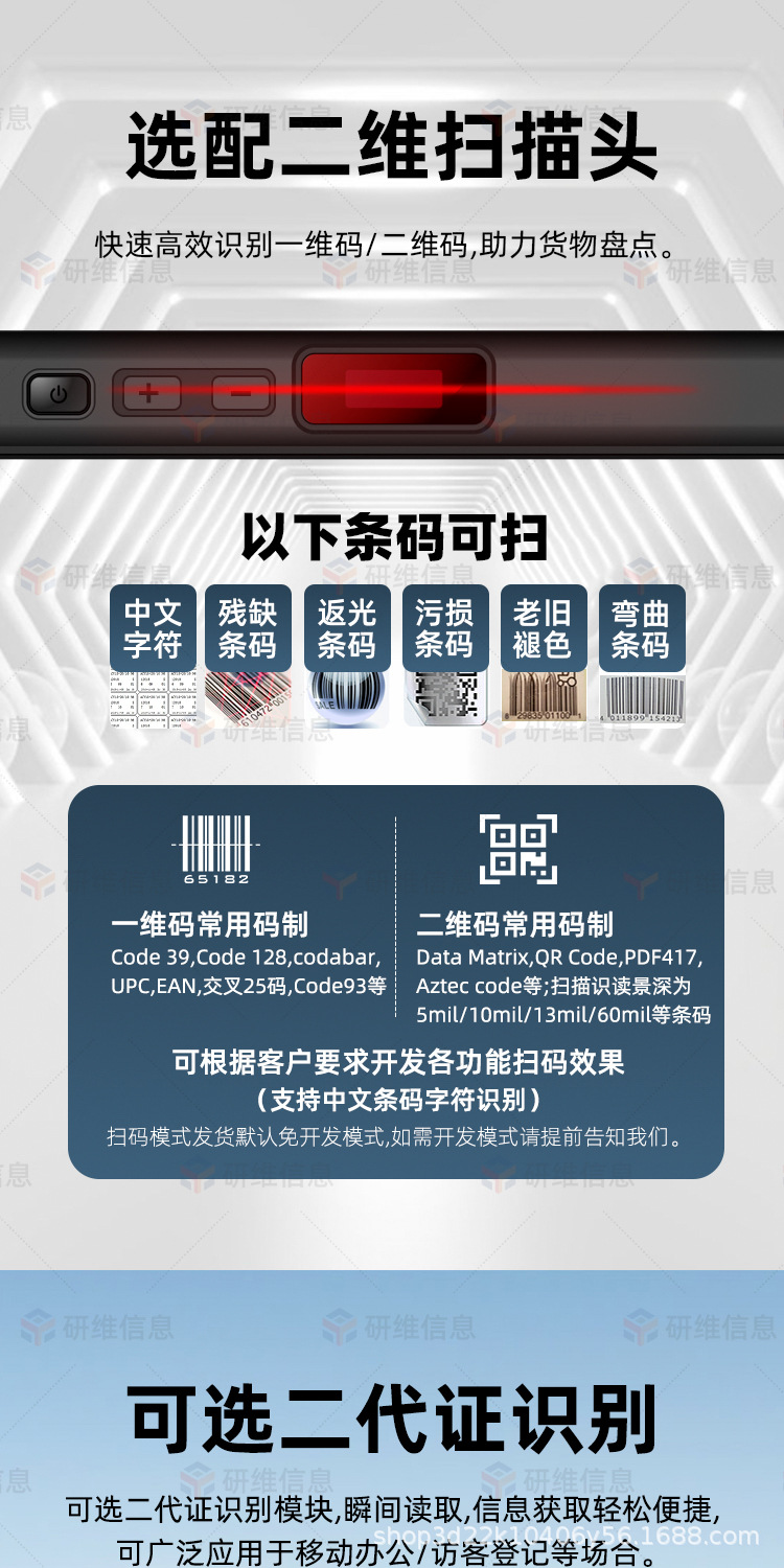 4:额外付费定制硬件项目包含:扫描头、低频/高频/超高频RFID、航插接口、二代证识别、CAN接口、433lora模块、航插接口、zigbee、客供模块内置等;如您有定制需求,可联系研维在线客服,详细了解研维10年来为众多工业领域用户定制相关案例展示。