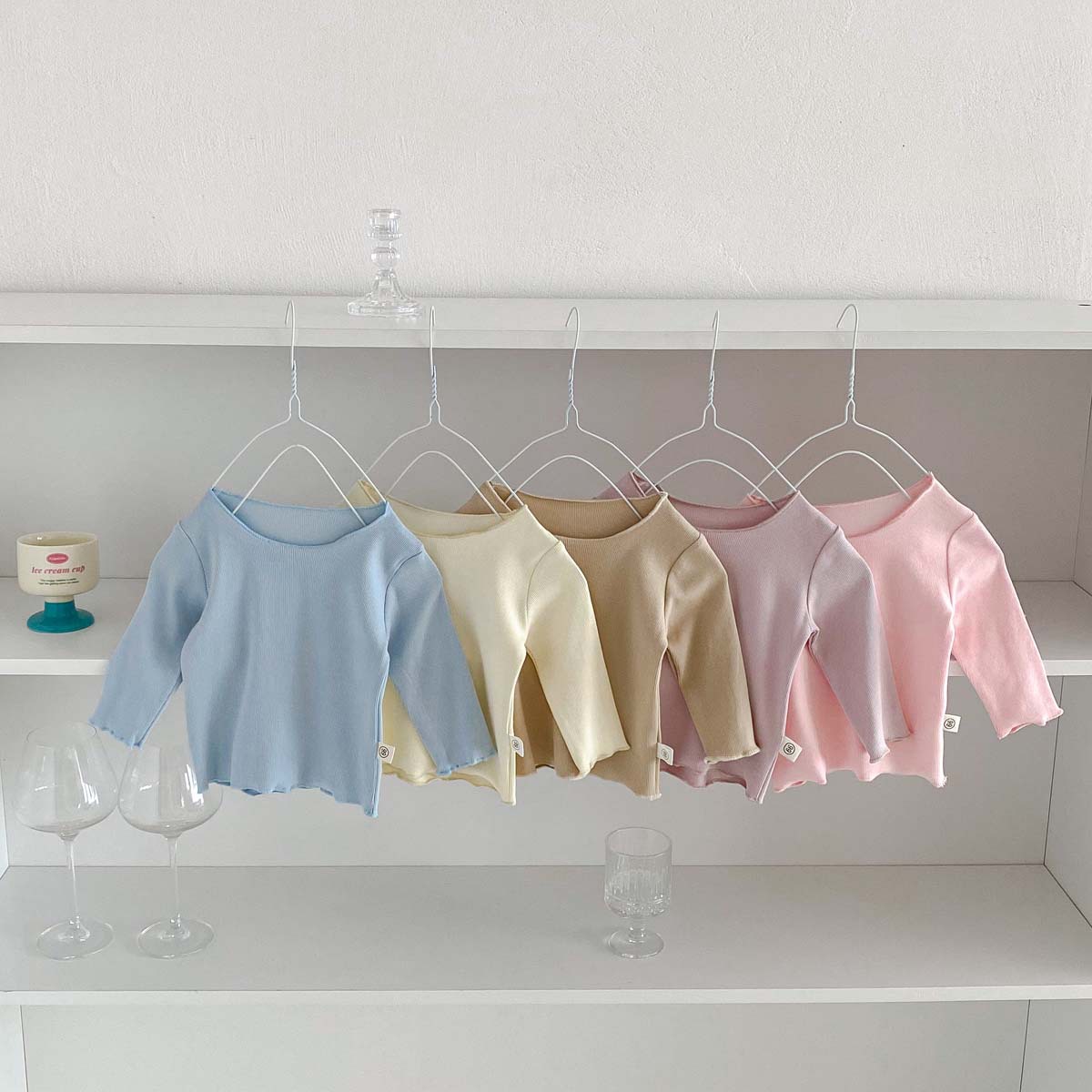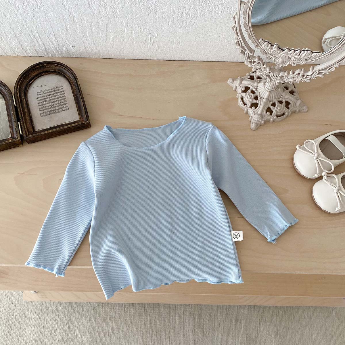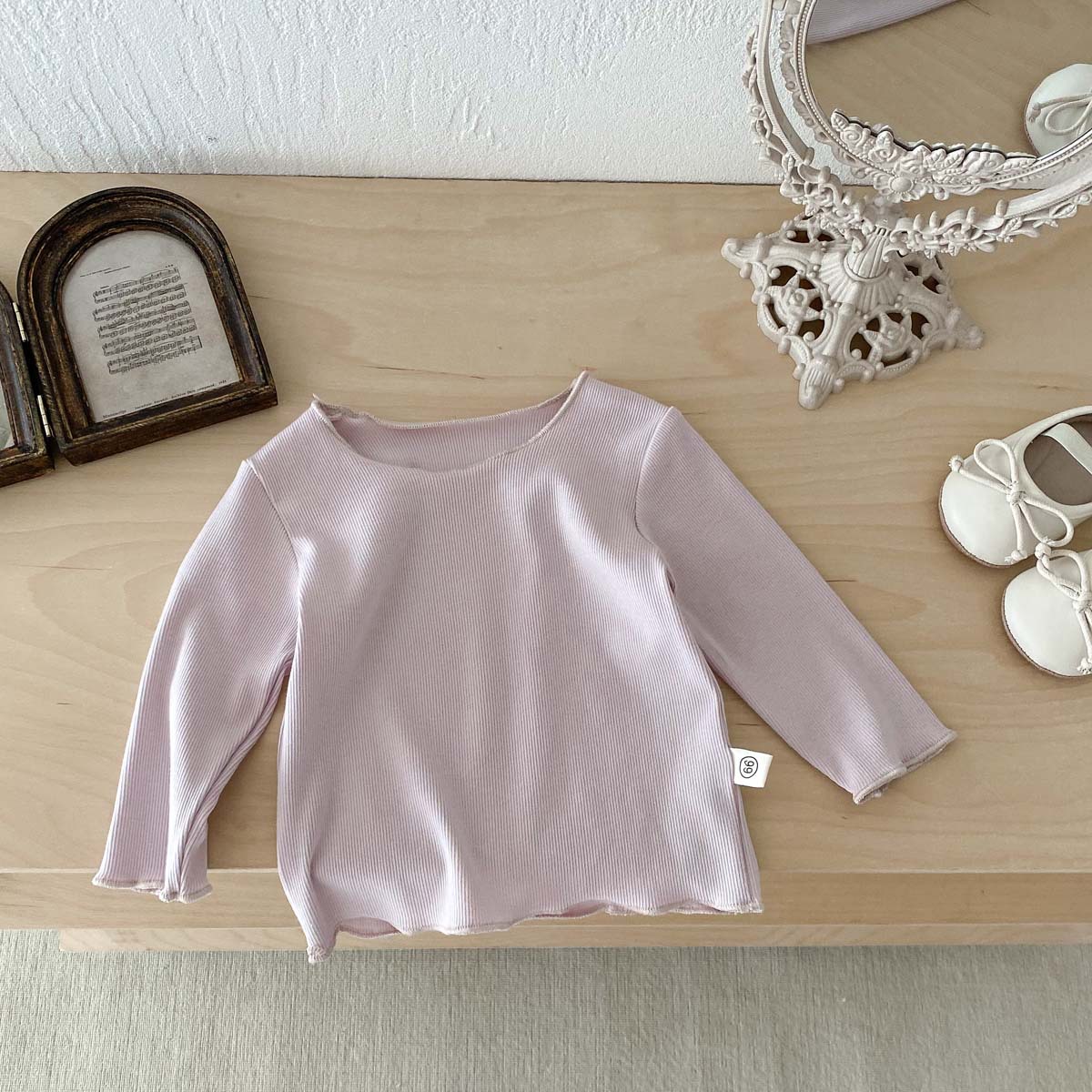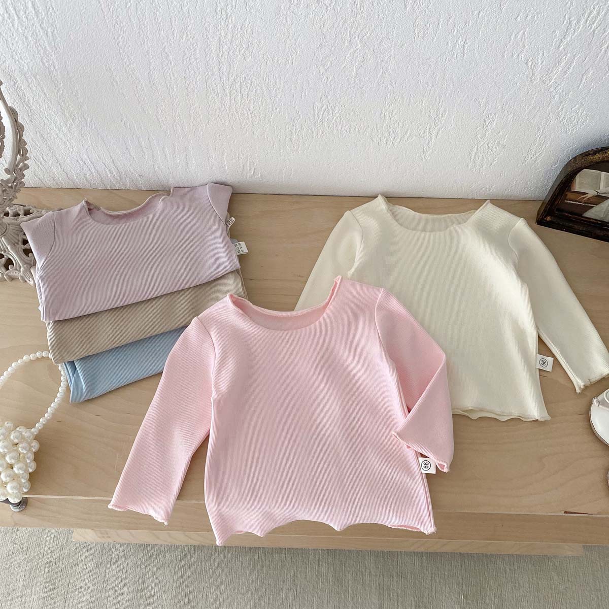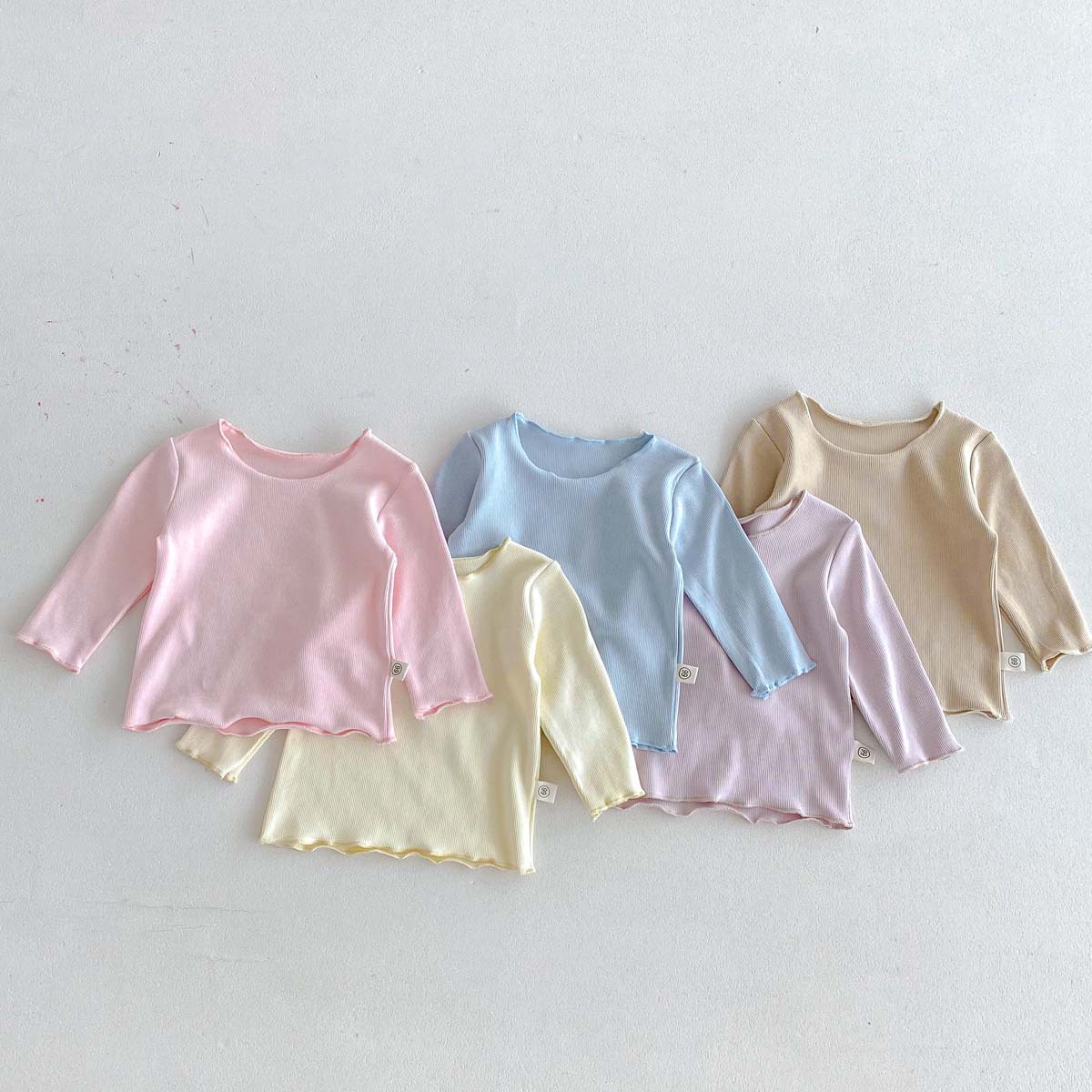 여아 의류 봄 신상품 0-2세 아기 단색 긴팔 티셔츠 유아용 패셔너블하고 다용도인 러플 밑단 이너웨어스토어 가기