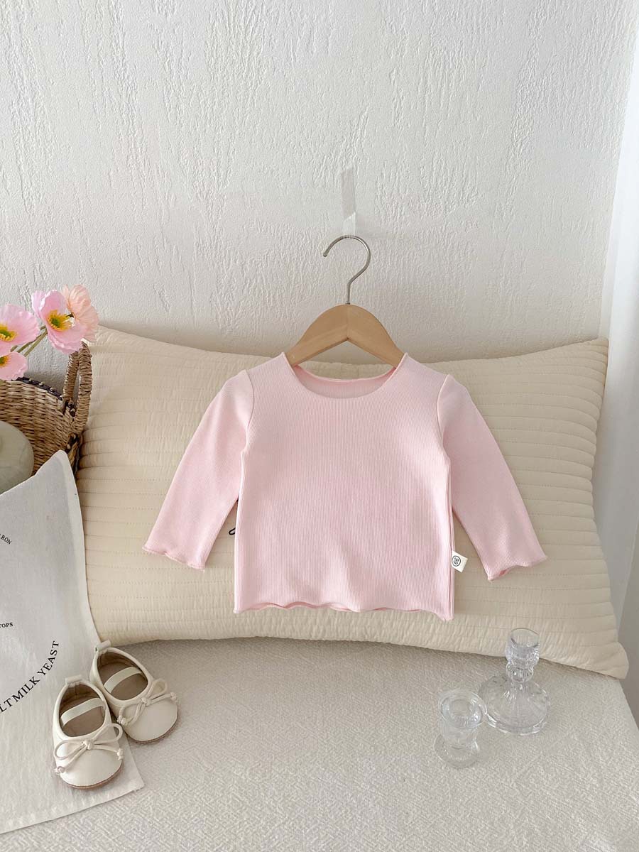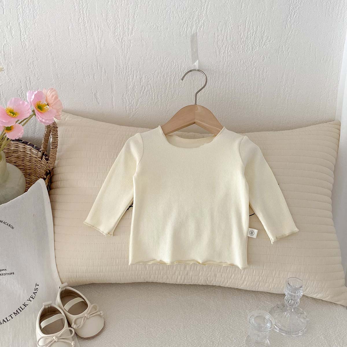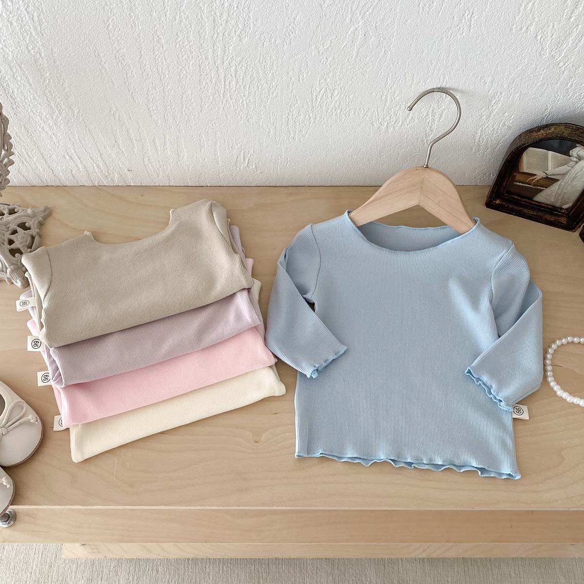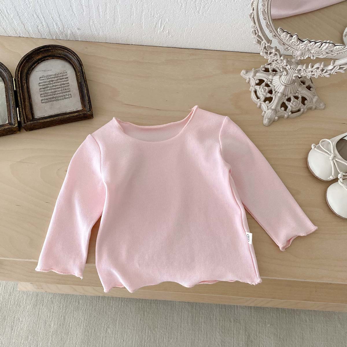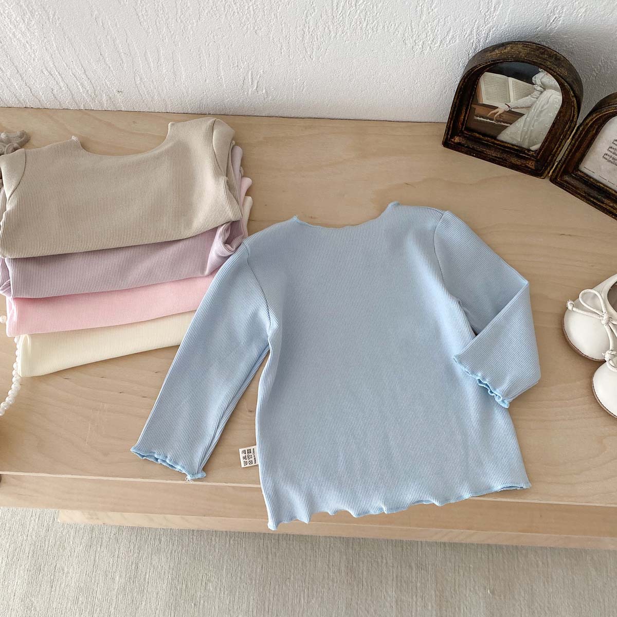 여아 의류 봄 신상품 0-2세 아기 단색 긴팔 티셔츠 유아용 패셔너블하고 다용도인 러플 밑단 이너웨어스토어 가기