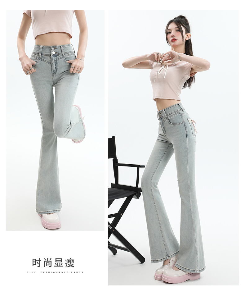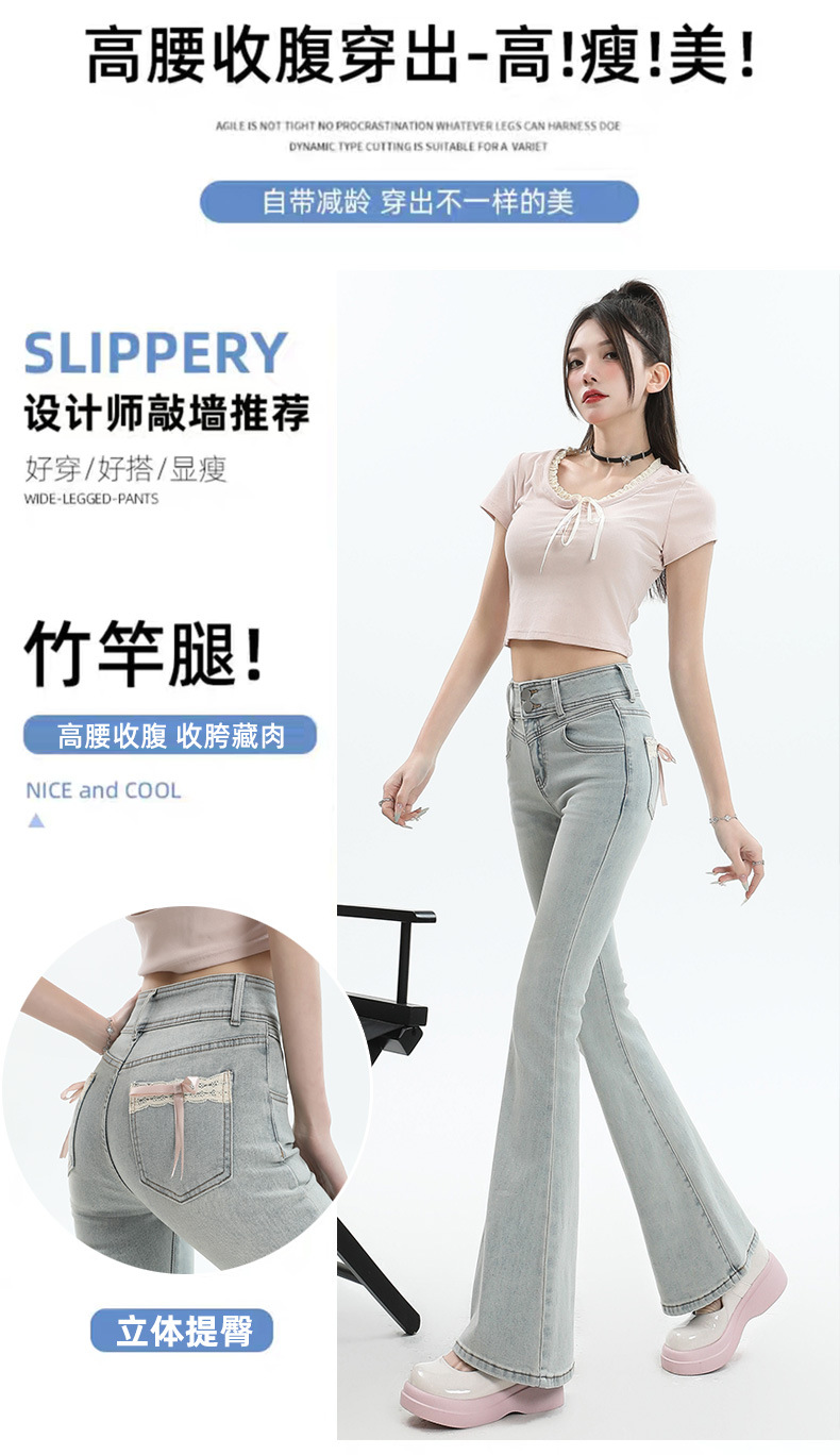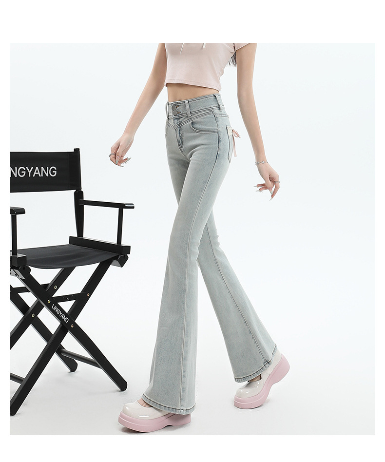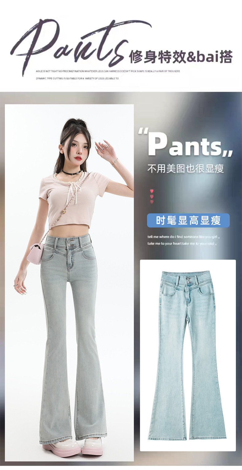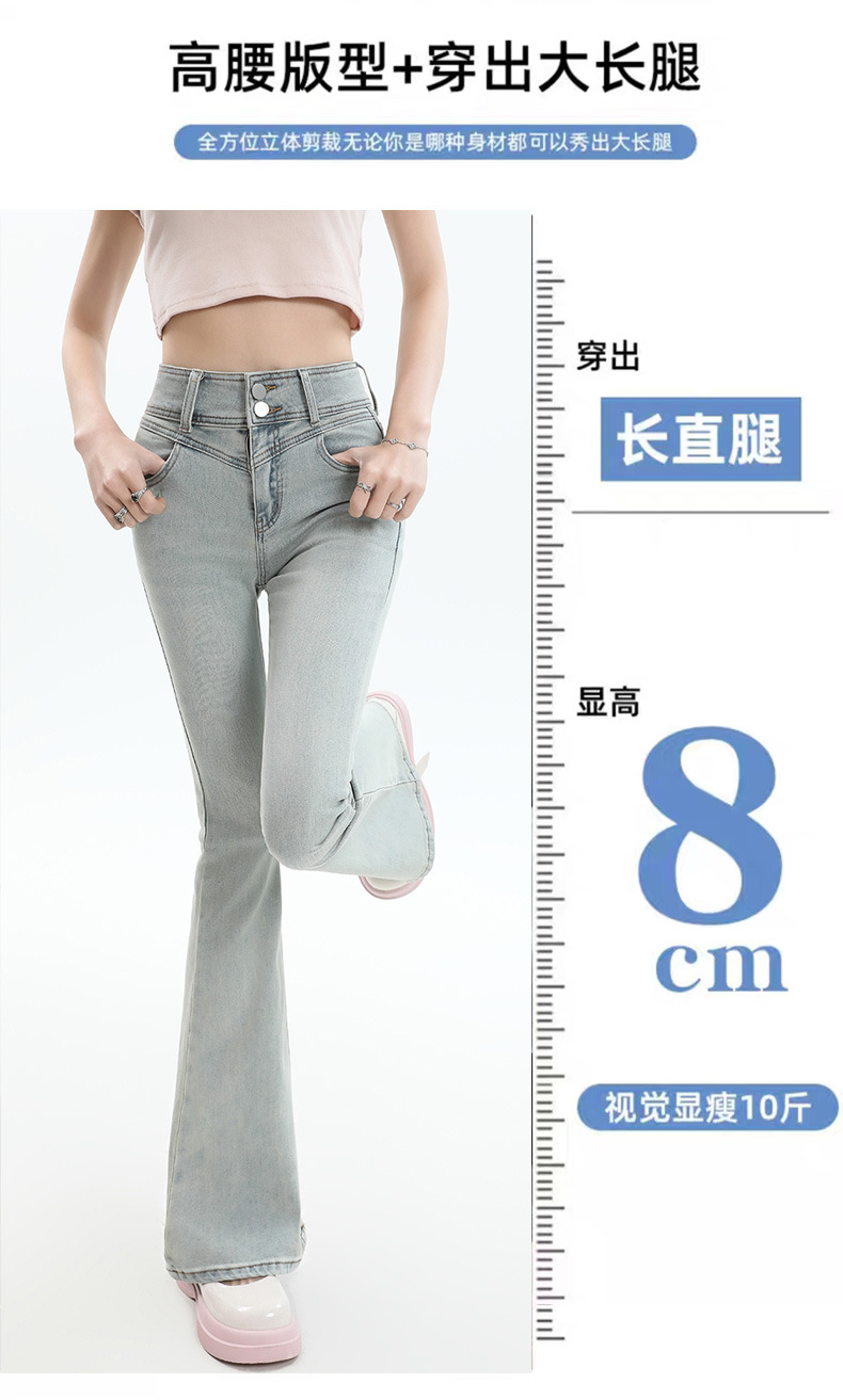 라이트 블루 마이크로 플레어 청바지 여성의 가을 2024 새로운 높은 허리 슬리밍 디자인 핫 소녀 플레어 바지스토어 가기