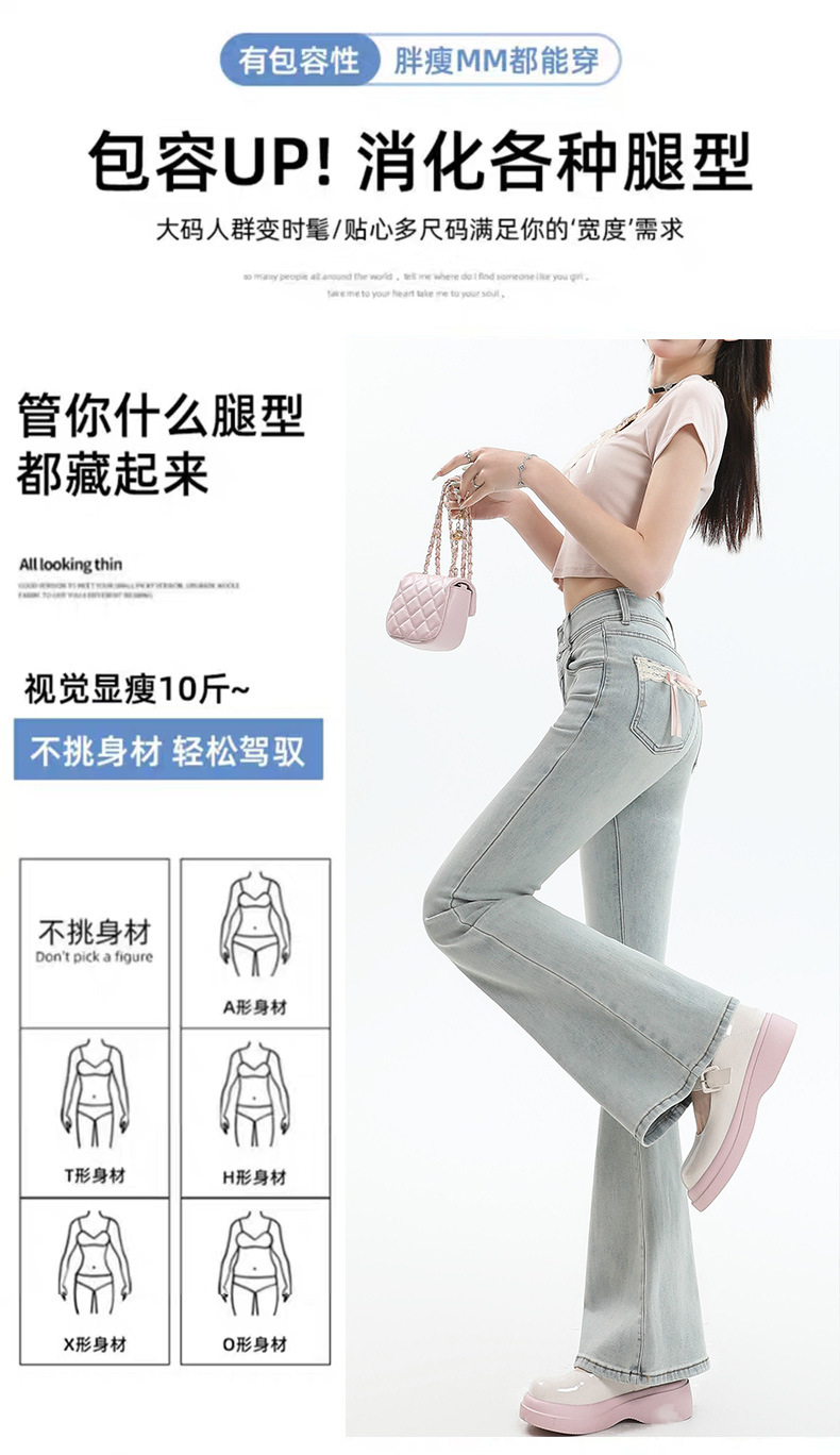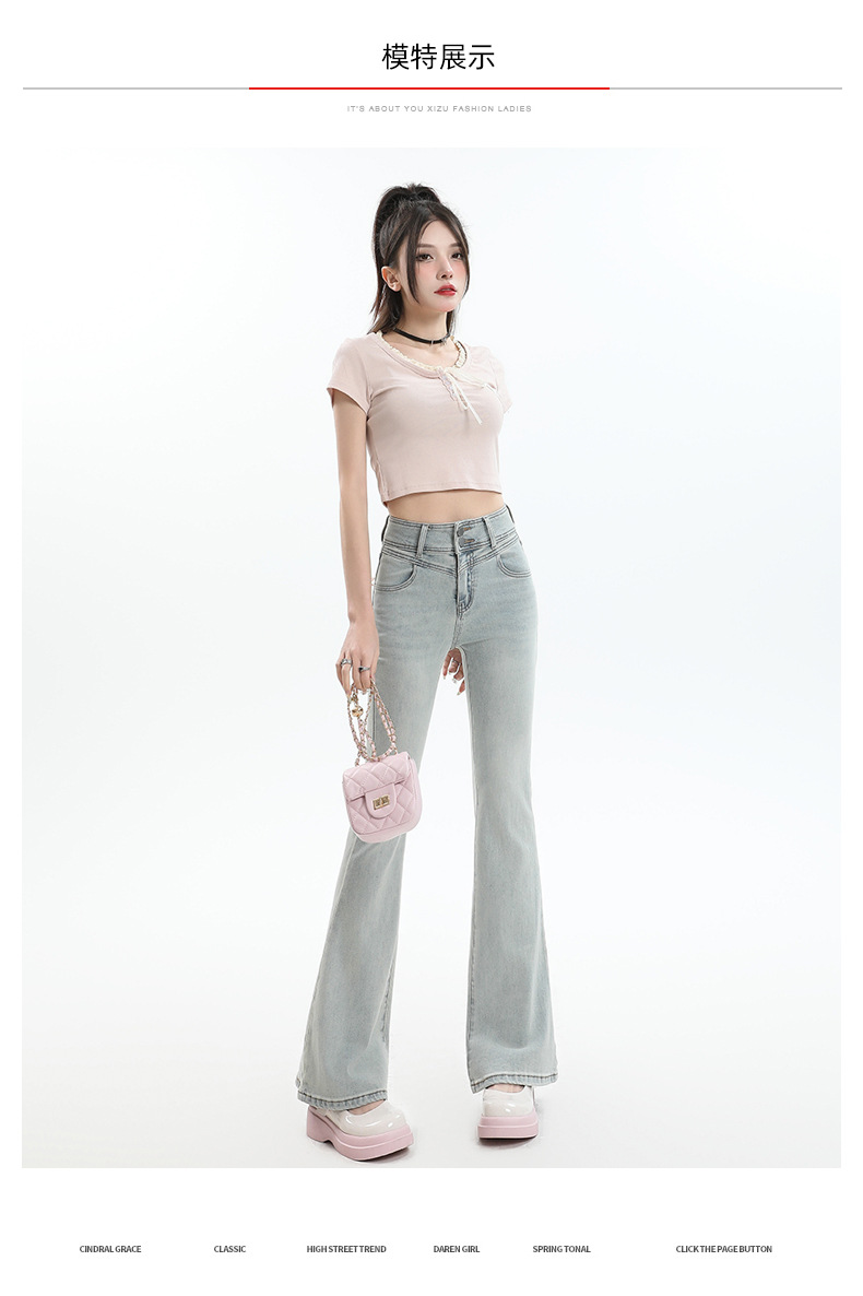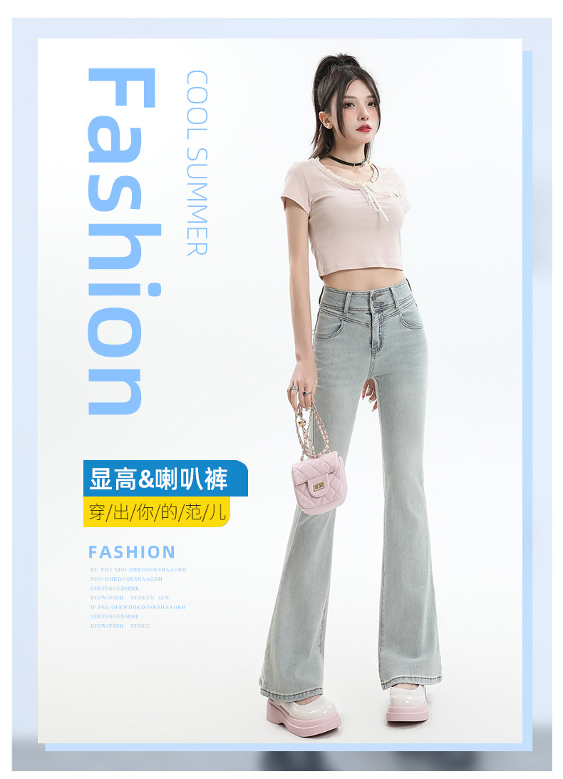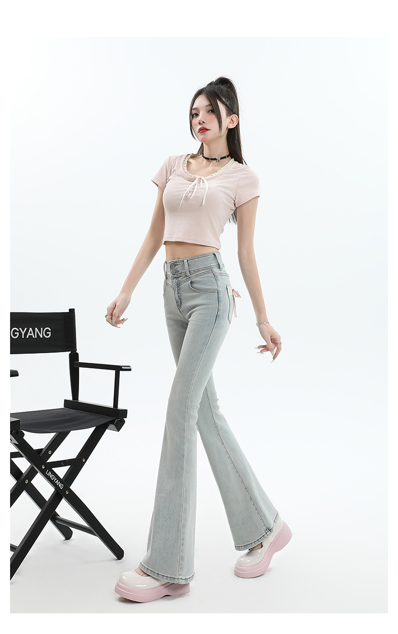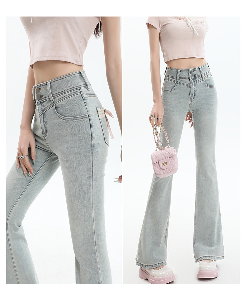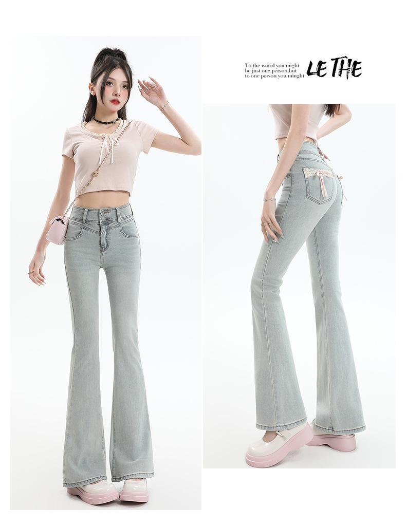 라이트 블루 마이크로 플레어 청바지 여성의 가을 2024 새로운 높은 허리 슬리밍 디자인 핫 소녀 플레어 바지스토어 가기