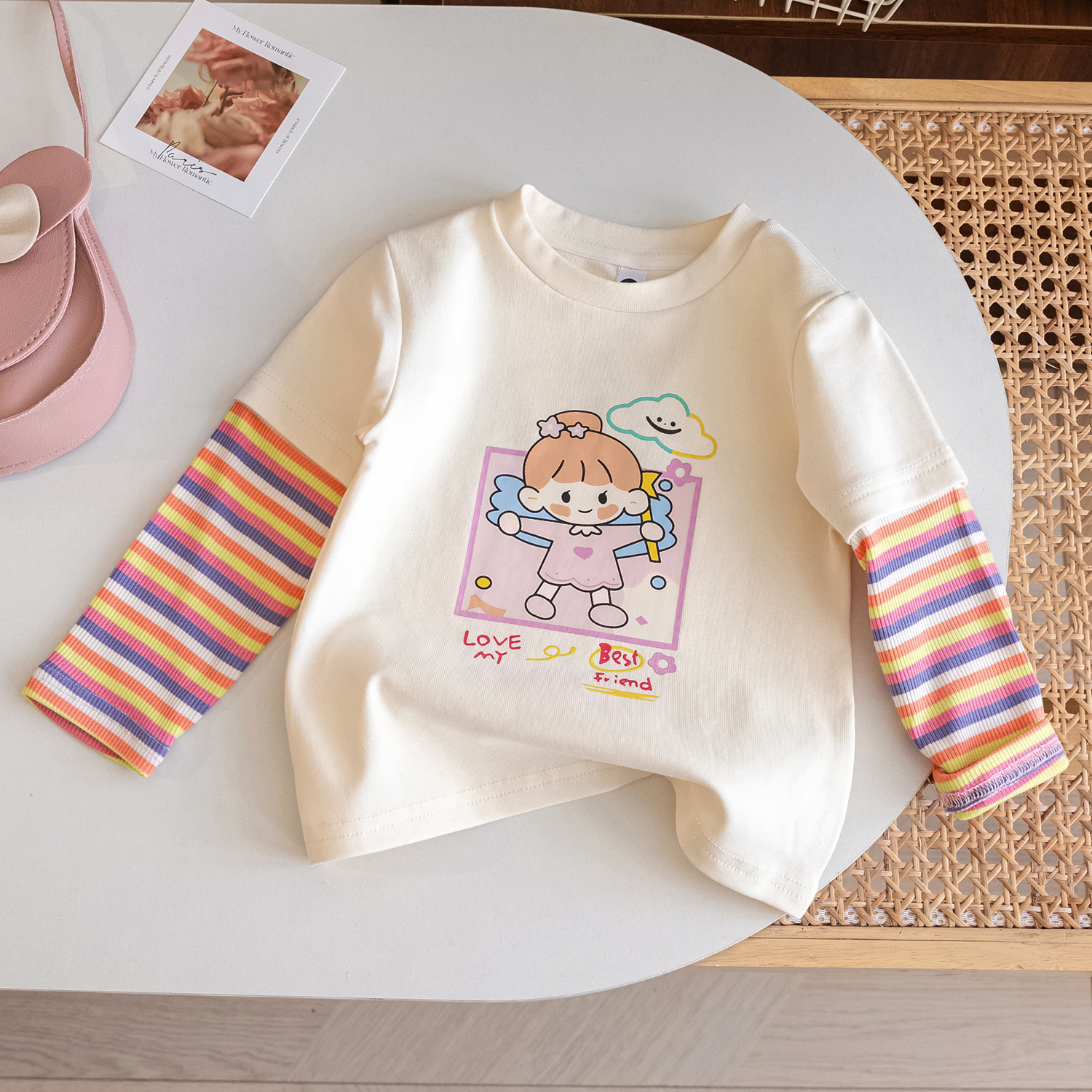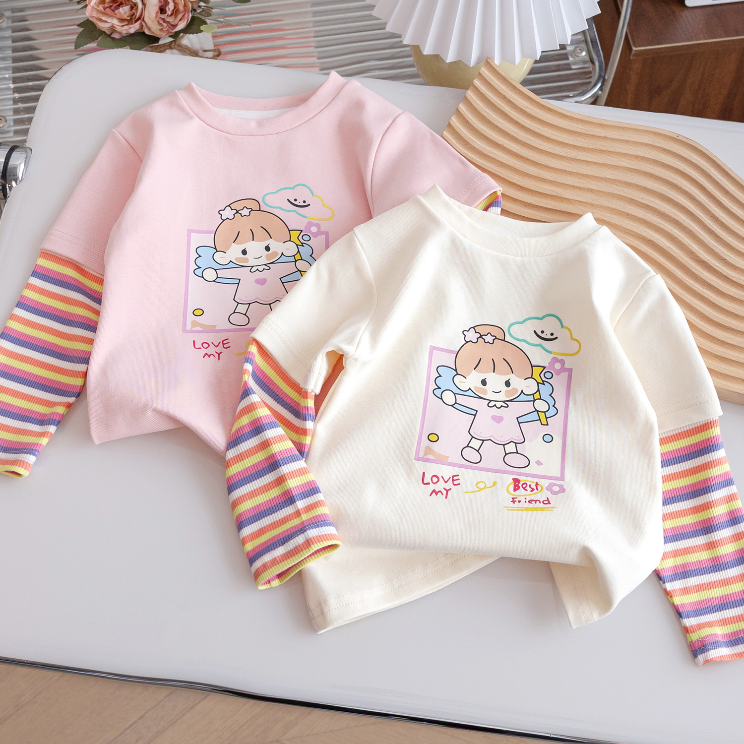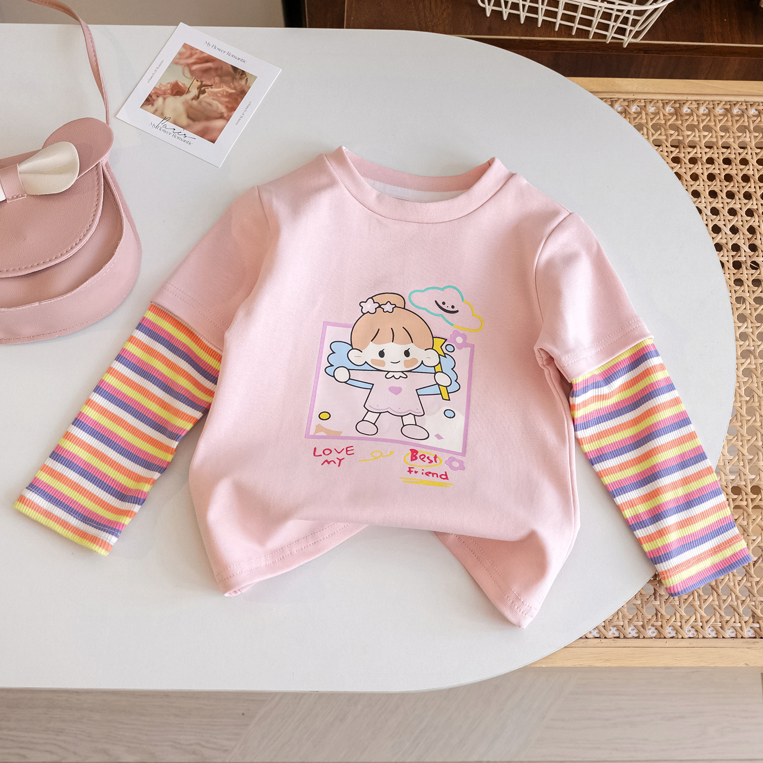 소녀 면 긴팔 티셔츠 가을 만화 탑 중소형 어린이 봄과 가을 여성 아기의 줄무늬 바느질베이스 셔츠 3